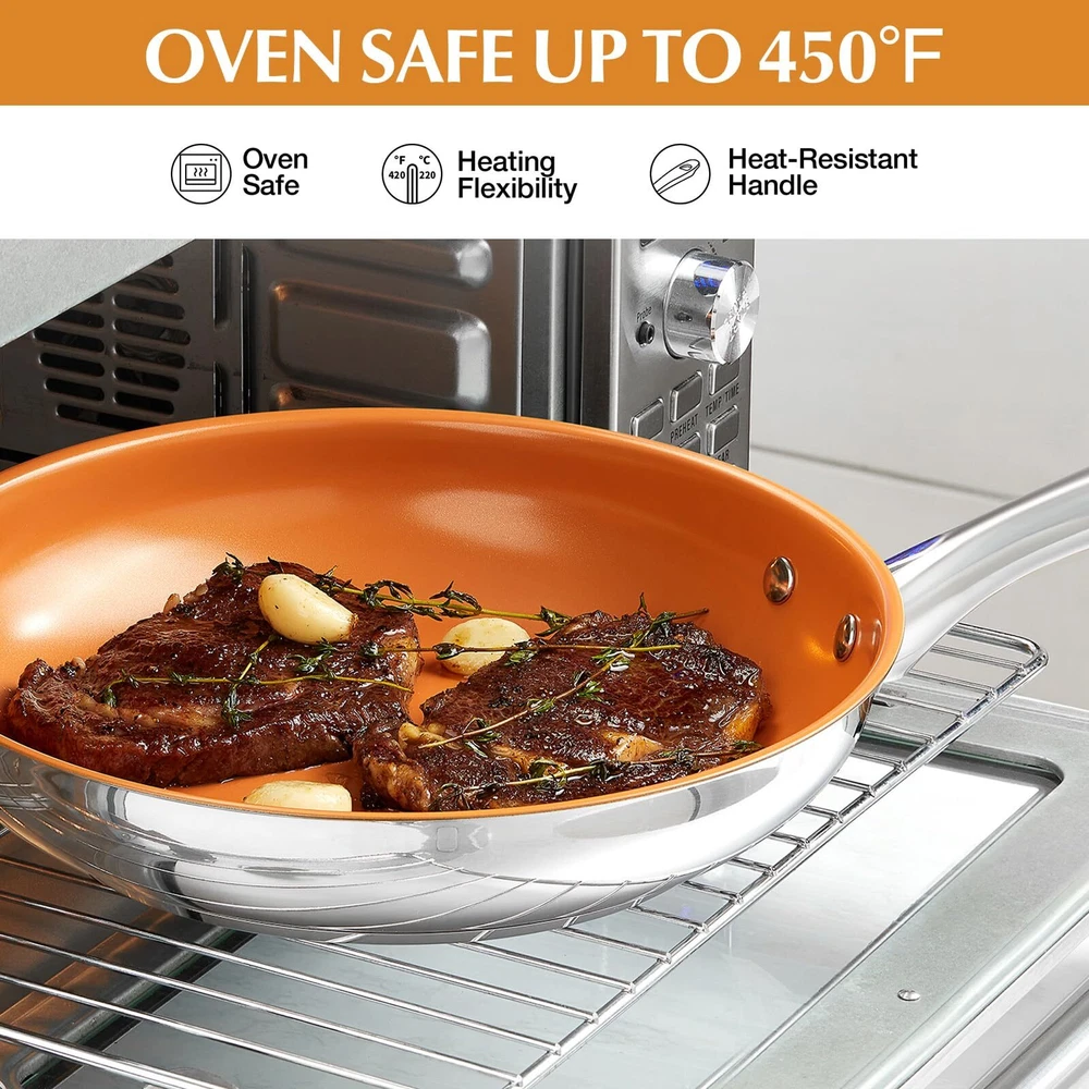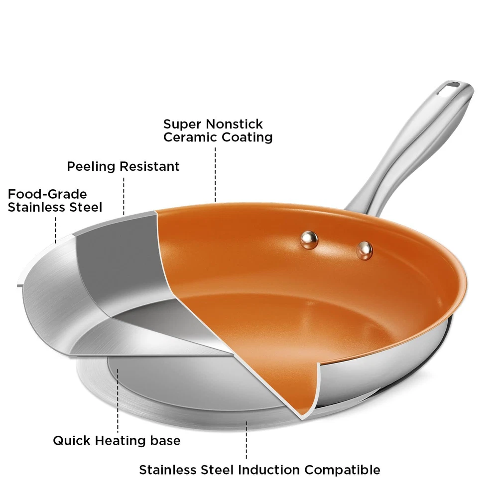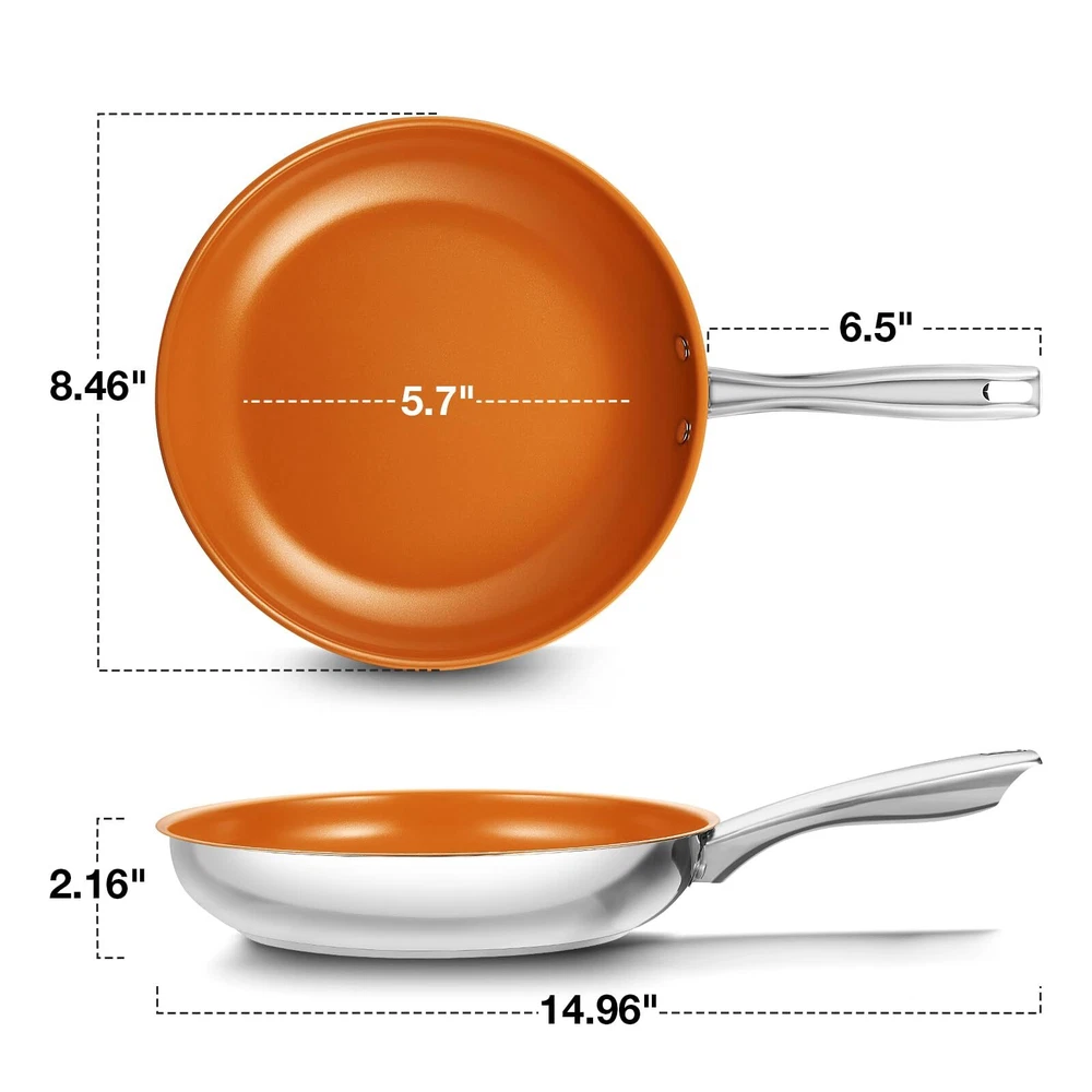 SUPERIOR NONSTICK CERAMIC COATING: Experience effortless food release and healthier cooking with our premium ceramic coating of the stainless steel pan. Enjoy smokeless cooking and convenience, all while using a PTFE, PFOA, and PFAS-free, non-toxic surface. HIGH-QUALITY STAINLESS STEEL: Crafted from premium stainless steel, this 8 inch frying pan guarantees outstanding heat conductivity and consistent cooking results, so you can serve perfectly cooked dishes every time. FAST & EVEN HEATING: Featuring an aluminum core, this stainless steel frying pan heats quickly and saves energy. The durable base of this stainless steel skillet ensures even heat distribution and excellent heat retention for perfectly cooked meals every time. TRANSPARENT GLASS LID: The included transparent glass lid of stainless steel frying pan allows you to monitor your cooking without lifting the cover. This feature helps retain heat and moisture while ensuring your meals are cooked to perfection. VERSATILE COOKING OPTIONS: Ideal for frying, sautéing, and searing, this 8 inch skillet is compatible with any stovetop, especially induction. The versatility of the Stainless steel pan with lid makes it an essential addition to any kitchen. EFFORTLESS CLEANUP: Thanks to the superior nonstick surface of the stainless steel pan, cleaning is a breeze. Simply rinse with soapy water or wipe with a sponge to remove any residue, making your cooking experience quicker and easier.