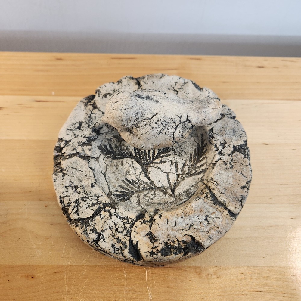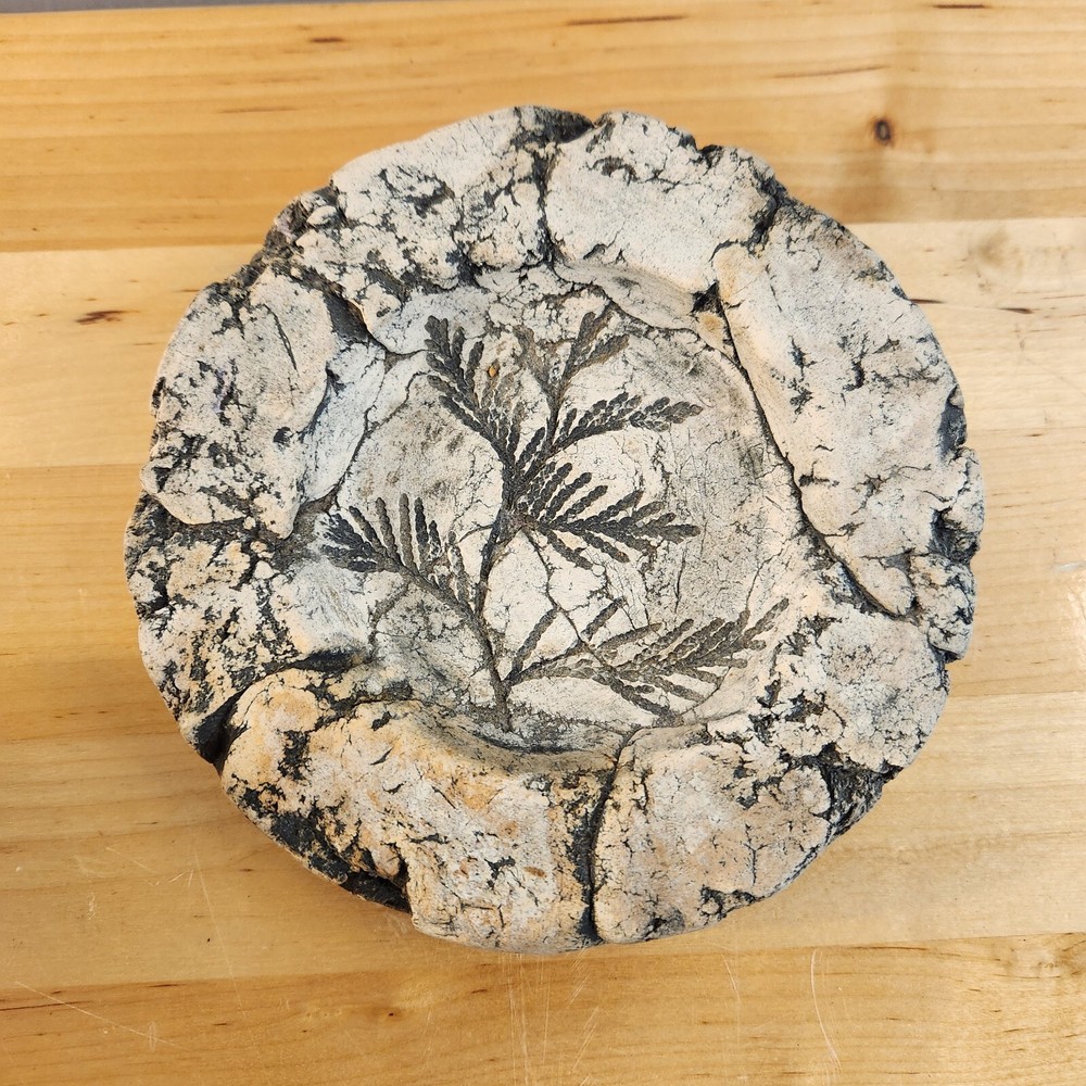 This dish has unique, natural ridges that make it one of a kind. A small fern was pressed into the center to leave a lasting, fossil-esque impression to further tie this piece of art back to its roots from the clay in Washington. While working as a logger, Stan Langtwait molded figures out of mud and clay. He made birds and animals and more. He then placed these shapes on tree stumps to dry and collected them at the end of the day. Starting in the 1950s, he created pottery known as "Shapes of Clay" at his factory in Graham, WA. After the eruption of Mount St. Helens in 1980, Stan incorporated ash from the mountain into his statues.