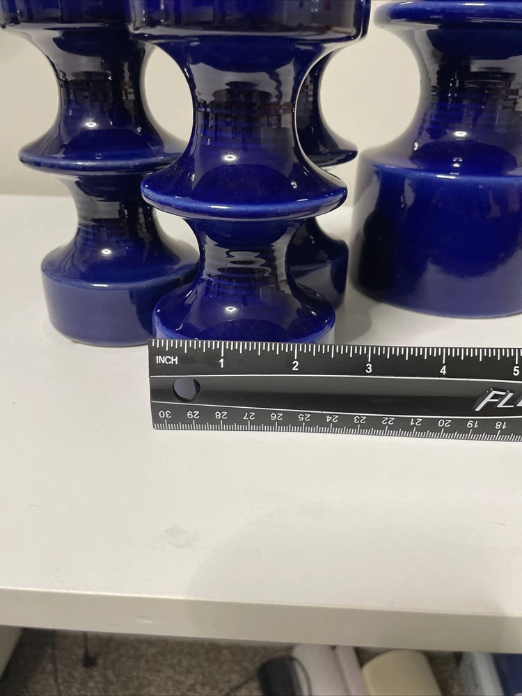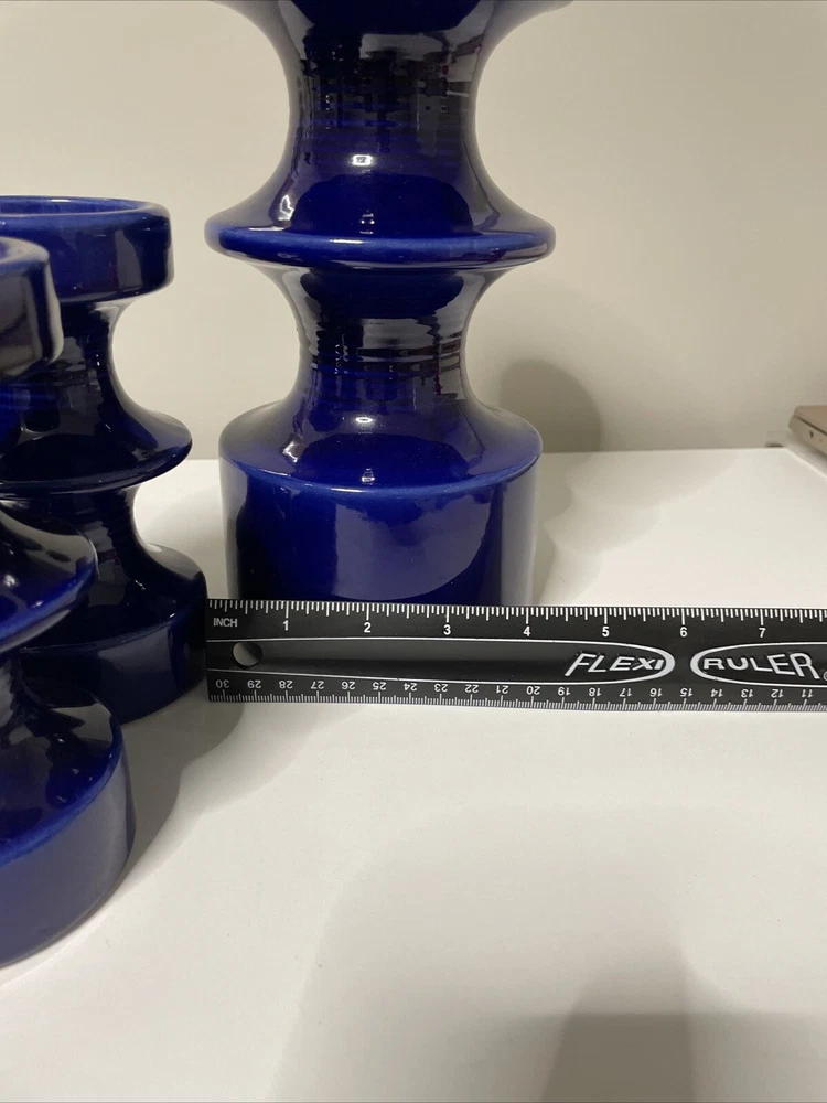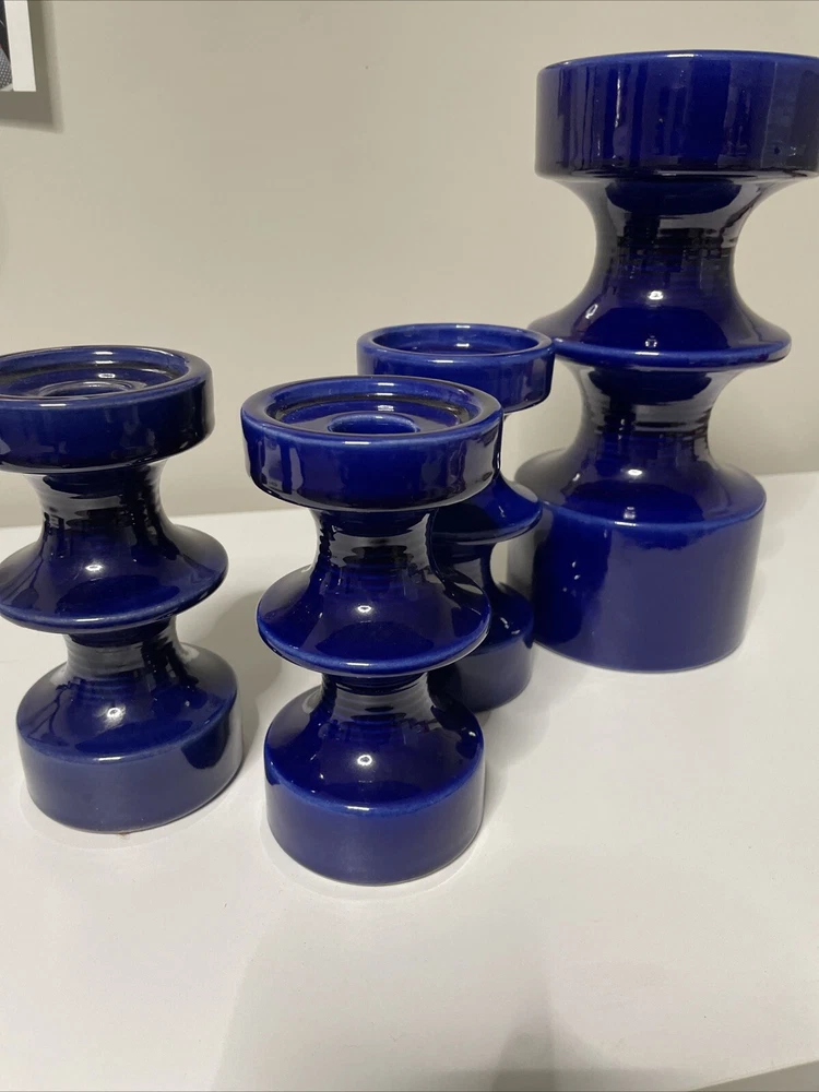 Add a touch of elegance to your home decor with this Steuler 4 Piece Blue Candleholder Set. Crafted in Germany, these candle holders are perfect for all occasions. The set includes one 9 3/4” candle holder, and 3 6” candle holders with a beautiful blue finish. Made by the renowned brand Steuler, these candle holders are a great addition to any collection. They are perfect for decorating your dining table, living room, or even your office. Get this exquisite set today and add a touch of sophistication to your home. See my other items listed for which include other Steuler pieces in blue, red, and brown. I ship using USPS ground with insurance unless otherwise stated. Thank You for shopping !!