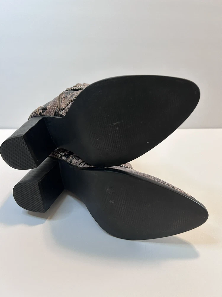Elevate your style statement with these chic Steve Madden boots. Crafted with synthetic snakeskin upper material, these low top booties feature almond toe shape and zip closure. The multicolor animal print pattern adds a touch of wildness to your wardrobe, while the high block heel measuring 3-3.9 inches gives you the perfect lift. The studded straps and accents make these boots stand out in the crowd, making them perfect for any occasion. These women's boots are available in size 7 and are sure to be a valuable addition to your shoe collection. Size 7 Zipper closure Heel around 3” Pls check left boot has some scratches on back !!!