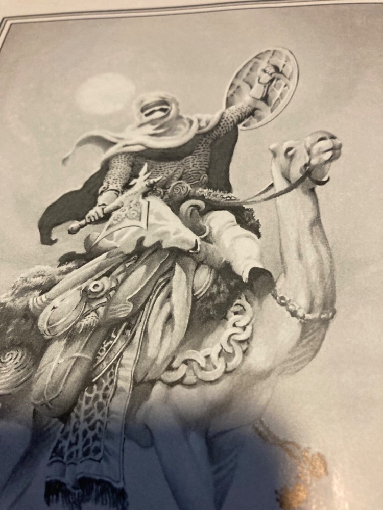 Steven E. Fabian Art print from golden blood 1982 warrior on camel with shield Steven E. Fabian amazing art prints from the many book illustrations he did over his career between 1970 and 1990. All black and white fantasy science fiction pictures with great detail. Share in his unbelievable career which lasted only 20 or so years due to his starting his art career at 37 years old.