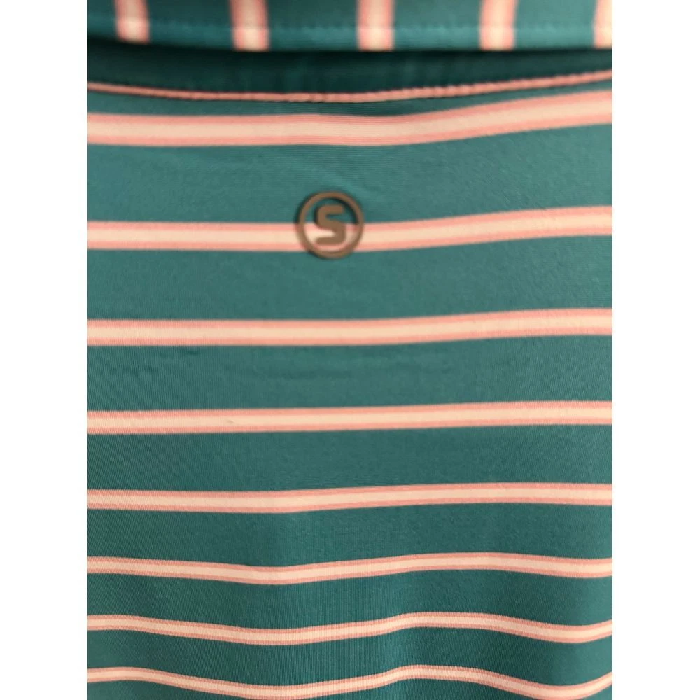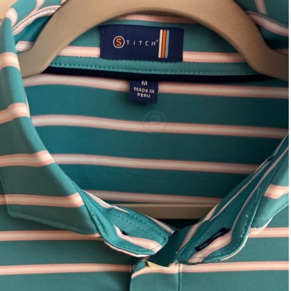Elevate your golf game with this sophisticated striped polo shirt. The moisture-wicking performance fabric keeps you cool and comfortable on the course or during any active pursuit. Perfect for golf outings, casual business meetings, weekend brunches, or resort wear. The classic teal and white stripe pattern offers timeless style while maintaining athletic functionality. Color: Green Type: Polo Department: Men Performance/Activity: Golf Closure: Button Sleeve Length: Short Sleeve Features: Quick Dry, Moisture Wicking, Stretch, UV Protection, Easy Care Collar Style: Point Neckline: Collared Material: Performance Polyester Fit: Regular Pattern: Striped Style: Basic Keywords: striped polo, golf shirt, performance wear, athletic polo, moisture wicking, men polo, teal stripe, golf apparel, sport shirt, technical polo