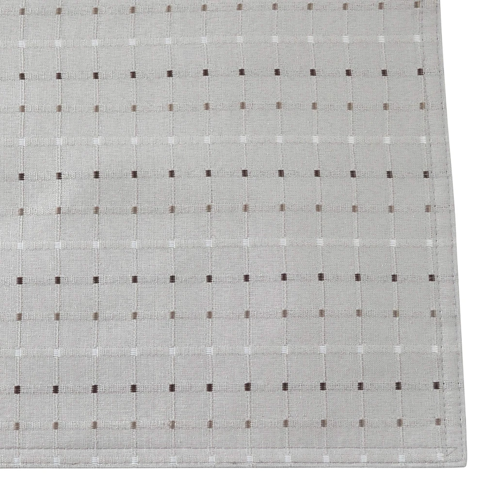 Clean and classic with a touch of texture, the stitched squares of this table runner make it ideal for anytime, any occasion. Size: 16"x54" Design is not reversible Runner has lining Cotton poly blend fabrics are loved for being low and easy care Materials: front: 56%cotton - 44%polyester, back: 100% polyester + Care: delicate cool machine wash separately, dry low, cool iron