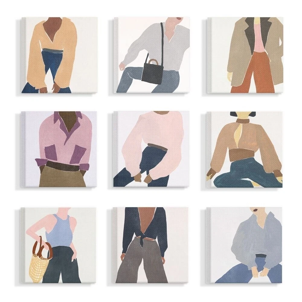 Proudly made in the USA! Our canvas multi piece sets are our newest and most distinguished offering yet! Each panel is mounted on sturdy 1.5 inch frame. Our vivid canvas is hand cut, then stretched and comes ready to hang. At this size, and with multiple pieces, it is sure to be a focal point of the room.Features:Wall Art is Ready to Hang - No Installation or Hardware Needed. For Easy Set Up Lean or Layer Artwork on Shelf or Against Wall.Our stretched canvas is created with the highest standards. We use only the highest quality inks and canvas on our in house Mimaki printers, and then hand cut and stretch each piece over a 1.5 inch thick wooden frame for hanging. Made In USA.Artwork Ideal for any Living Room, Den, Entryway, Bedroom, Office, Kitchen or Bathroom.Design by Melissa Wang Free Shipping Over $49.99* Details Stupell Fashion Styles and Female Figures Paintings, 9pc Multi Piece Canvas Wall Product Description: Proudly made in the USA! Our canvas multi piece sets are our newest and most distinguished offering yet! Each panel is mounted on sturdy 1.5 inch frame. Our vivid canvas is hand cut, then stretched and comes ready to hang. At this size, and with multiple pieces, it is sure to be a focal point of the room. Features: Wall Art is Ready to Hang - No Installation or Hardware Needed. For Easy Set Up Lean or Layer Artwork on Shelf or Against Wall. Our stretched canvas is created with the highest standards. We use only the highest quality inks and canvas on our in house Mimaki printers, and then hand cut and stretch each piece over a 1.5 inch thick wooden frame for hanging. Made In USA. Artwork Ideal for any Living Room, Den, Entryway, Bedroom, Office, Kitchen or Bathroom. Design by Melissa Wang