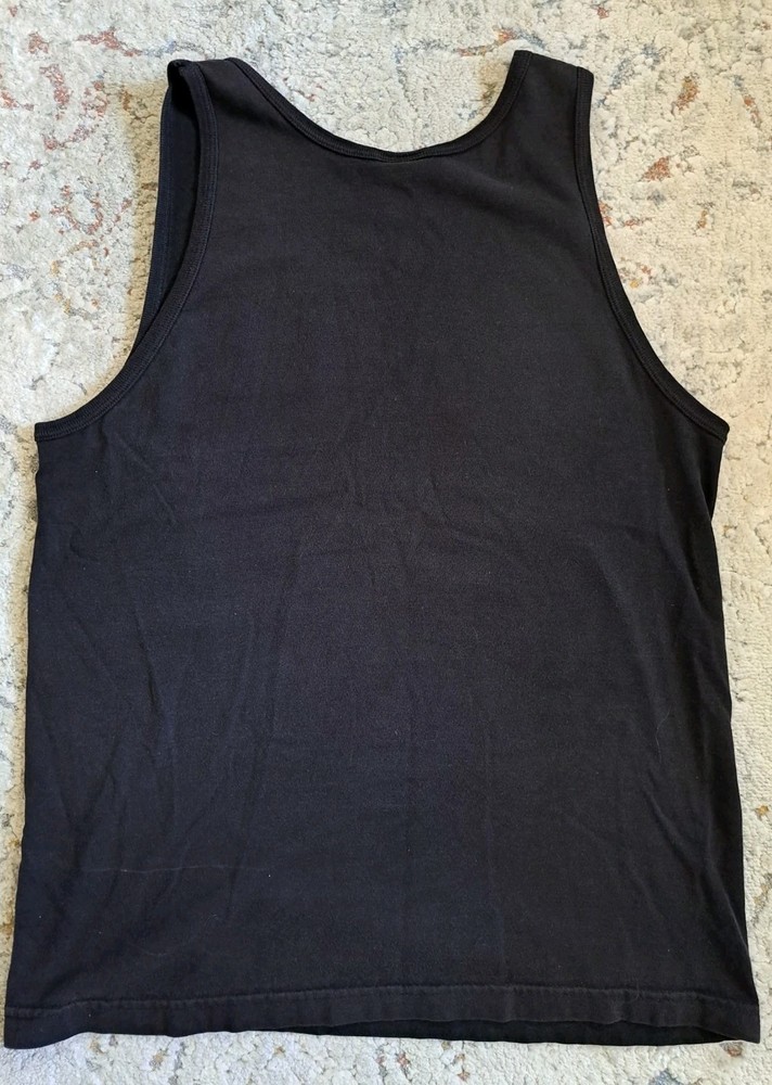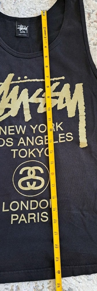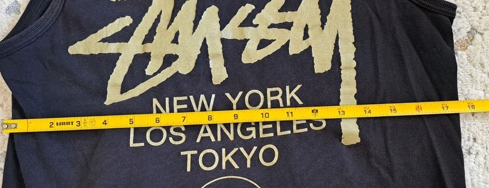 The Stussy T-Shirt is a men's small sleeveless t-shirt in black with a solid pattern. It features an angel character design on the front, representing the brand's connection to hip hop culture. Made with a round neckline and regular fit, this graphic tee is perfect for fans of streetwear and urban style. Designed in Mexico, this t-shirt is a fashionable and edgy addition to any wardrobe, showcasing the unique fusion of New York, Los Angeles, Tokyo, and Paris influences in the brand's aesthetic.