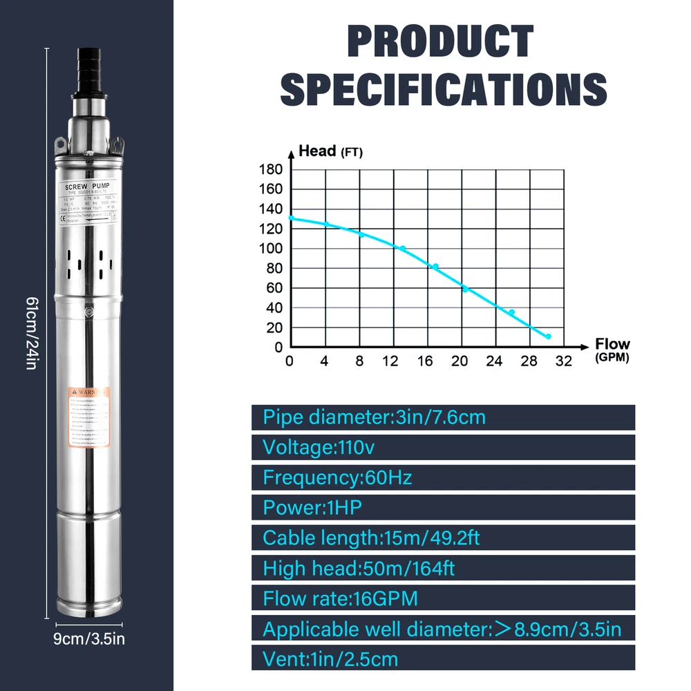 Store category Sign Up Now ! You may also like Product Description Bullet Points: Enhanced Durability: Increase efficiency and maintain animal health with this deep well submersible pump, perfect for Livestock Drinking and applicable to a range of scenes like urban drainage and farmland irrigation Extensive Reach: With its unparalleled deep extraction ability, this submersible pump is specifically engineered for wells with a diameter of over 3.5 inches, and is capable of reaching depths up to 50 meters to ensure maximum water entry Stainless Steel Reliability: Built with stable high-quality stainless steel material, this deep well submersible pump features an incredible compression resistant and a sturdy frame that ensures long-lasting performance Long-Term Stability: With a sturdy copper motor and robust rotor built for high efficiency, our submersible pump boasts a precise and sturdy rotor design paired with a stable oil seal to ensure stable functioning in high-pressure water environments Efficient Functioning: Equipped with a high-quality built-in check valve, our deep well submersible pump ensures seamless operating; the stainless steel filter effectively removes impurities for uninterrupted water supply Our well water pump is a wonderful choice for urban drainage and wells with a diameter larger than 3.5 inches. Featuring a high-quality stainless steel frame, high-efficiency motor and rotor, and a stainless steel filter that effectively filters impurities. Specification: 1HP deep well pump: Tube diameter: about 3in/7.6cm Voltage: 110V Frequency: 60Hz Cable length: about 15m/49.2ft Lift: about 50m/164.04 ft Flows: 16GPM Applicable well diameter: more than 8.9cm/3.5inches Ventilation outlet: 1in/2.5cm Material: stainless steel Notes: 1. Please confirm whether the voltage and frequency work with your local standard before ordering. 2. It is forbidden to use it without water. 3. Due to different lighting and screen settings, the item color may be slightly different from the picture. 4. Due to different manual measurements, please allow a 1-2cm difference in size. Packing List: Deep well submersible pump*1 Power cable*1 Adapter*1 Manual*1 Payment Delivery details Terms of sales About us Feedback & DSRs Payment Before you palce an order, please kindly make sure that you have a paypal account. We accept PAYPAL payment only. Payment should be completed within 2 days after auction closed, or unpaid dispute will be filed for an closing auction. An unpaid case will be filled after 4 days. Delivery details We ship to your eBay address. Each package will be shipped to US by UPS Regular Parcel with tracking number. Please check your shipping address carefully before checkout, it can't be changed if order completed. All items will be shipped within 1-2 business day upon receipt of payment.Orders placed on weekend will be shipped within 3 days. If you do not receive your item in 7-10 business days.please contact us immediately for further assistance. We will be responsible for any damages or losses incurred in the shipping process. About us We maintain high standards of excellence FIVE STAR and strive for 100% customer satisfaction! Positive Feedback is very important to us. We hope that you contact us immediately Before you give us neutral or negative feedback, so that we can satisfactorily address your concerns. We promise to offer the lowest price and high quality produce. Our working time: From Monday to Friday(9:30 am to 18:00pm), we don't working on holidays ,hope you can understand and know that , thank you. Please always talk to us via ebay Message. We appreciate your business and look forward to growing our e-Bay sales with satisfied customers. Feedback Contact us If you have any questions, please feel free to contact with us by ebay Message during our business hours ( 9:30a.m. to 5:30 p.m.), or email us through eBay, we will try our best to help you to resolve it. For any presale or after-sale questions,please do feel free to email us! Due to the time difference, each email will be replied within 1 working day,and weekend will be delayed a bit. Feedback