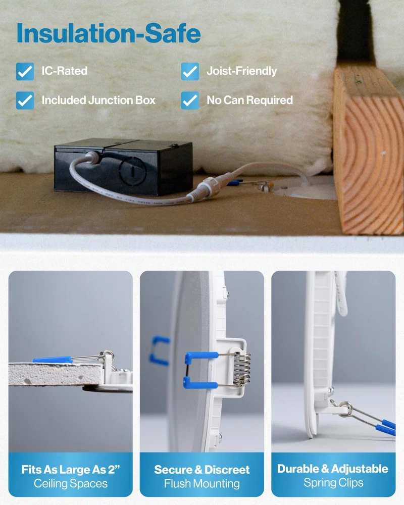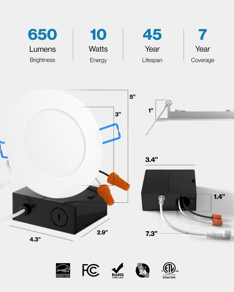 Store New Arrivals Add to Favorite View Feedback Contact Sunco 4 Pack 4 Inch Ultra Thin LED Recessed Ceiling Lights Slim, 6000K Daylight Description Item model number DL_SL4-10W-6K-4PK Light Source Type LED Style Modern Power Source Corded Electric Number of Light Sources 4 Material Type Aluminum, Polycarbonate Warranty Type manufacturer Theme Space Lighting Method Downlight Finish Types Matte White Embellishment Feature Crystal Controller Type Push Button Unit Count 4 Count Room Type Kitchen, Bathroom, Bedroom, Living Room, Home Office, Dining Room Brand Name Sunco Lighting Specification Met ETL Product Dimensions 4.9 x 0.9 x 4.9 inches; 1.76 Pounds Material Aluminum, Polycarbonate Required Assembly No Model Number DL_SL4-10W-6K-4PK Installation Type Flush Mount Additional Features All-in-One Package, Dimmable, Wafer Thin, 10W, IC Rated Specific Uses For Product Home, Office Included Components Junction Box Fixture Type Non Removable Brightness 650 Lumen Country of Origin China Light Color Daylight Deluxe Item Weight 1.76 Pounds Light Fixture Form Ceiling Item Dimensions L x W x H 4.9"L x 0.9"W x 4.9"H Shade Color White Mounting Type Direct Color 6000K Daylight Deluxe Wattage 10 watts Indoor Outdoor Usage Indoor Shape Circular Voltage 120 Volts Control Method Remote Manufacturer Sunco Lighting Brand Sunco Lighting Style Name Modern Light fixture form Ceiling Top Rated 4 Inch Slim LED Downlight with Junction Box and Smooth Trim ✅ IC RATED - Sunco's slim downlights are IC rated, meaning they are thermally protected and won’t overheat or ignite surrounding insulation in the roof or overhead joist space. Both the light and its junction box are safe for direct contact with ceiling insulation. ✅ SIMPLE INSTALL - Our LED slim downlights come equipped with a junction box which means they do not need a can. This 4-inch Wafer Thin Slim installs fast. Cut a hole in the ceiling to size then fold the spring-loaded brackets in while pushing up into the hole. Spring-loaded brackets fit any ceiling type: double drywall, single drywall, and soffit. ✅ DIMMABLE - Seamless dimming capabilities (10%-100%) to fit any mood or décor. ✅ SUNCO BENEFITS - 7-Year Warranty! Sunco is proudly based in the USA, offering quality products at affordable prices backed by industry-leading warranties and knowledgeable support specialists. Product Description Similar Products Add to Cart Add to Cart Add to Cart Add to Cart Customer Reviews 4.4 out of 5 stars 2,144 4.5 out of 5 stars 1,519 4.6 out of 5 stars 1,546 4.3 out of 5 stars 119 4.7 out of 5 stars 1,115 Price $54.99 $ 54 . 99 $99.99 $ 99 . 99 — $63.99 $ 63 . 99 $29.99 $ 29 . 99 Lumen Count 650 Lumens 650 Lumens 650 Lumens 750 Lumens - Wattage 11W 10W 10W 12W - Equivalency 60W 60W 60W 75W - Dimmable ✓ ✓ ✓ ✓ - Junction Box Included ✓ ✓ Integrated ✓ - Color Rendering - - - CRI 90+ - Voltage 120V 120V 120V 120V - Moisture Rating Damp Rated Damp Rated Damp Rated Damp Rated - IC Rated ✓ ✓ ✓ ✓ - Can Required No No No No - ABOUT US We offer the best prices around on high quality products. Our E-store includes media such as books, movies, music and games while offering electronics, toys, sporting apparel, clothing, tools, general home, garden items and more. SHIPPING We are always working hard to ensure your package arrives as soon as possible. Please understand that some factors like weather, high postal traffic, and the performance of shipping companies are outside of our control. We offer free shipping to the lower 48 states and ship within 2 business days of payment, usually sooner. We do not accept P.O. Boxes. Please provide a physical address. RETURNS We offer a 30-Day Return Policy on items which you are not completely satisfied with. You have the option for a full-refund or an exchange of the item. No returns are available on items shipped outside of the USA. PAYMENT We accept PayPal. CONTACT US This page content is yet to come Please ad us to your favorite seller and visit again later Thank You CUSTOMER SATISFACTION We try our very best to make sure every customer is completely satisfied. If there's a problem, message us! We're happy to help.