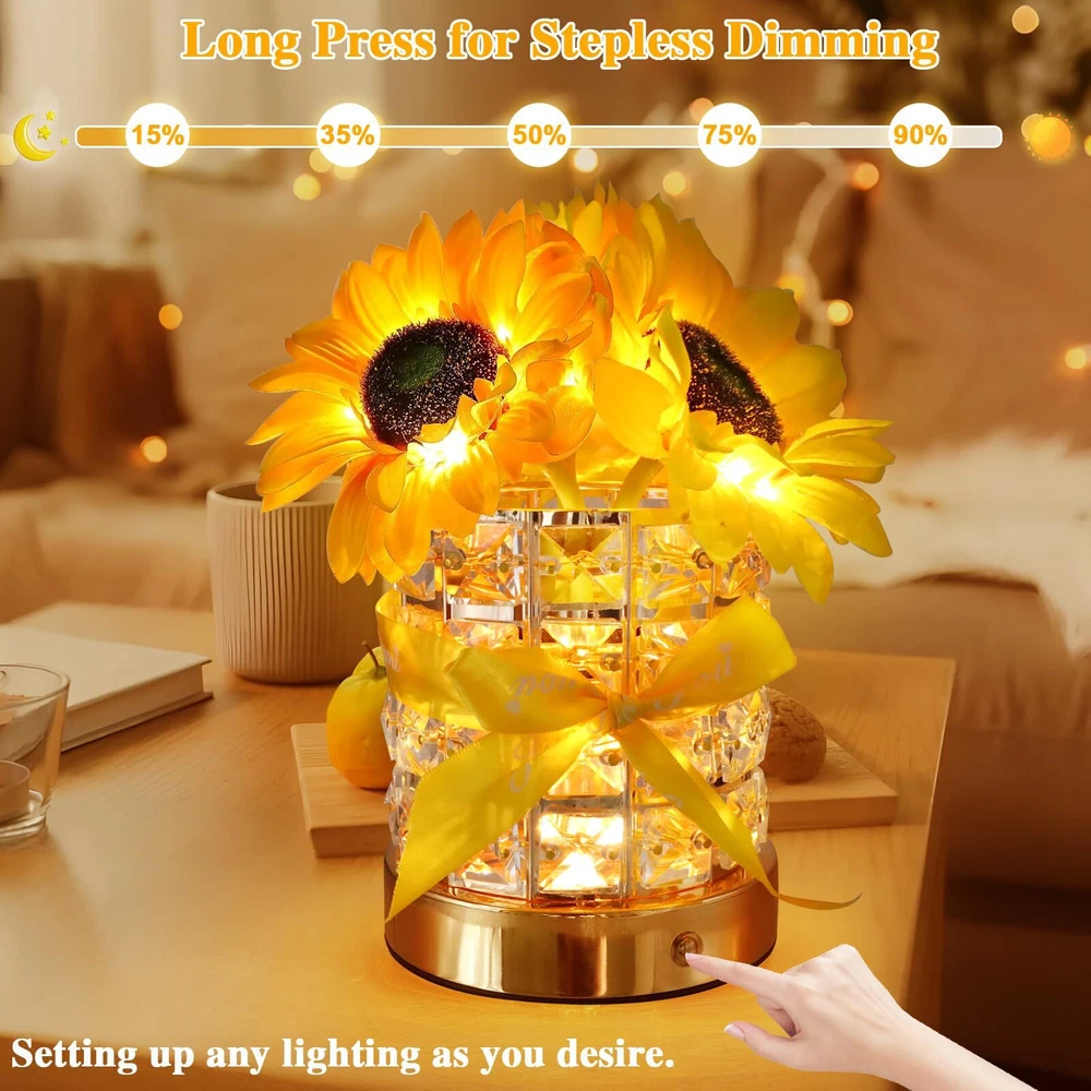【Perfect Gifts For Mom Women Girls】Sunflower is like a young girl standing in a pavilion, golden petals in the lights seems to be very delicate, the piece of delicate petals like carved with gold, exudes a charming light.This golden, never-fading sunflower will make the perfect gift when combined with a crystal glass lamp!Mom Mothers Day gifts for her,Valentine Day gifts for women. Christmas gifts from daughter,Birthday gifts for teenage girls. Grandma gifts. Romantic Sweet Warm Gifts for her 【Sunflower Bedside Decor lamp】This is an innovative aesthetic lamp! Artificial sunflowers with vase combine the LED lights source of flower bonsai with highly simulated plants, the whole plant is real and natural. When the LED light is turned on, the bright and soft light spreads through the clear crystal vase. Sunflower artificial flower lamp are very suitable for bedrooms, living rooms, study, children's rooms, kitchen, dining table, nightstands, desktop decoration. 【3 colors are adjustable】 This crystal table lamp is available in three colors that can be adjusted, and with the touch of a switch, you can adjust different lights to suit different scenes. White light is good for office, yellow light is good for dating, and warm light is good for night light. 【Stepless Dimmable Bedside Lamp】Cute flower desk lamp use touch switch. Just long press the buttons at the bottom to easily control the lights. You can use it without insertion. Sunflower cordless table lamp have adjustable brightness levels. The lights are soft and not dazzling. They can be used as night light, bedside lamp, ambient light, reading lights, and nursy lights. It is an excellent to your home decoration. 【Creative Eternal Sunflower Gift】Sunflower symbolizes hope, light and enthusiasm. If you are looking for a special gift, then our sunflower lamp will not disappoint you. Eternal sunflower flower lamp are given to Mom, Dad, grandma, wife, , girlfriend, sisters, friends cute gifts. Those love and blessings that have not been said, Sunflower table lamp will help you convey