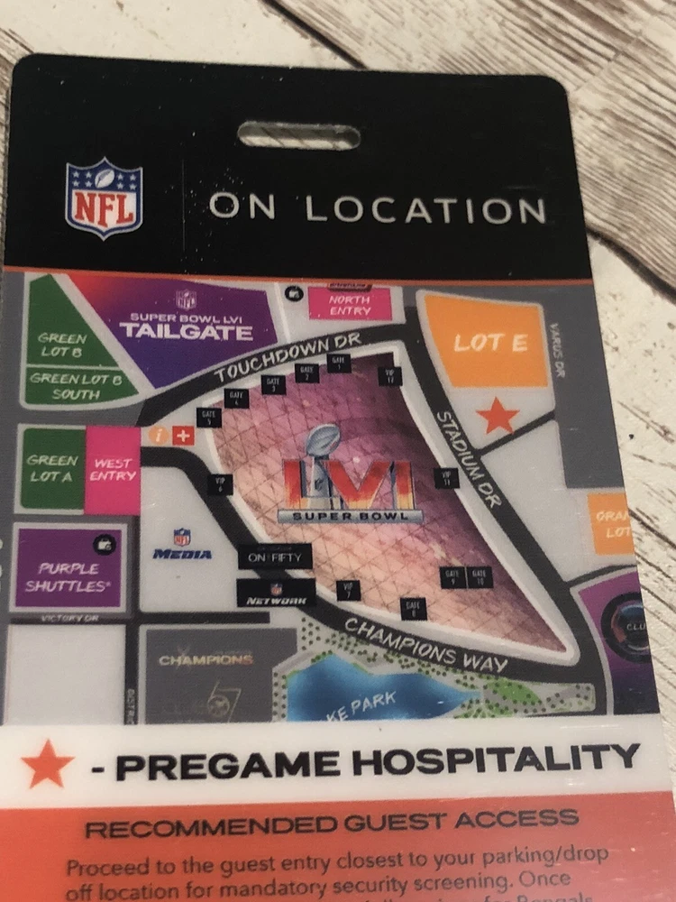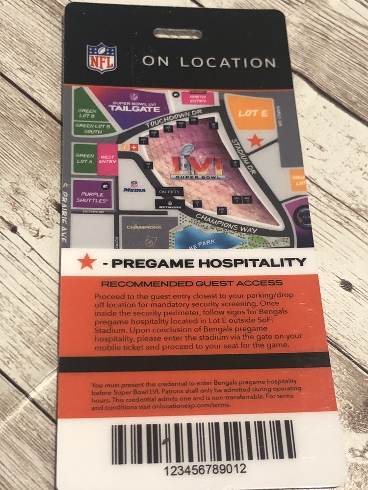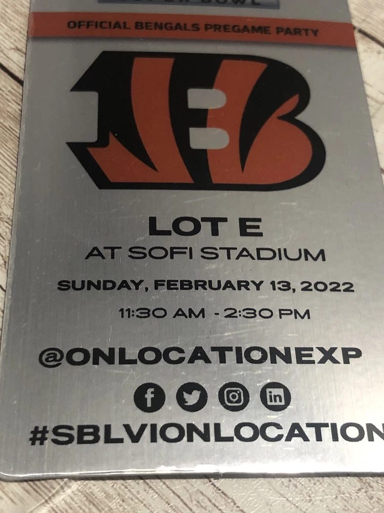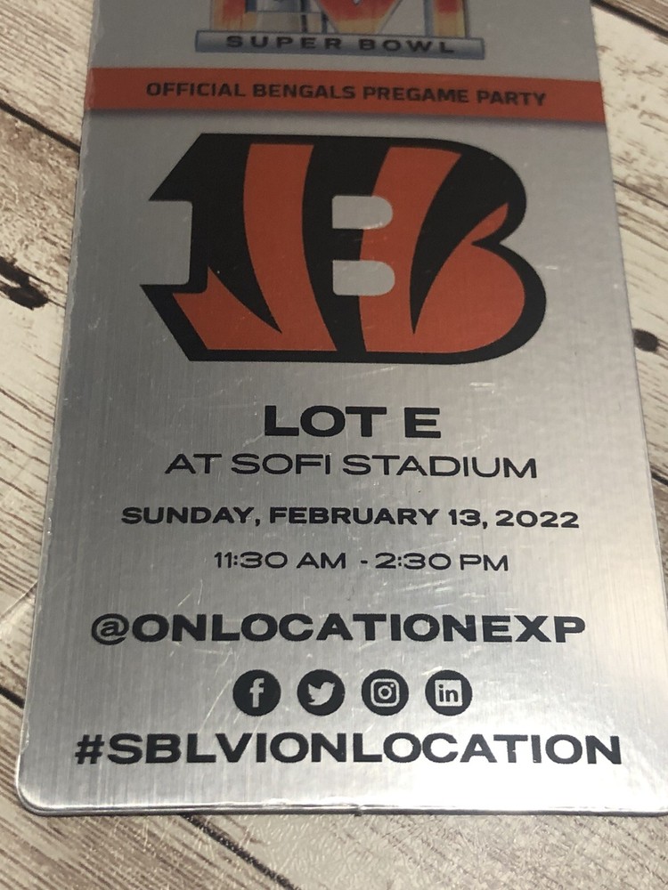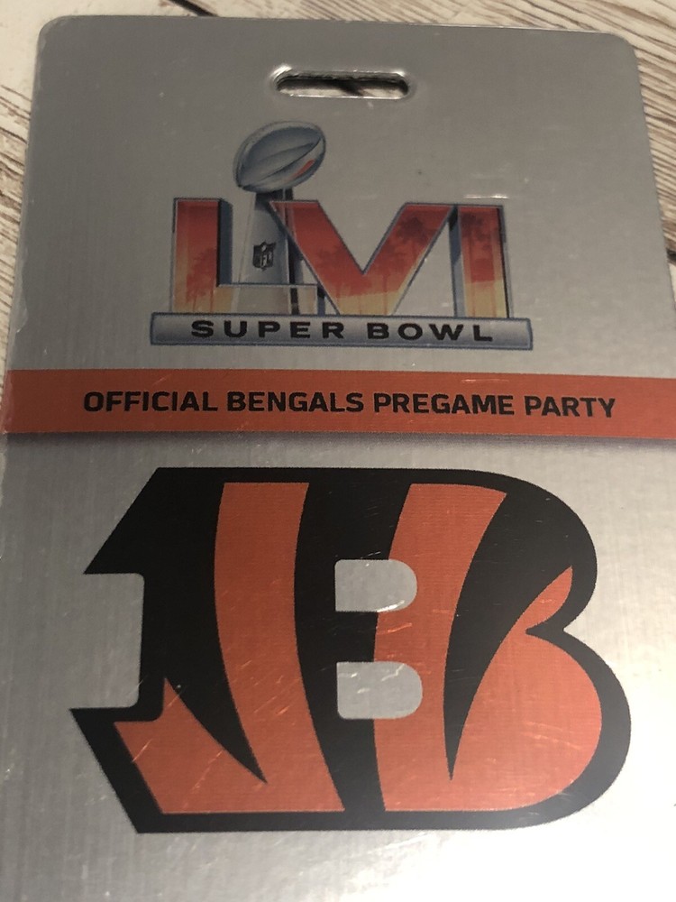 This is a rare chance to own a memorabilia pass tag for the Cincinnati Bengals' pregame party at Super Bowl LVI 2022. The laminate tag grants access to an exclusive event before the big game, making it a must-have for any die-hard Bengals fan. Sofi Stadium This pass is unused 2.5” x 5.5”