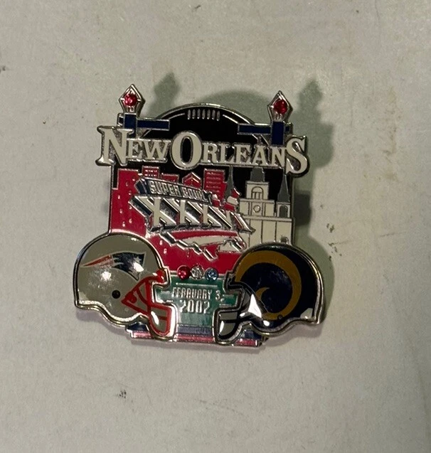 This Super Bowl XXXVI pin features the Patriots and Rams facing off in New Orleans in 2002. This pin is a great addition to any sports fan's collection, especially for those who appreciate vintage sports memorabilia. The pin is officially licensed and is an original piece, not a reproduction. It is a perfect souvenir for fans who attended the game or for those who simply want to show their support for their favorite team. The pin is made in China and does not require a California Prop 65 Warning. Team-Hockey, Player, and Team-Basketball aspects are not applicable.