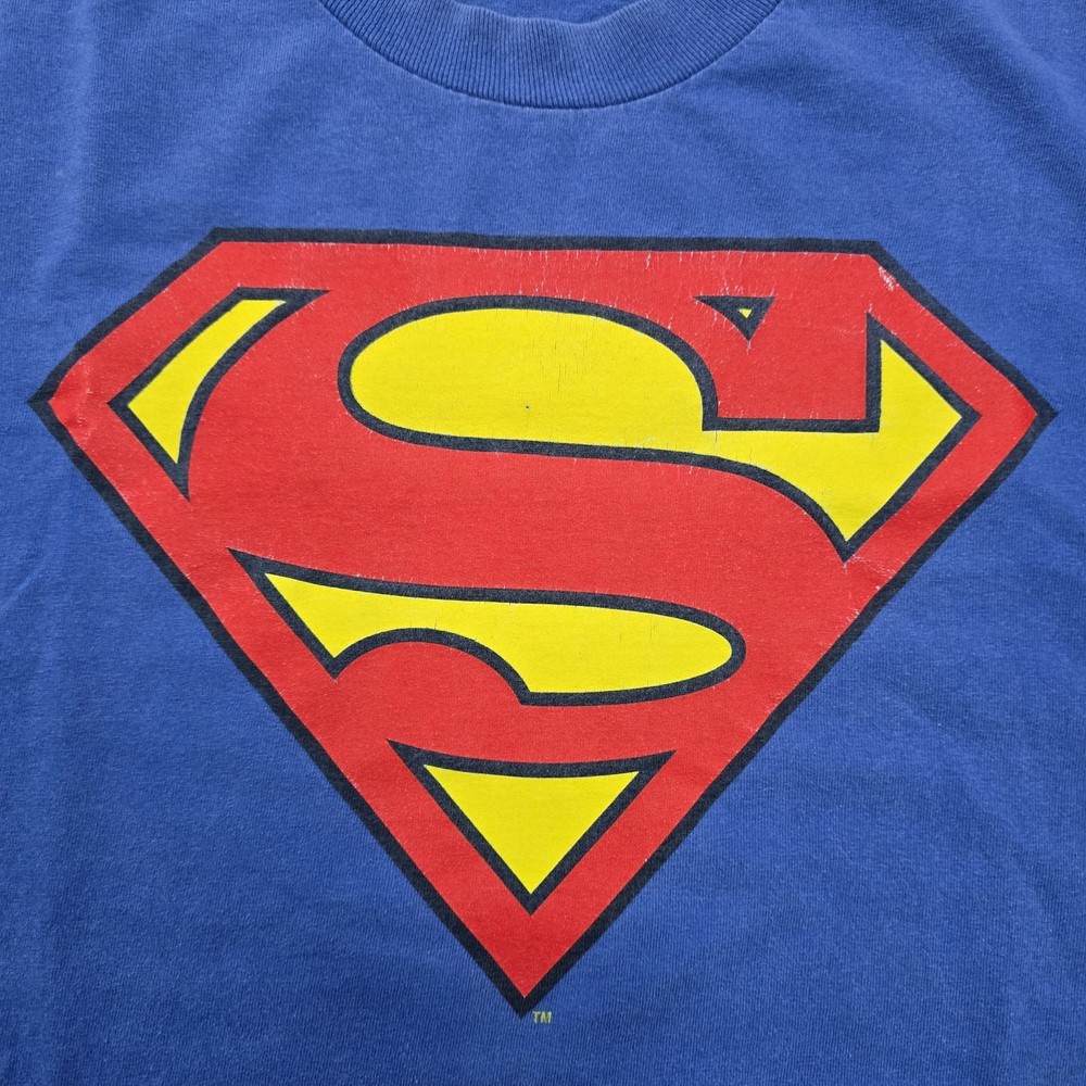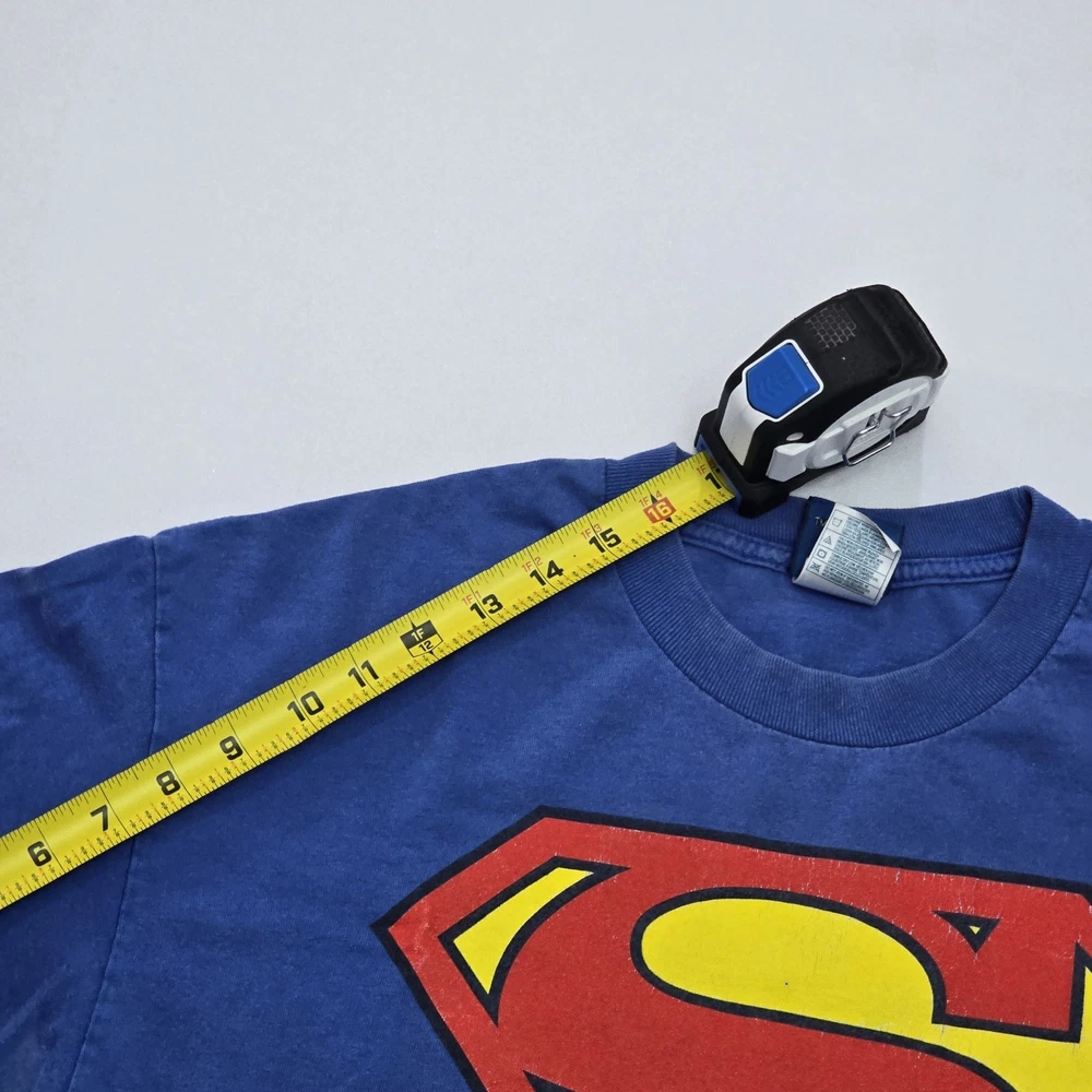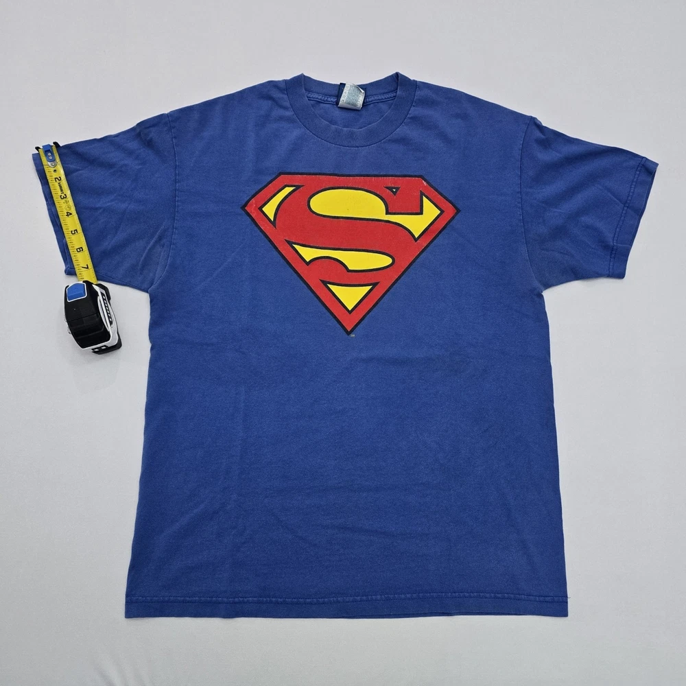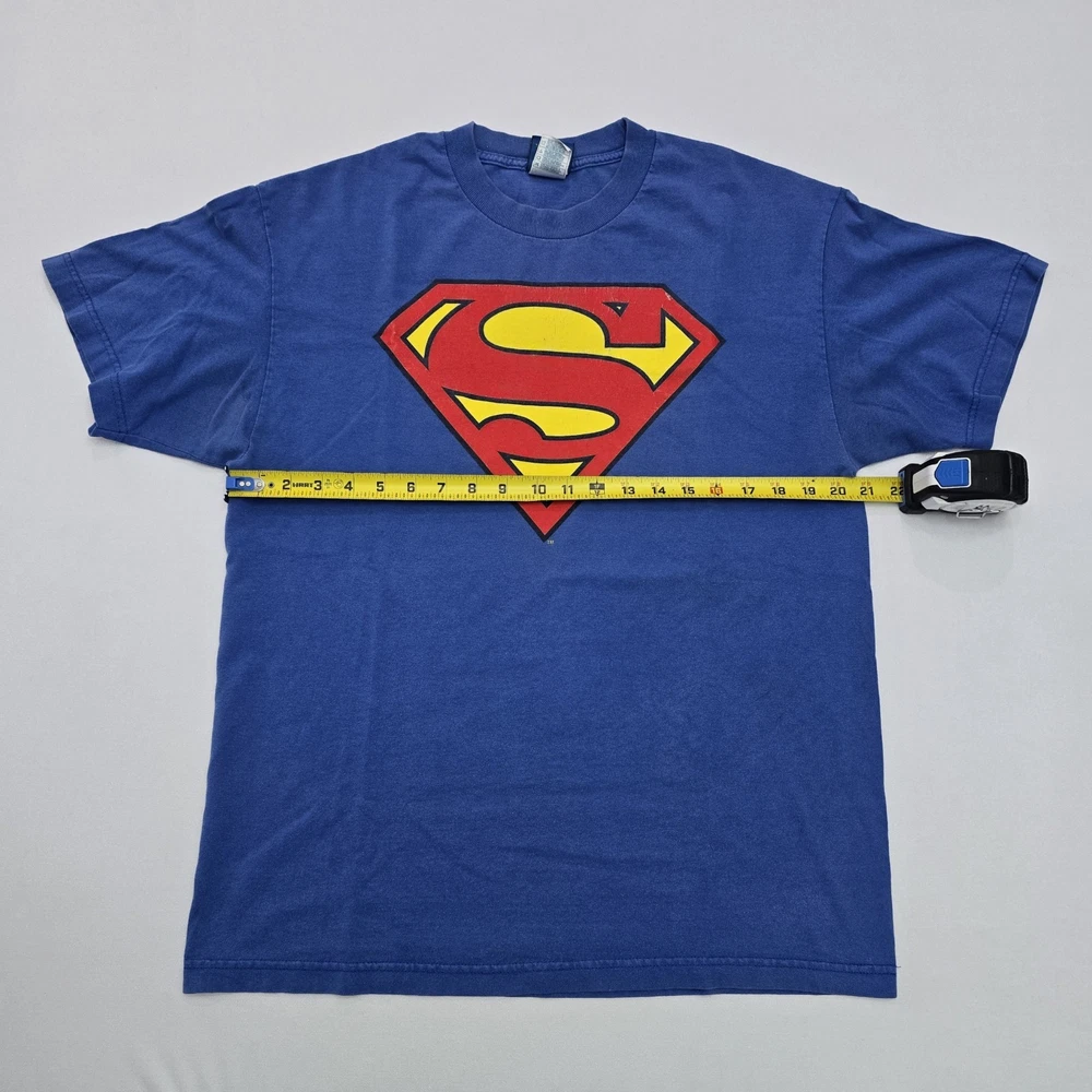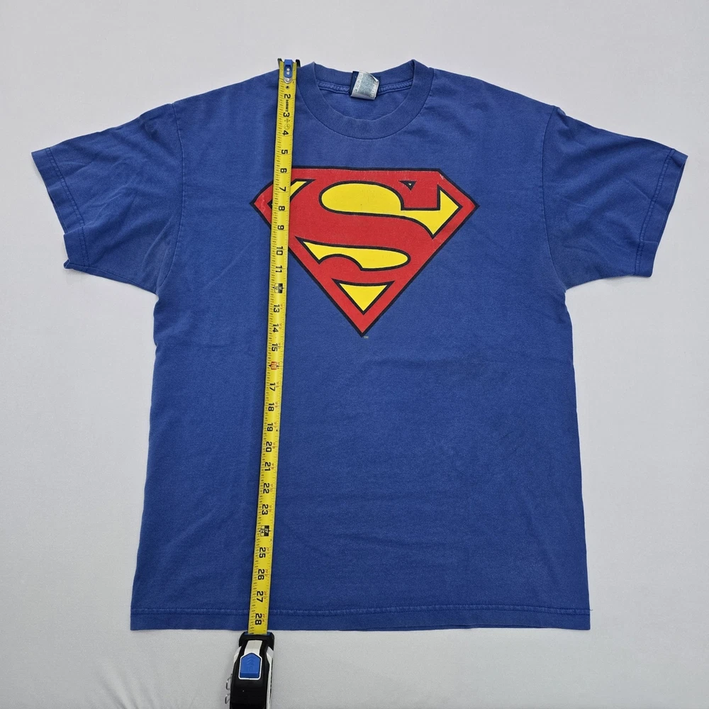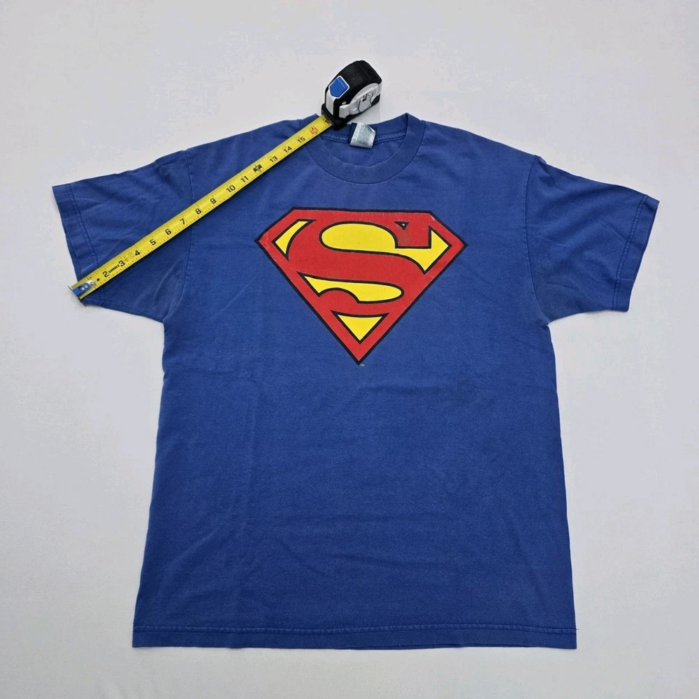 The product is a DC Comics Superman Logo Vintage Graphic T-shirt for men in size large. The shirt features the iconic Superman logo in a vintage style, perfect for fans of the comic series. The blue color adds a classic touch to the design, making it a stylish and comfortable addition to any man's wardrobe. Show off your love for Superman and DC Comics with this bold and nostalgic graphic tee. See Photos For EXACT Measurements