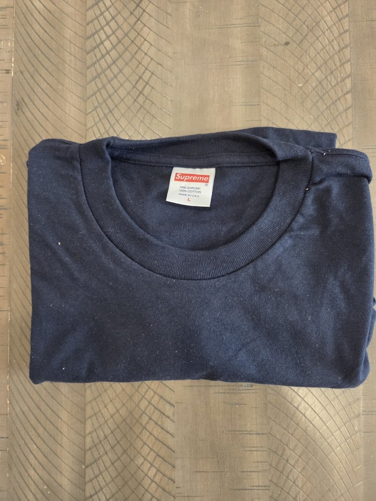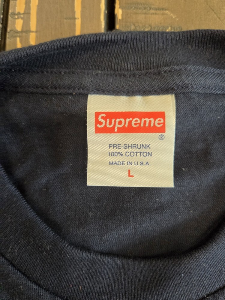 The Supreme "Blank" Plain T-Shirt in black is a classic and versatile wardrobe staple made in the USA. This short sleeve shirt features a crew neck and is crafted from soft cotton material for comfort. The regular fit, size L, and solid color make it a timeless choice for any man looking for a high-quality tee. Whether you're going for a casual look or showing off your patriotic spirit, this sleek t-shirt is perfect for the summer season.