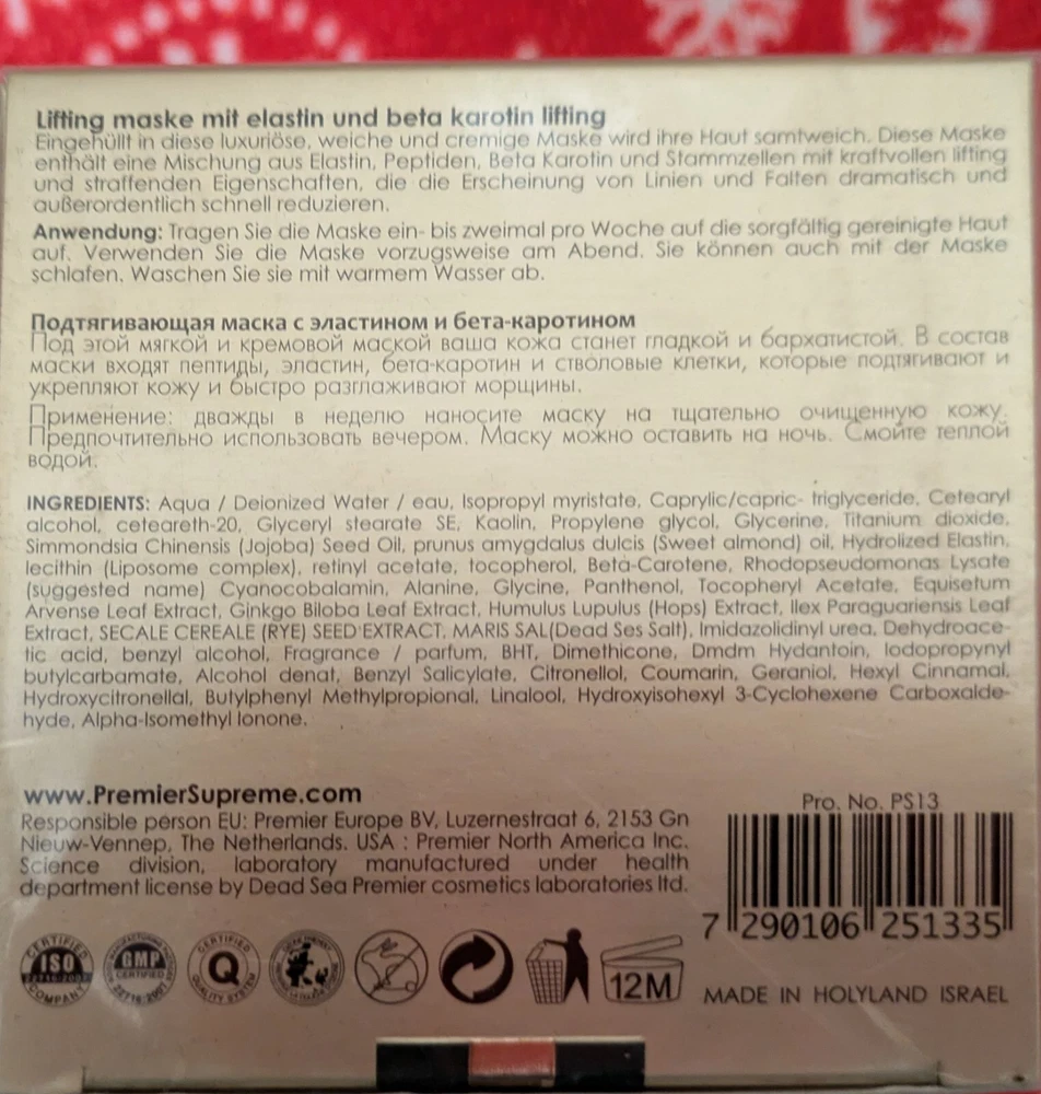 Supreme Elastin Beta Carotene Lifting Mask. Brand new still sealed in the package.