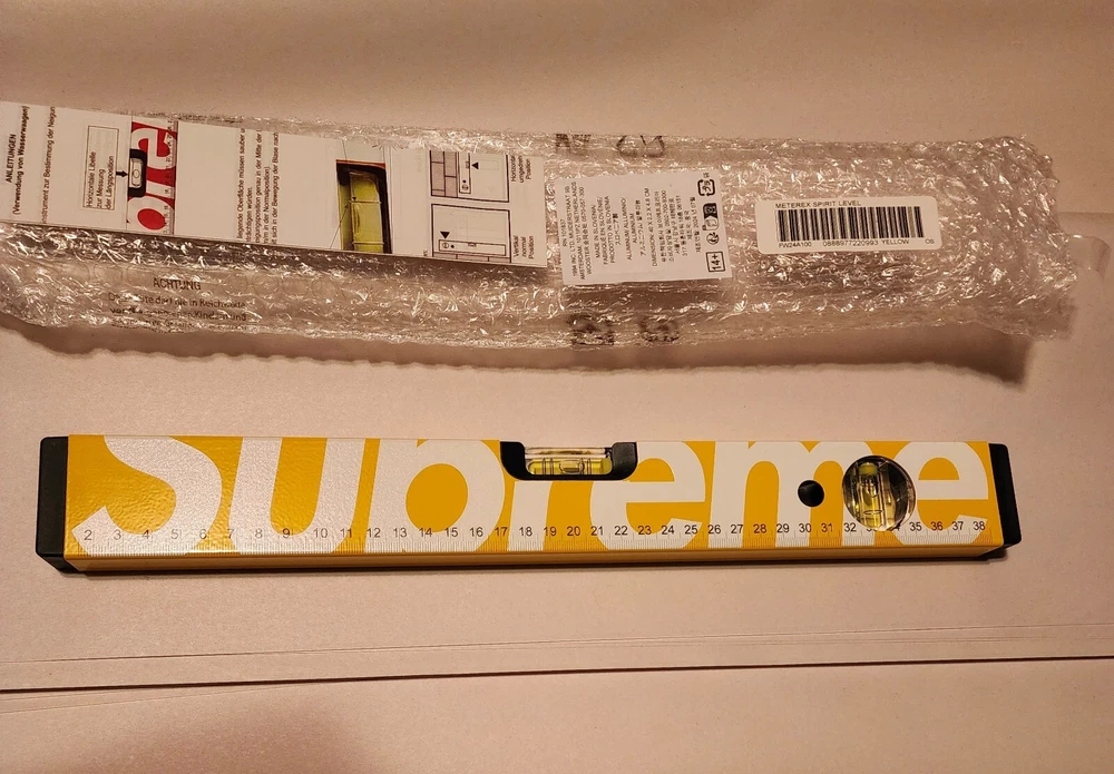 I habe in hand! Hmu with offers or questions!! It is 39cm - 15.75In .This Supreme Meterex Spirit Level in yellow is a rare find for any streetwear enthusiast. Crafted from 100% aluminum, this multifunctional accessory is perfect for those who want to add a touch of luxury to their daily routine. The logo accents and sleek design make it a must-have for any Supreme fan. This unisex level is perfect for both men and women who want to show off their love for designer and streetwear fashion. This spirit level is sure to make a statement. Don't miss out on the opportunity to add this Supreme Meterex Spirit Level to your collection.
