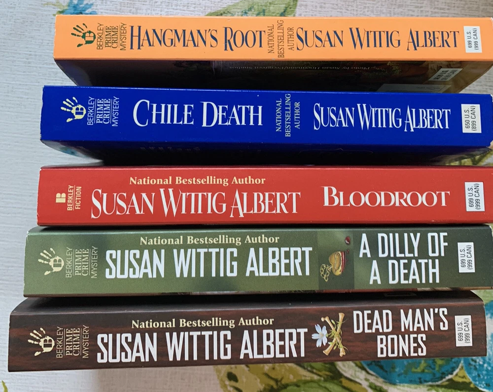 Susan Wittig Albert Lot Of 5 Paperback Books Bestselling Author. Dead Man’s Bones, A Dilly of a Death, Bloodroot, Chile Death, Hangman’s Root. The books don’t look like they have been read, the pages may be yellowed from age. Buyer pays media postage by zipcode.