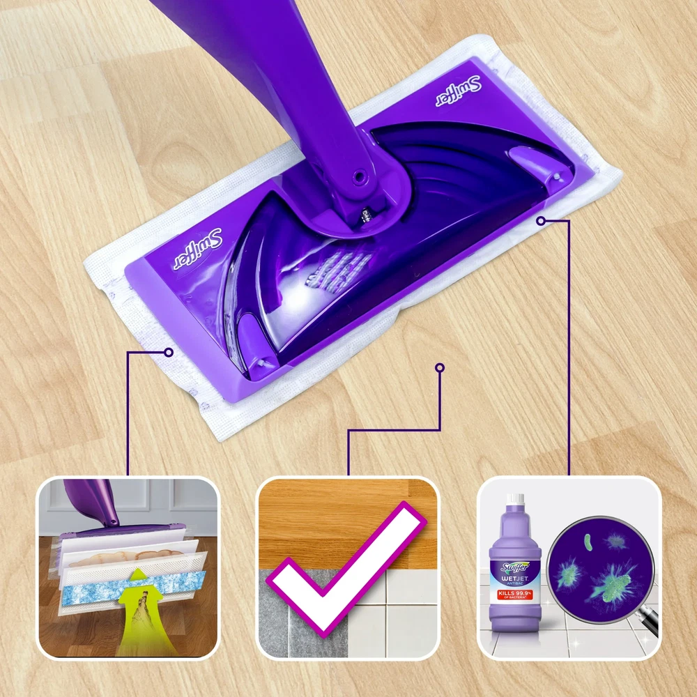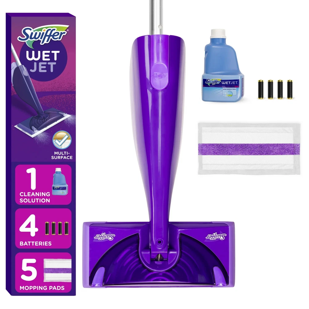 Swiffer Wet Jet Mop, Floor Cleaner Set w/5 Refill Pads & 1 Solution, Fresh Scent Swiffer WetJet is an all-in-one spray mopping system designed for maximum convenience and efficiency, making it ready to use right out of the closet. This innovative cleaning solution begins with a fresh pad and utilizes a uniquely designed, dual-nozzled WetJet spray mop head to deliver the powerful floor cleaner precisely where it’s needed. As you spray, watch the dirt and grime dissolve effortlessly, while the thick pad absorbs the mess deep inside, ensuring that debris doesn’t get pushed around during the cleaning process. Gone are the days of struggling with a traditional mop and bucket—Swiffer WetJet Wood offers a streamlined alternative that simplifies your cleaning routine. This exceptional mop is paired with a specialized floor cleaner, allowing you to effectively maintain your finished hardwood floors without the hassle of rinsing or heavy scrubbing. The advanced formulation of the floor cleaner not only cleans but also enhances the natural beauty of your wood surfaces, leaving them looking pristine. Embrace the efficiency of the Swiffer WetJet system and enjoy the satisfaction of a clean home without the added effort. The ease of use, combined with the effectiveness of the floor cleaner, makes this mop an essential tool for any homeowner looking to keep their hardwood floors in top condition. Say goodbye to traditional methods and experience the difference that the Swiffer WetJet mop can make in your cleaning routine! Includes 1 Power Mop starter kit, 5 refill pads, 1 solution, and 4 batteries Swiffer WetJet Wood gives you the cleaning power of a mop with the convenience of a wipe. Easily get into tight spaces and clean your floors in minutes without the hassle of a mop and bucket WetJet Wood is safe to use on your sealed, finished hardwood floors The powerful WetJet Wood cleaning solution dissolves dirt and grime while the thick pad absorbs it deep inside, so it doesn't get pushed around Assembly is easy! After connecting the handle, just insert the batteries, load the cleaning solution, pop on a fresh pad (strip down), and you're ready to clean! It's that easy Did you know your mop head could be filled with bacteria? With WetJet Wood, skip the bacteria and start with a fresh, clean pad every time WetJet Wood is truly scent-sational! The specially scented formula cleans your finished hardwood floors to reveal their natural beauty while awakening your senses Swiffer WetJet Wood is compact, lightweight, and easy to store. So, it's always ready to tackle messes right away Buy Swiffer WetJet Wood worry-free. If you're not completely satisfied, check out our money-back guarantee Includes 1 Power Mop starter kit, 5 refill pads, 1 solution, and 4 batteries