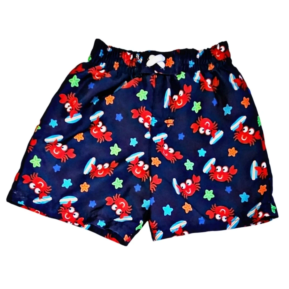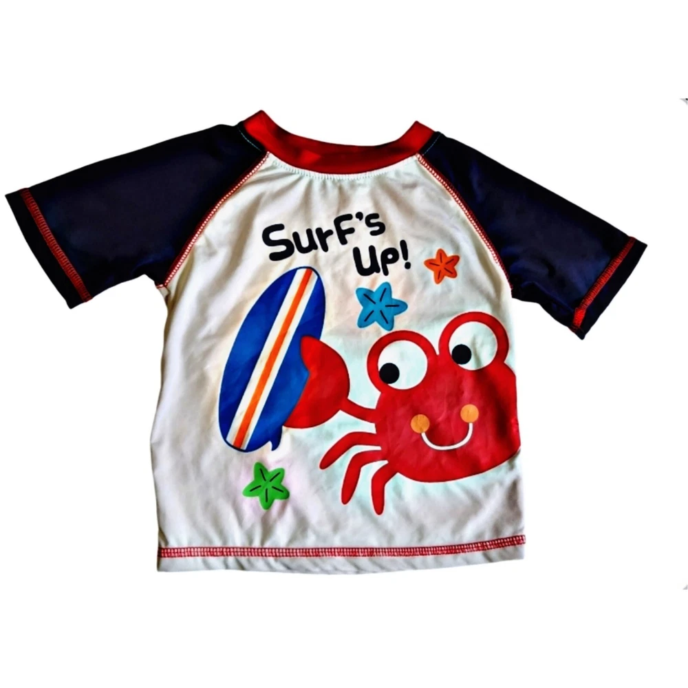 Get ready for a day at the beach with this adorable two-piece swim set for your little one! Featuring a red crab character and a beachy surf theme, this set includes a comfortable swim shirt and matching trunks. The elastic waist and short sleeves provide a perfect fit for your 12-month-old toddler. Made from a blend of polyester and spandex, this swimsuit set is easy to care for and machine washable. The logo accents and lined trunks add extra comfort and style. Perfect for a day at the beach or pool, this set is a must-have for any little one's summer wardrobe.