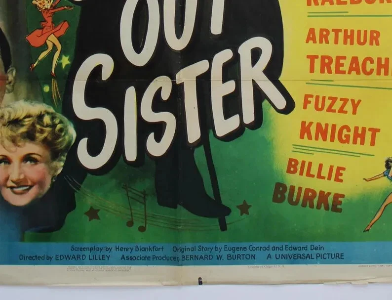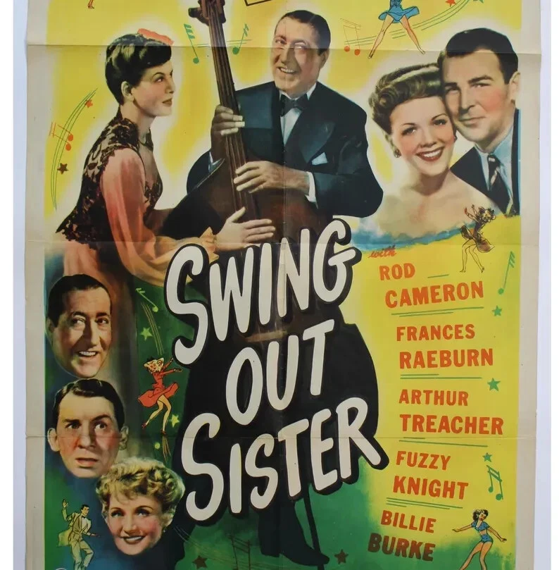 This is a rare and original 1945 Swing Out Sister poster featuring Rod Cameron, Billie Burke, and Arthur Teacher. The poster measures 27 x 41 inches and is a must-have for any movie memorabilia collector. It is a great piece of entertainment history and a fantastic addition to any collection. This poster is in its original state and was made in the United States, adding to its value and authenticity. It is perfect for fans of classic movies and collectors of posters from this era.