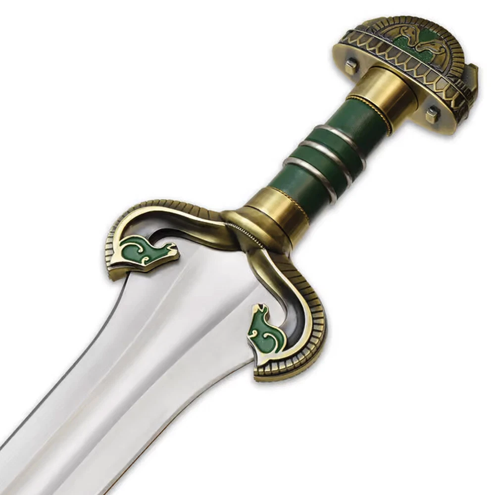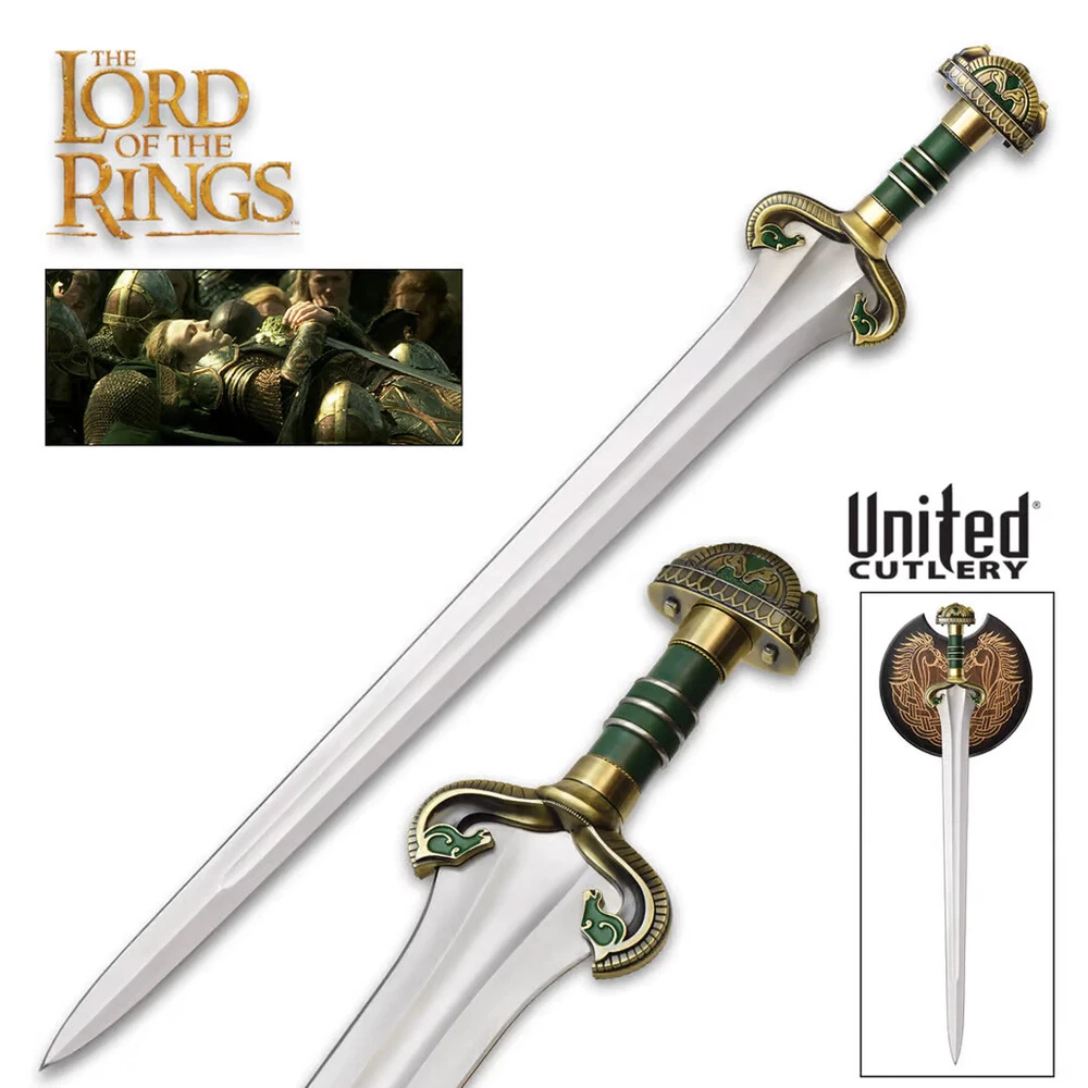 Sword of Théodred - The Lord of the Rings - Officer Sword of Théodred - The Lord of the Rings - Officer The sword of Théodred, fallen son of King Théoden. Théodred’s sword was the sword companion of Éowyn, his cousin. It was virtually identical, except for the green enamel on the grip and the green leather grip. This authentically detailed sword replica is a reproduction of the royal film prop sword created by New Zealand’s Weta Workshop and used in the film «The Lord of the Rings: The Two Towers» presented by New Line Cinema. Details: Overall length: 92 cm. Length of the daughter: 76 cm. Each sword has an individual serial number and is presented with a wooden wall display and a certificate of authenticity.