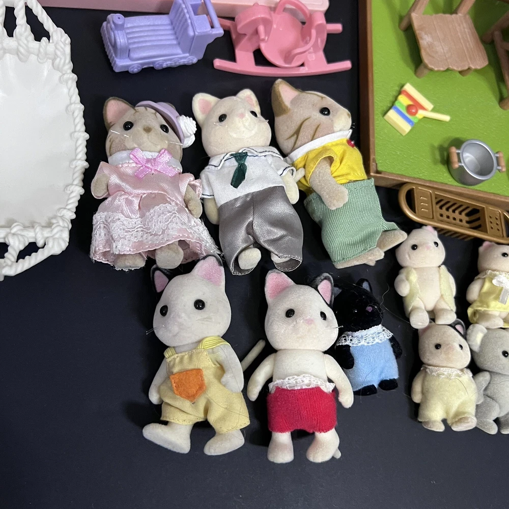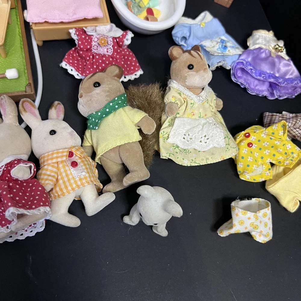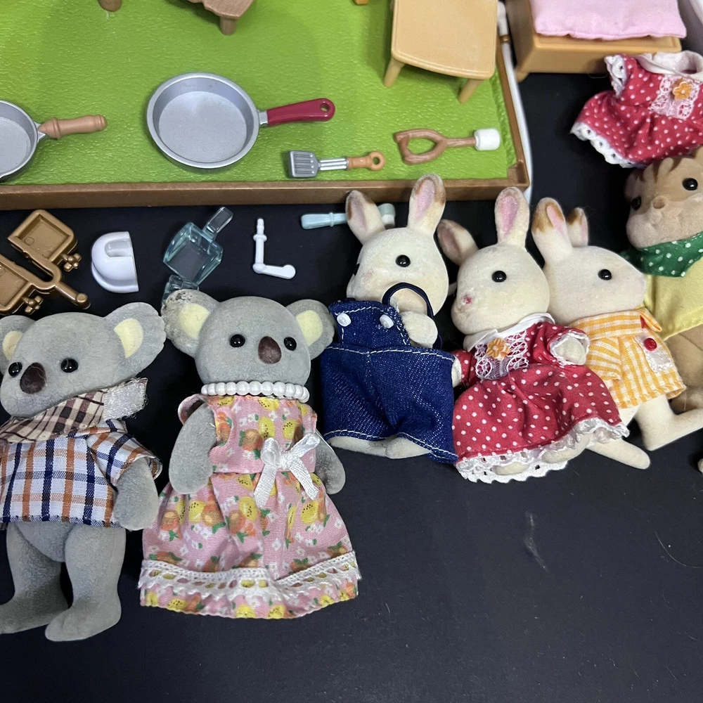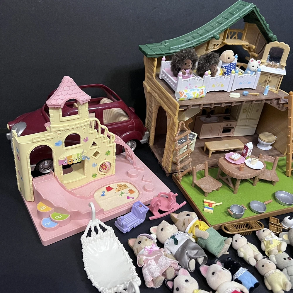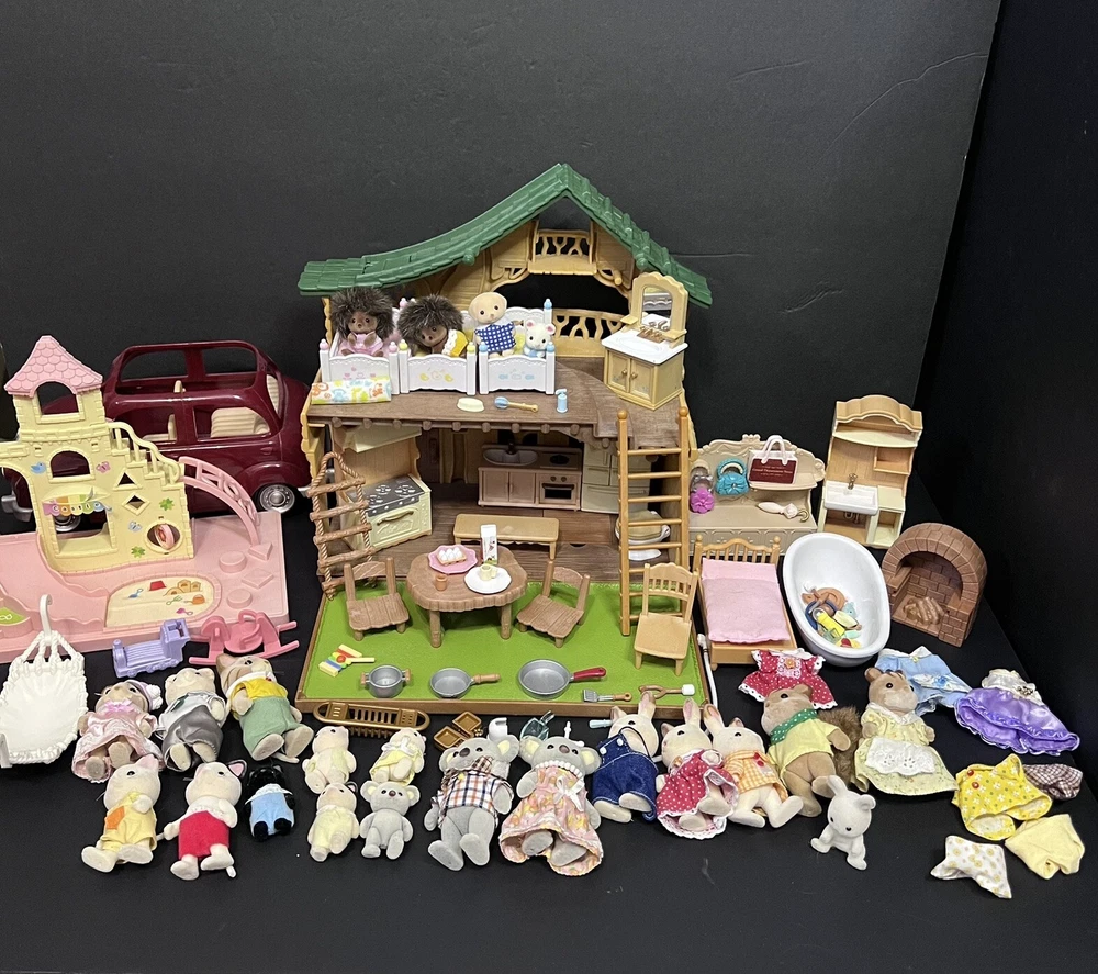 •Sylvanian Families/ Calico Critters Lakeside Lodge Play House. •Epoch Co, Ltd Calico Critters Cherry Cruiser Red Coupe Roadster Holds 5 Critters. Car needs a deeper cleaning. •Baby castle playground. (Some Stickers are peeling off. ) •22 Animal dolls. -9 cats -3 Koalas ( mom has damage on the ear.) -4 Bunnies (one bunny in missing a tail) -2 Chipmunks -2 Baby Hedgehogs -1 baby yellow lab -1 baby white mouse /gerbil?? Mixed assortment of furniture and accessories. Tables, chairs, refrigerators, tub, fireplace, shower and bathing accessories, campfire accessories, purses. Please refer to ALL photos. You will receive every item as photographed. Most Items are in played with condition. Some were only displayed on a shelf, some have some light wear.