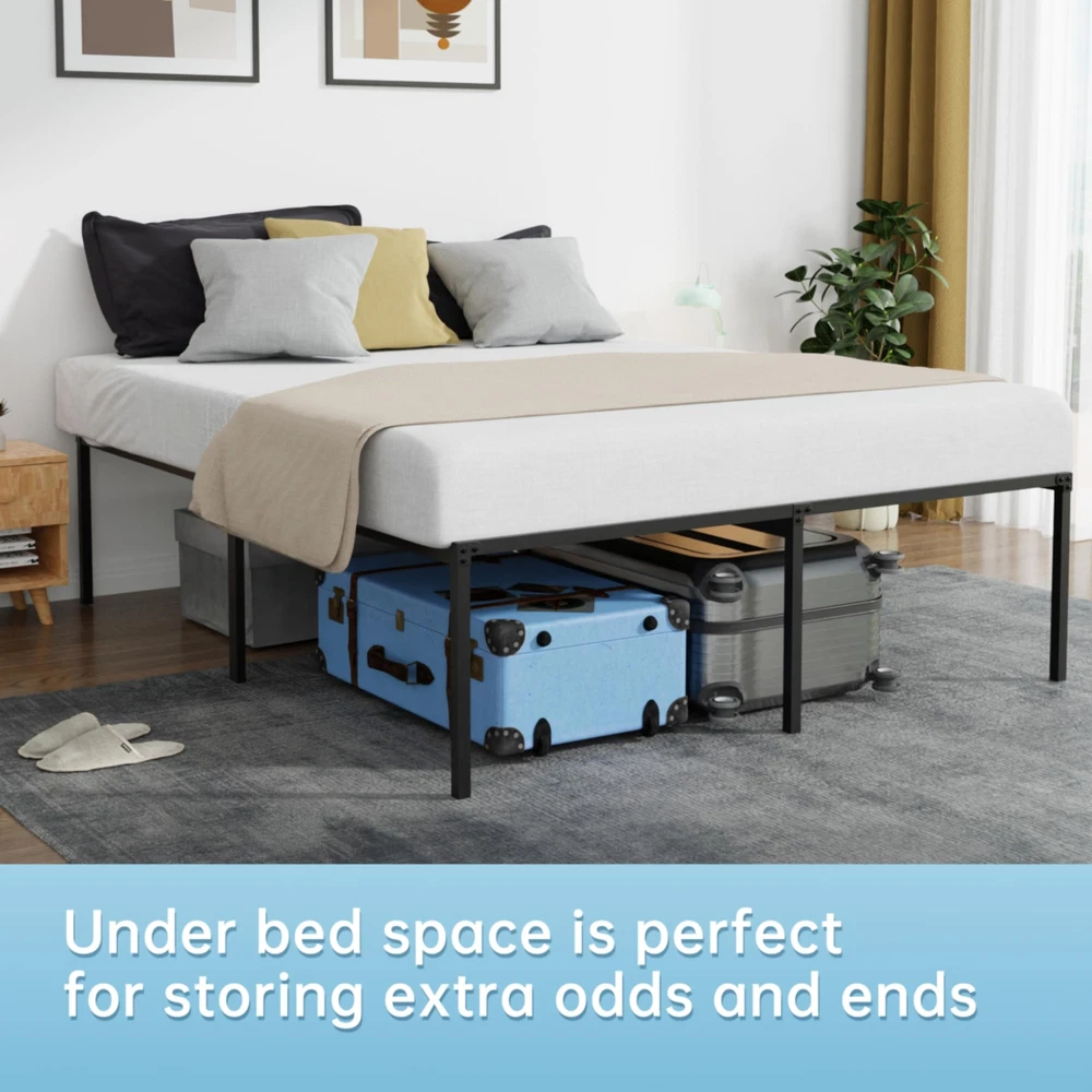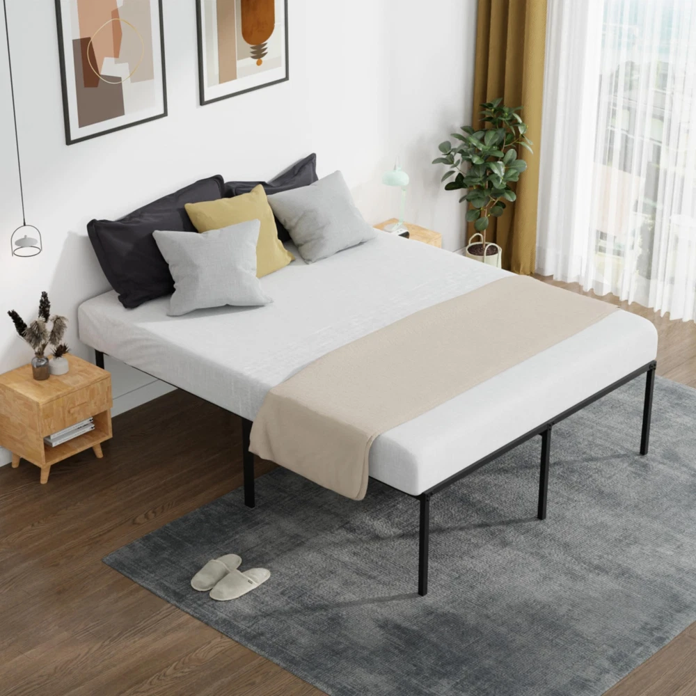 Robust Support with Sleek Elegance Metal bed frame full size crafted from durable steel bed slats with sleek black powder coating. The contemporary design features minimalistic lines, offering a sophisticated and stylish appearance. Enjoy sturdy foundation that prevents mattress sagging, providing reliable support for weights. Full size bed frame reinforced fastener and noise free construction design provides shake-free stability and good time sleep. Modern Intelligent Design Effortlessly assemble in minutes and reserve hole for a headboard adds customization. Generous under-bed space, perfect for additional storage and easy cleaning. Usable without a box spring, this platform bed frame full size seamlessly fits into teenagers' rooms, guest rooms, dormitories, apartments, or bedrooms. Full bedframe is a statement for the perfect blend of practicality and style. Comfortable Nights for Spaces Choose from twin, full, queen, or king sizes to fit 6, 8, and 10-inch mattresses, ensuring perfect match for various spaces. Whether it's a queen bed frame in bedroom, a twin bed frame in teenagers' room, a simple yet cozy setup for guests, or the sturdiness bedframes that accommodating diverse body types in dormitory, our bedstead adapts seamlessly. Experience the flexibility and elegance that bed frame brings to versatile spaces. 🛏️ROBUST CONSTRUCTION: Crafted with robust metal bed frame and multiple legs for sag-free full mattress frame support and holding weights. Steel slats structure provide sturdy, shake-free stability. 🌟CONTEMPORARY DESIGN: Elevate bedroom with sleek minimalistic lines and attractive black powder coating. Black bed frame full size offers a sophisticated appearance, adding simplicity to space. ⚙️INTELLIGENT DESIGN: Full platform bed frame designed with reserve hole for headboard, generous under-beds space for storage, easy cleaning, and convenience of bed frames use without box spring. 📐SIZE OPTIONS FOR EVERY SPACE: Available in twin, full, queen, or king sizes, accommodating mattress of 6, 8, and 10 inches. Black full bed frame is an ideal for bedroom, guest room, dormitory. 🛠️EASY ASSEMBLY AND CARE: Simple setup with included manual. Keep full beds clean effortlessly with dry or damp cloth. Rest with one-year warranty. Note: Don't tighten screws until fully assembled.