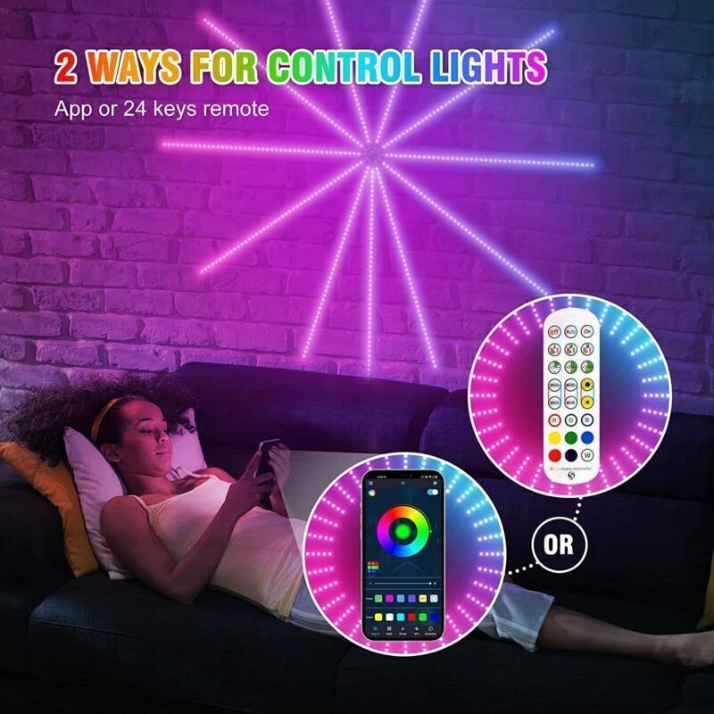 Product Description LED Firework Dream Color RGB Changing Strip Lights 5V Sync Bluetooth Music Product Description Music Firework Led Strip The high lumen LED make it great for decorating your living room, bedroom, porch, especially great for holidays and events like Christmas, Halloween, parties, anniversaries. It is a great gift for your family and friends. Anniversaries, Parties, Festivals, Christmas. Stunning Launch and Burst Effect 11 short LED strip and 1 long LED strip mimic the effect of a firework launched and burst into the sky. Especially stunning when multiple lights are arranged together on the wall. 24 Patterns + 3 Music Rhythm Modes The light is integrated with 24 preset patterns of light shows and 3 music Rhythm Modes. All controlled by the remote controller in the package, the quick controller on the USB cable, and the Bluetooth APP. You can also adjust the brightness and speed using these three ways 3 Music Rhythm Modes With the sensitive mic hidden in the controller, the light is able to pulse with the music it picks up. The 3 music Rhythm Modes will definitely give you a stunning light show with your favorite music/song. Easy DIY Make sure the wall is clean and dry. Use the adhesive on the back of the round control box to position on the wall. Insert and stick the light strips on the wall one by one. The long strip should be the one with USB cable. Connect the cable to any USB adapter or a power bank. Enjoy the light show. Smart Firework Lights for Bedroom Decoration Create a wonderful atmosphere for you, and enjoy your visual feast of lighting. 16 million colors, 213 dynamic modes, music sync, mic modes and timer etc. Package Include: 1.11×Short Firework Light Strip(Each is 0.5cm length) 2.1×Long Ray Firework Light Strip(1.5m length) 3.1×Wiring Board 4.1×Bluetooth Controller 5.1×IR Remote Cotroller 6.1×USB Power Cable 7.1×User Manual About Us Welcome to our store, your support is our biggest driving force for progress. All products in our store are sold at low prices, and quality is guaranteed. If you need it, please feel free to purchase it. We will definitely give you a most comfortable shopping experience! Our store provides high-quality goods and perfect after-sales service, allowing you to buy with confidence and comfort! Payment We prefer PayPal. If there is a product that you are interested in, please make the payment within 14 days. The payment notification will be sent to you via email, Import tariffs, taxes, and fees are not included in the project price or shipping costs. These expenses are the responsibility of the buyer. Please confirm these additional fees with your country's customs office before bidding/purchasing. We will ship to the address provided by eBay, and all buyers must confirm their shipping address before making payment. shipping The goods are shipped from China, usually within 15 to 30 working days, or around 45 days in remote areas. Considering uncontrollable factors, please be patient and we will do our best to provide the most economical and reliable transportation services. But sometimes international express delivery relies heavily on local customs and postal services. If you did not receive your item on time, please contact us immediately for further assistance. We will solve all problems related to the product. terms We are committed to create a better service with excellent quality product, speed delivery, advanced technology and competitive price. returns If you are not satisfied with the product you purchased, please contact us immediately. We are happy to provide you with a return or refund within 14 days of purchase. During the return or refund process, we need you to provide us with your payment email and logistics information for the returned package. We will pay your postage and your refund will be received on time. Please rest assured. contact us If you have any questions, please leave a message on eBay to contact us. Our working hours will resume within 48 hours. Our working hours: 9:00 am to 6:00 pm Beijing time, Monday to Saturday If you are satisfied with our service, please give us positive feedback and provide us with a detailed seller rating of 5 stars per region. Alternatively, we can add our store as a favorite, and we will remind you when there are new or active events in the store. Thank you for your understanding and support, and wish you a happy life! powered by