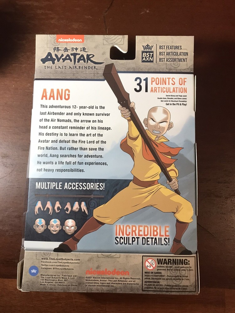 THE LOYAL SUBJECTS BST AXN Aang (Avatar: The Last Airbender) ACTION FIGURE NIB Combined shipping is always YES Loaded with 31 points of articulation for dynamic posing, Aang is ready to master the four elements on your figure shelf! With three sets of removable hands and three interchangeable face plates, channeling Aang’s Avatar State is just a face swap away when you add this Avatar: The Last Airbender figure to your collection. Plastic Approx. 5” tall Imported This adventurous 12-year old is the last Airbender, and only known survivor of the Air Nomads, the arrow on his head is a constant reminder of his lineage. His destiny is to learn the art of the Avatar, and defeat the Fire Lord of the Fire Nation. Rather than save the world, Aang searches for adventure. He wants a life full of fun experiences, not heavy responsibilities. 1:15 scale with 31 pts or articulation including butterfly joints at the shoulder, bicep swivel, upper thigh swivel, and great rotating ball joints for maximum posing. Packaged in a unique window box with a great insert that doubles as a diorama. Also included are two additional head portraits with great Aang expressions, three-sets of hand gestures, Aang’s glider staff, and his pet lemur, Momo. A must have for the Anime enthusiast!