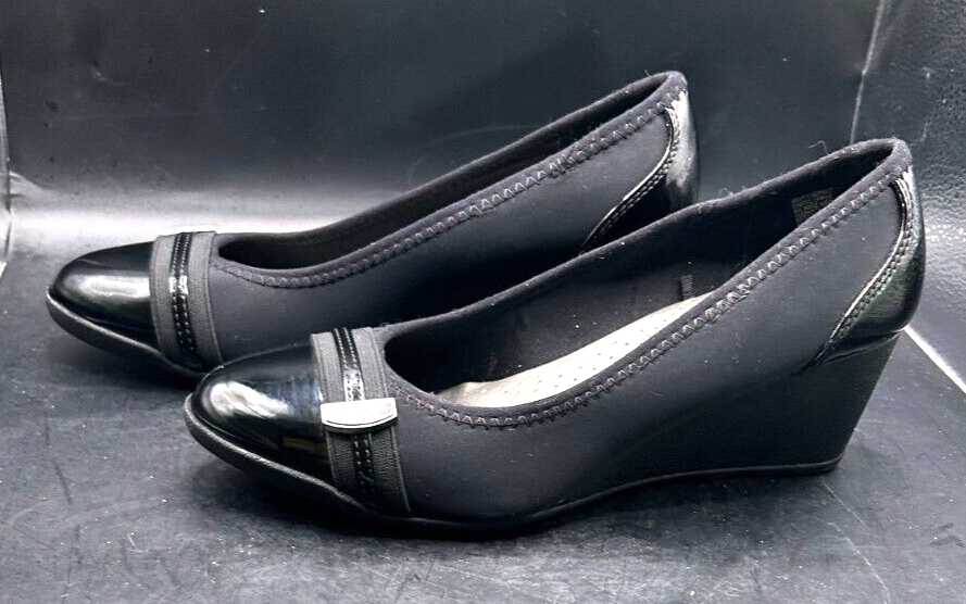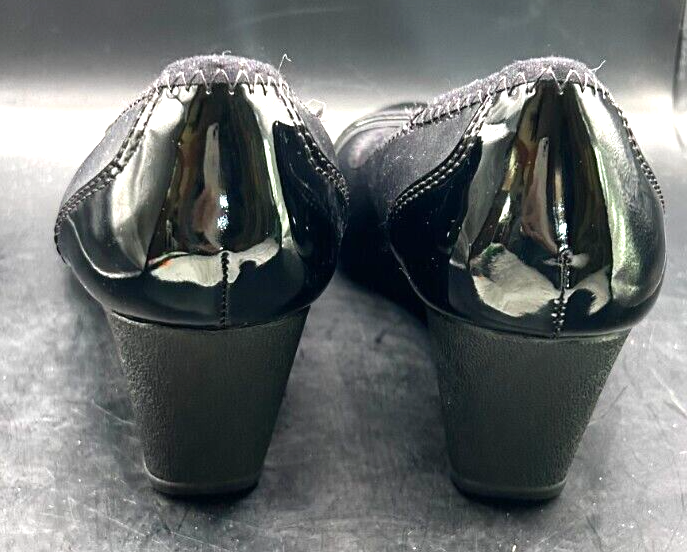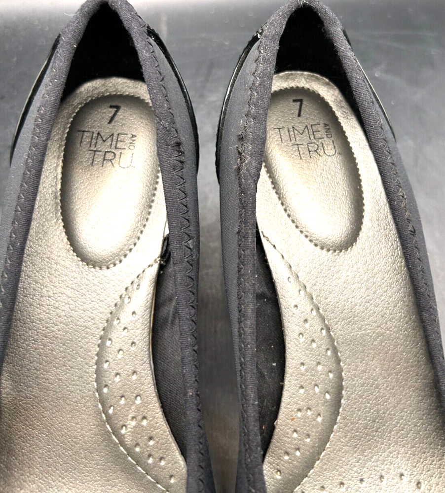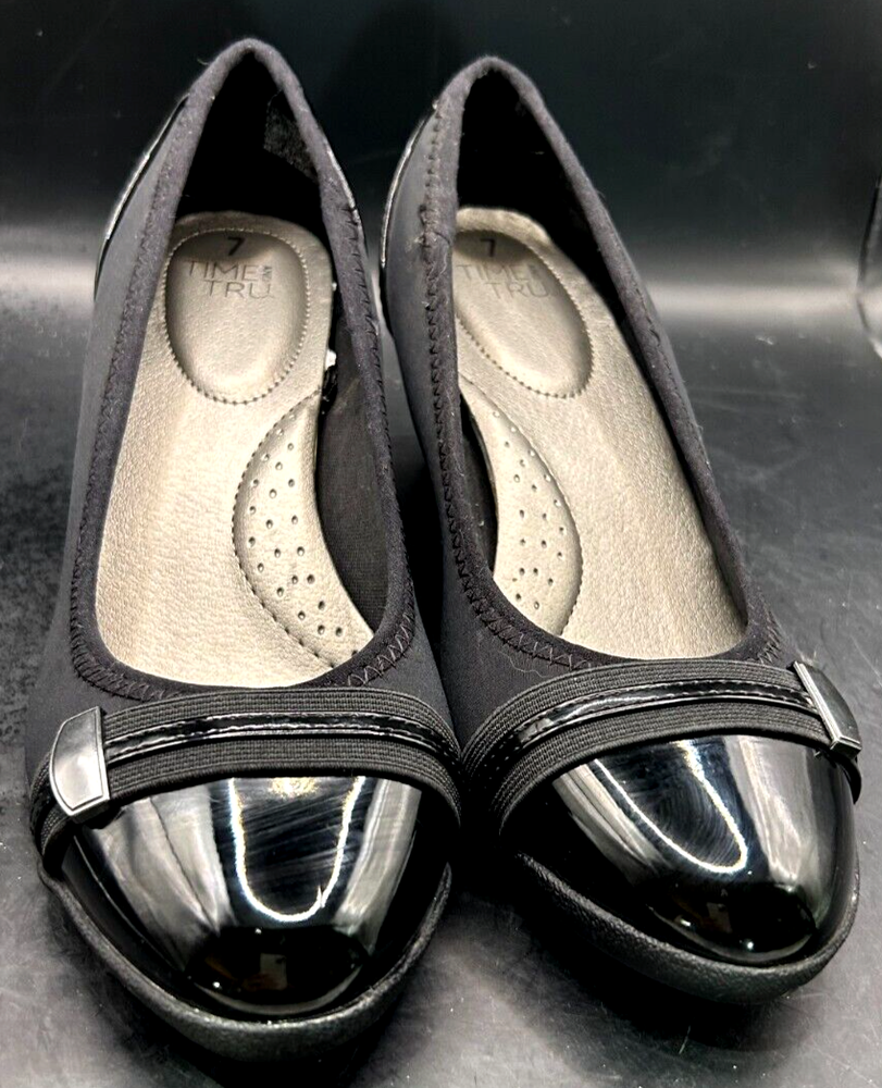 These TIME AND TRU Women's Platform Pumps in black feature a solid pattern with closed toes and a slip-on closure for easy wear. They have a comfortable mid-height wedge heel and are crafted from a combination of polyester and TPR for the upper material, while the lining and insole are made of leather. The elegant design is suitable for work or casual occasions, making them a versatile addition to any wardrobe in a size 7.