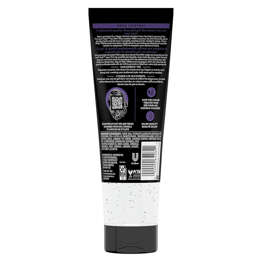 Product Description Tresemme Tres Two, Mega Control, Hair-Gel, for 24-Hour, Frizz Control #5, 9 Ounce (Pack Of 12) TRESemmé Mega Frizz Control Hair Styling Gel, Need a styling gel that delivers mega hold without feeling stiff or sticky? TRESemme Mega Control Hair Gel provides all-day resistance to humidity and keeps your style going strong without crunchy stiffness. After you put the work into your style, you better lock it in before you lose it. Sprays work best to lock in some styles, but when you're aiming for a sleek, tight look, you should use a styling hair gel for extra hold and humidity control. Built for control and ready to be styled, TRESemme Mega Control Hair Gel is an anti-frizz gel, giving you all-day hold with built-in 24-hour humidity protection. This mega control hair gel is perfect for slicking, shaping, or sculpting hair for that perfect look. Our unique, alcohol-free hair gel formula is great for all hair types and designed to keep your hairstyle on lock without leaving hair looking wet or feeling sticky. Step 1: Prep your hair with your favorite TRESemme shampoo and conditioner and hair styling products. TRESemmé Mega Frizz Control Hair Styling Gel, 9 oz MEGA FIRM STYLING HAIR GEL: TRESemmé Mega Control Hair Gel is a styling gel that adds long-lasting shine and mega hold to your hair for all-day control ANTI-FRIZZ GEL: This alcohol-free hair styling gel delivers all-day control with humidity resistance to help keep frizz away MAXIMUM HOLD: TRESemmé Mega Control Hair Gel is a stiff hair gel that locks in your style without ever looking sticky or wet TREND LED, RIGOROUSLY TESTED: Every ingredient is carefully selected to ensure your hair receives the best possible care. We do not test on animals and our hair products are PETA-approved HAIR CARE TIPS FROM OUR STYLISTS: Dispense a quarter-size drop into your hands and use your fingers to evenly coat damp hair, creating your desired style. Add more gel as needed FRIZZ FREE: Formulated with coconut oil, this formula gives all-day hold and 24-hour humidity resistance for resilient styles ALL-DAY HOLD: Level 5 hold, our strongest hold hair gel, is Infused with coconut oil. Achieve moisturized hair without compromising on hold CRUELTY-FREE: TRESemmé prohibits animal testing for our hair products and the ingredients used in them, anywhere in the world DO IT WITH STYLE: With professional quality hair products like our Mega Control Alcohol-Free Gel, you can confidently create your personal style Super firm control. Resistance To Lock Out Frizz And Lock In Style All Day Holds For 24 Hours In High Humidity Mega Firm Control For All Hair Types Product Benefits Humidity Resistant, Frizz Control Hair Type Curly Material Type Free Mineral Oil Free, Sulfate Free, Alcohol Free, Aluminum Free, Formaldehyde Free Scent Unscented Liquid Volume 9 Fluid Ounces Ingredients WATER (EAU), VP/DIMETHYLAMINOETHYLMETHACRYLATE COPOLYMER, PPG-5-CETETH-20, PHENOXYETHANOL, TRIISOPROPANOLAMINE, OLETH-20, CAPRYLYL GLYCOL, CARBOMER, PVP, SORBITOL, FRAGRANCE (PARFUM), PROPYLENE GLYCOL, PEG-12 DIMETHICONE, DISODIUM EDTA, PANTHENOL, COCOS NUCIFERA (COCONUT) OIL, BENZYL ALCOHOL, CITRONELLOL, GERANIOL, HEXYL CINNAMAL, LIMONENE, LINALOOL, EXT. VIOLET 2 (CI 60730).