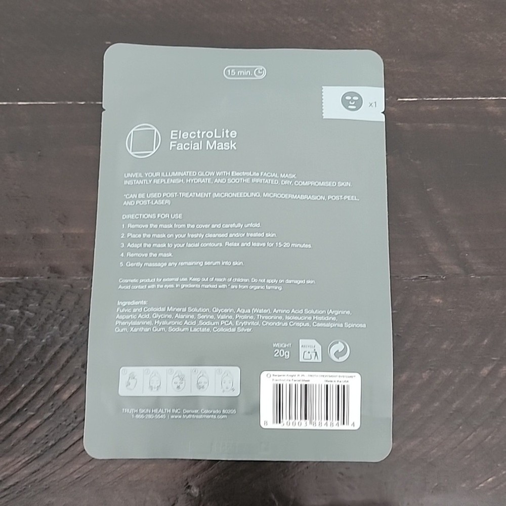 NEW & SEALED TRUTH TREATMENT SYSTEMS ElectroLite Facial Mask. One mask. One time use. Hydrating. Treatment. Skincare. "Unveil your Illuminated Glow with Truth Treatment Systems Electrolite Facial Mask. Instantly nutriate, hydrate, and soothe irritated, dry, compromised skin. Our Electrolite Facial Mask delivers a high dose of Hyaluronic Acid paired with Fulvic and Colloidal Minerals for a plump and glowing appearance. Fulvic and colloidal minerals are powerful skin antioxidants. They stimulate skin cell and fibroblast activity, improve healing time and support overall skin health. Oxygen and water trapping ingredients leave skin soft, bright and hydrated. Hyaluronic Acid reduces the appearance of fine lines and wrinkles and provides powerful antioxidant benefits." Truth Treatment Systems Truth Treatments. Ben Fuchs. Skin. Skincare. Beauty. Cruelty free. Clean beauty. Skin mask. Face mask. Spa. Facial. Condition: NEW & SEALED ✔ NEXT DAY SHIPPING ✔ NON-SMOKING ✔ NO TRADING 0063 - 1 / 0 / 2 oz
