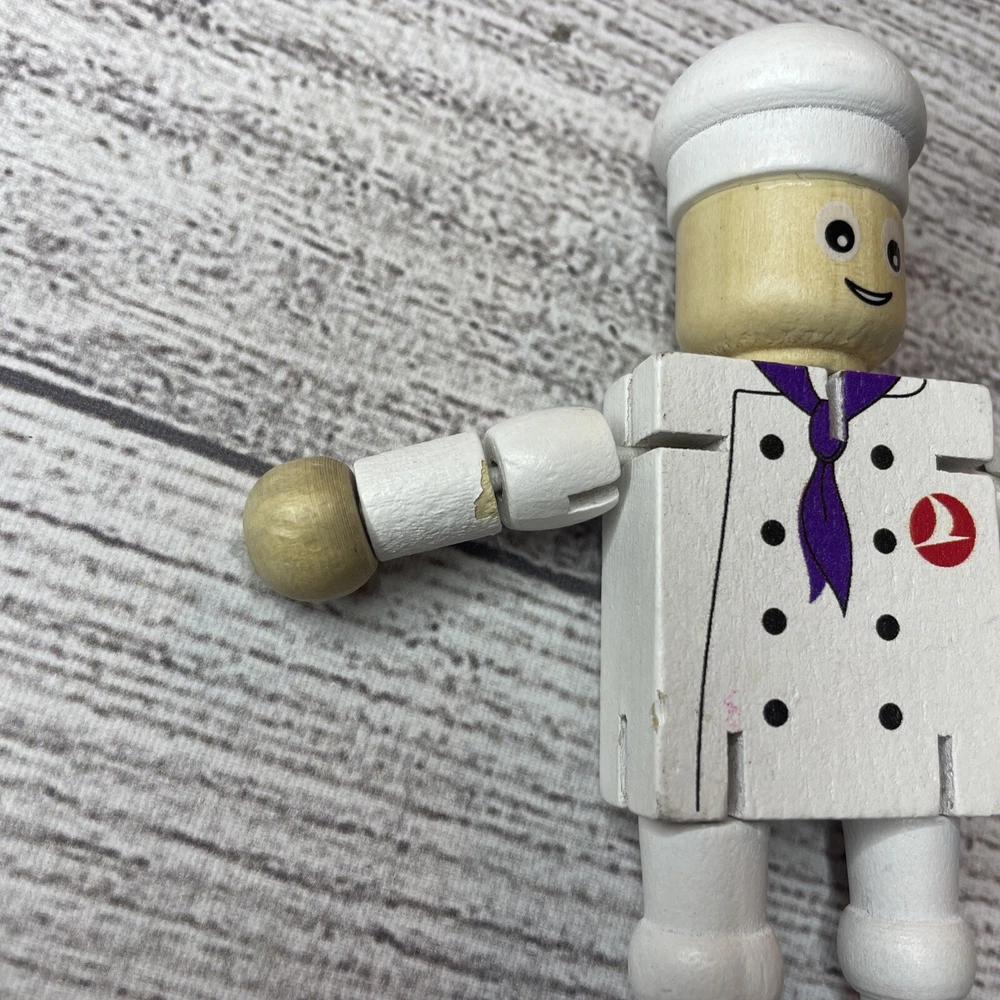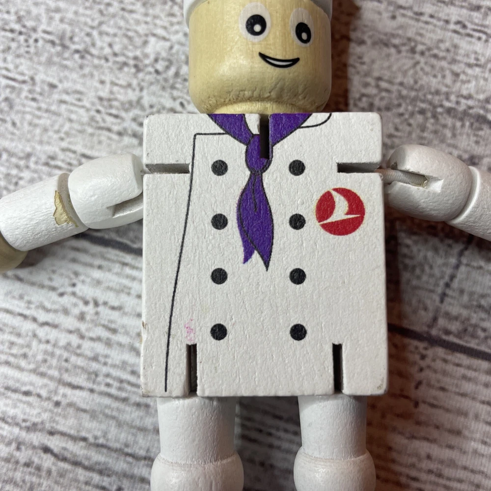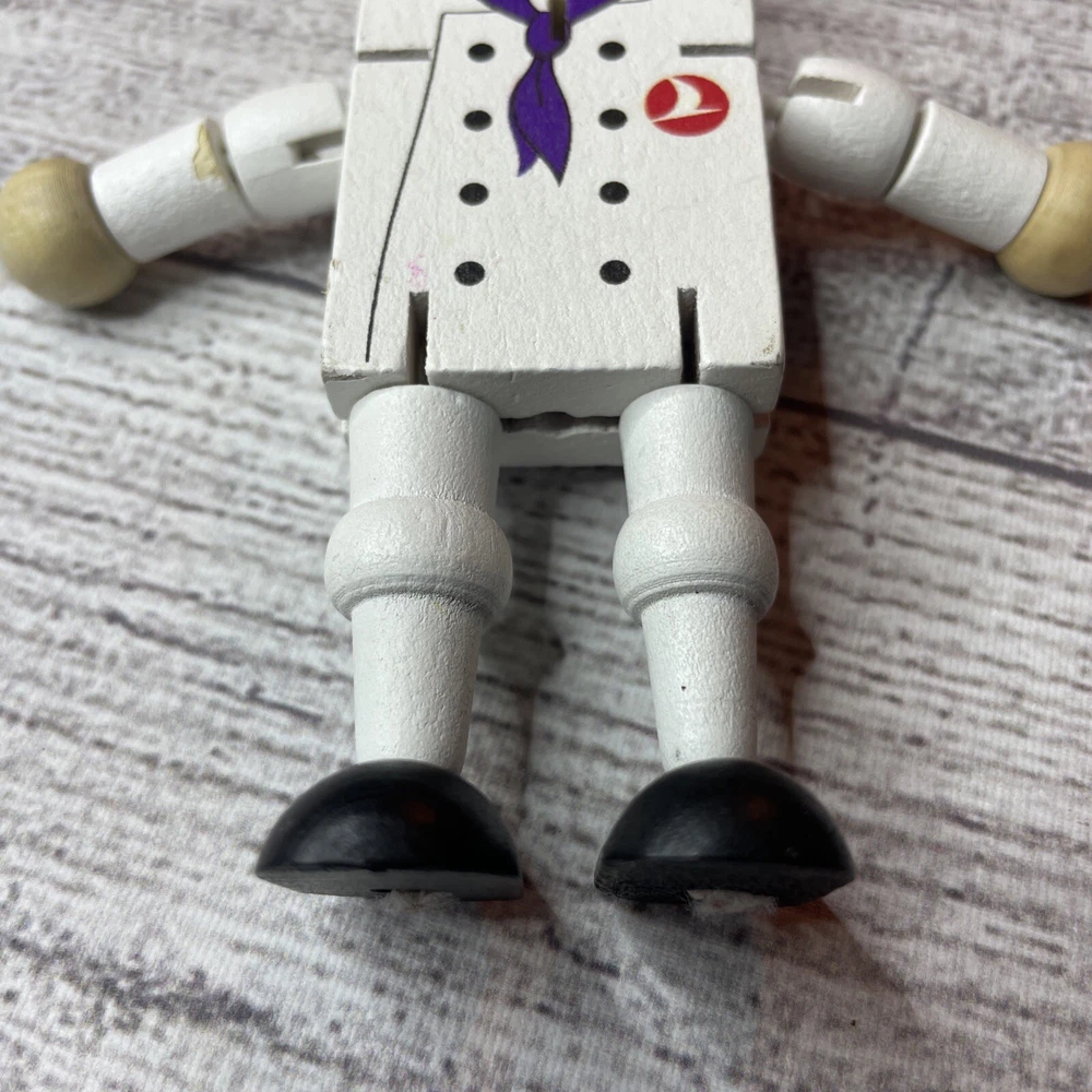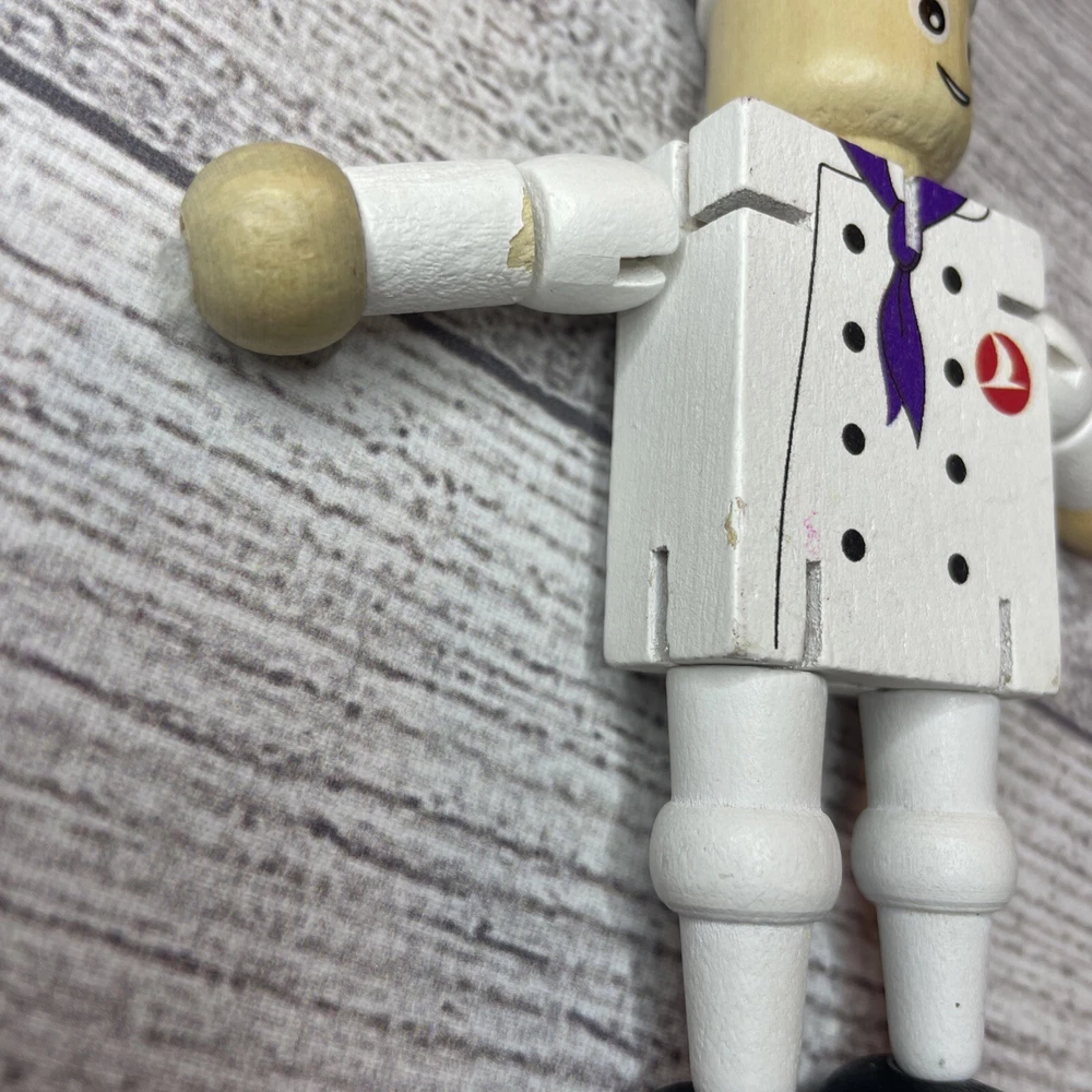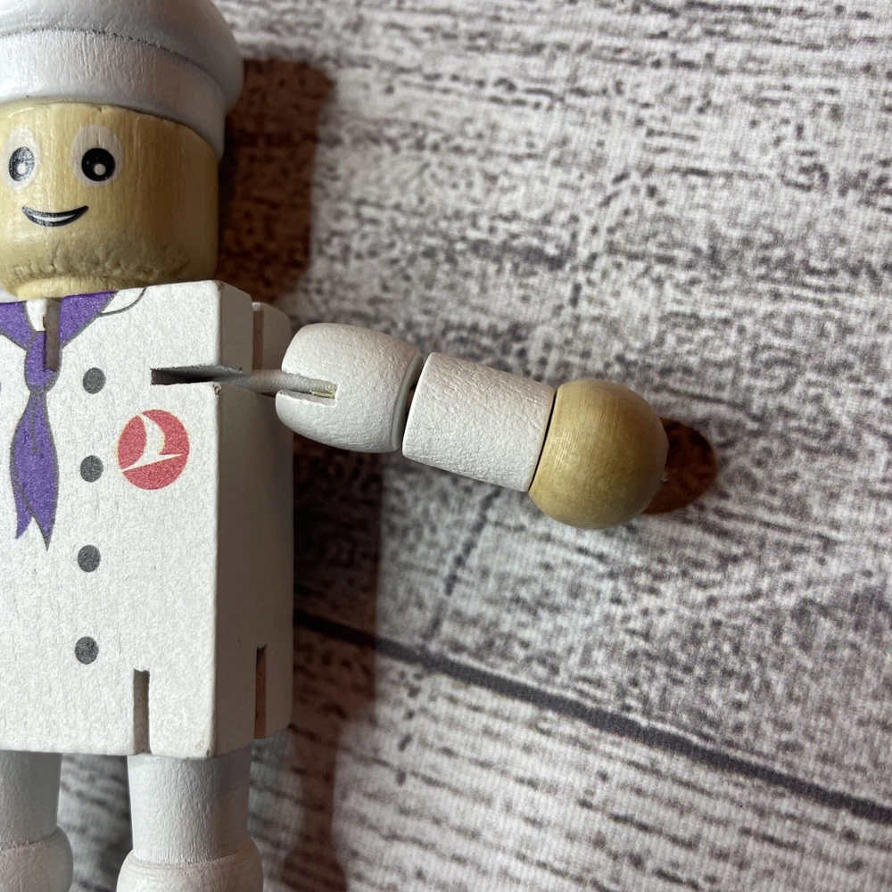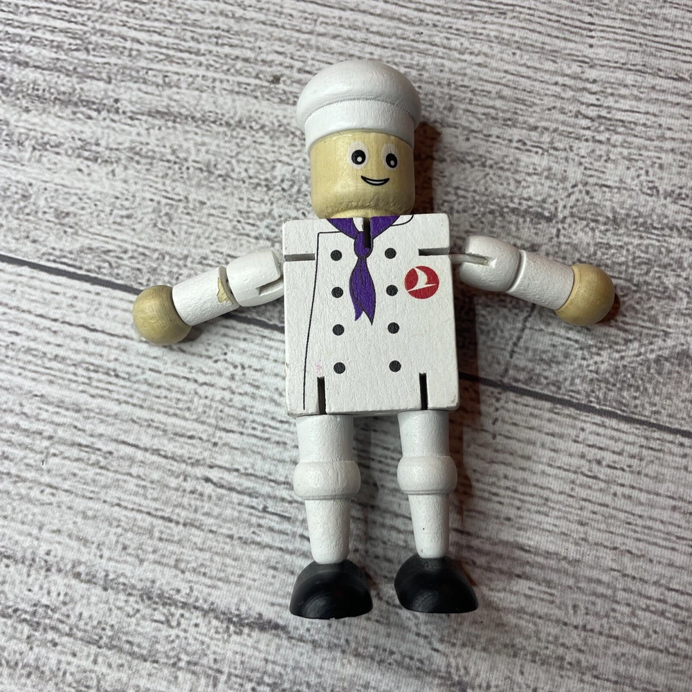 TURKISH AIRLINES SMALL WOODEN TOY DOLL COOK WITH MOVABLE ARMS & LEGS Approximately 4.5" Tall Good pre-owned condition. Does have some wear/chipped paint. Paint on body. Please see all pictures and measurements for most accurate description.