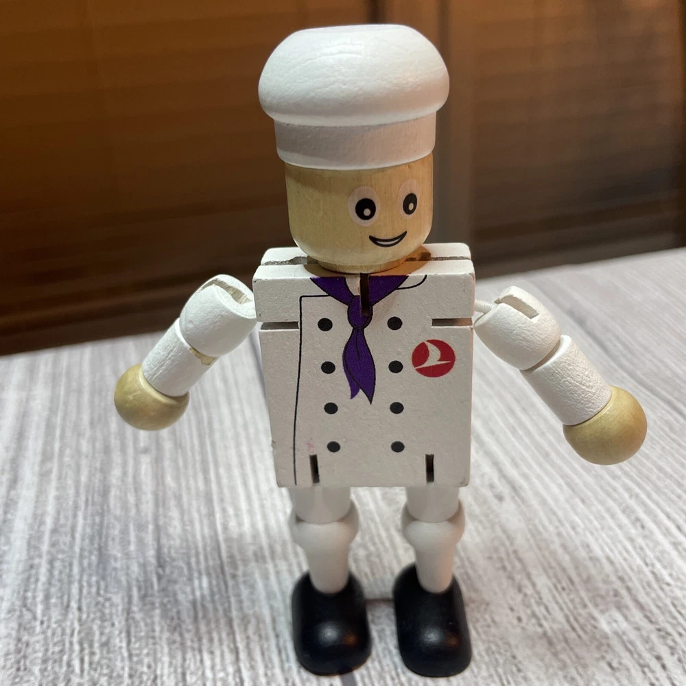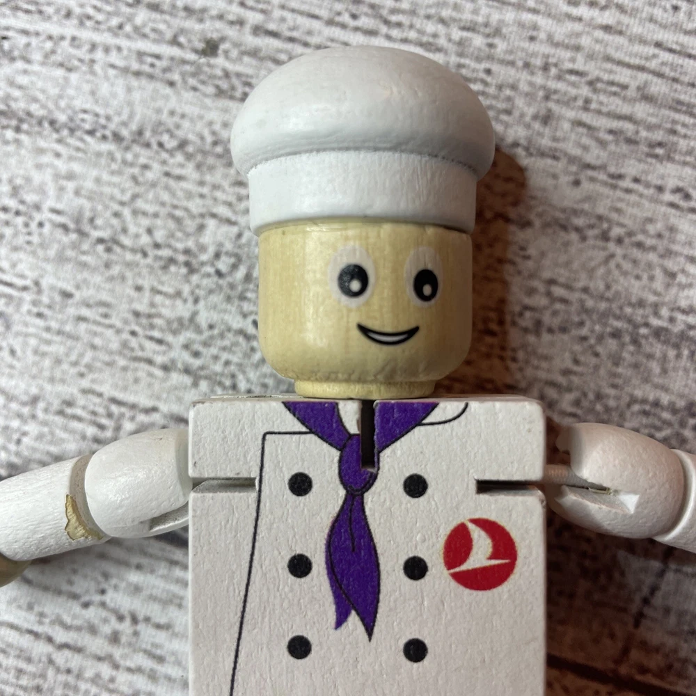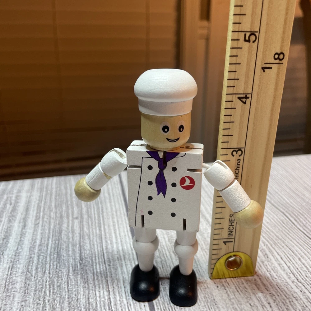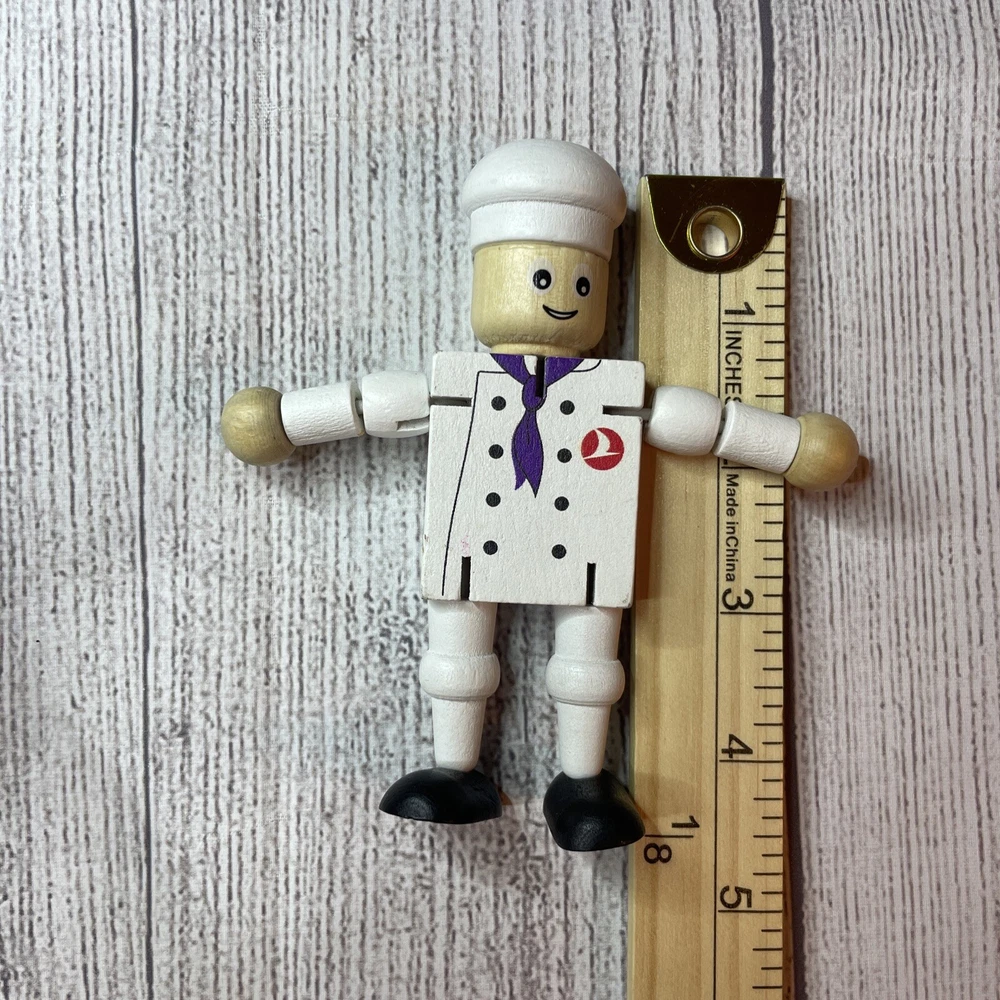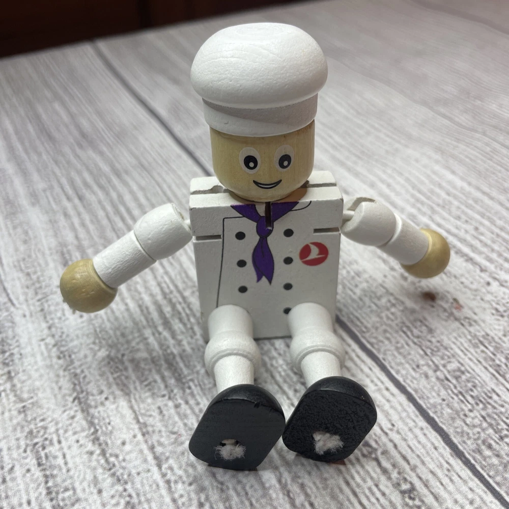 TURKISH AIRLINES SMALL WOODEN TOY DOLL COOK WITH MOVABLE ARMS & LEGS Approximately 4.5" Tall Good pre-owned condition. Does have some wear/chipped paint. Paint on body. Please see all pictures and measurements for most accurate description.