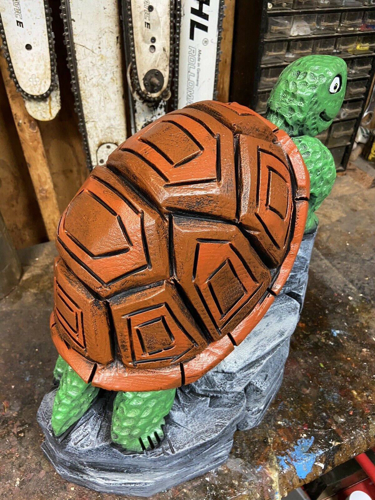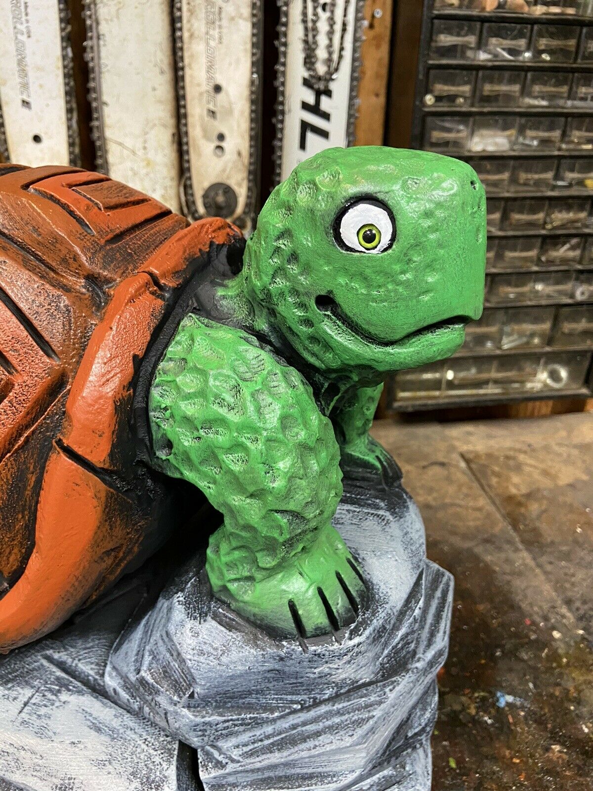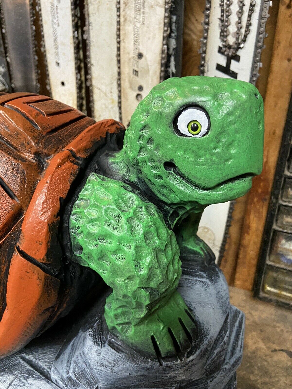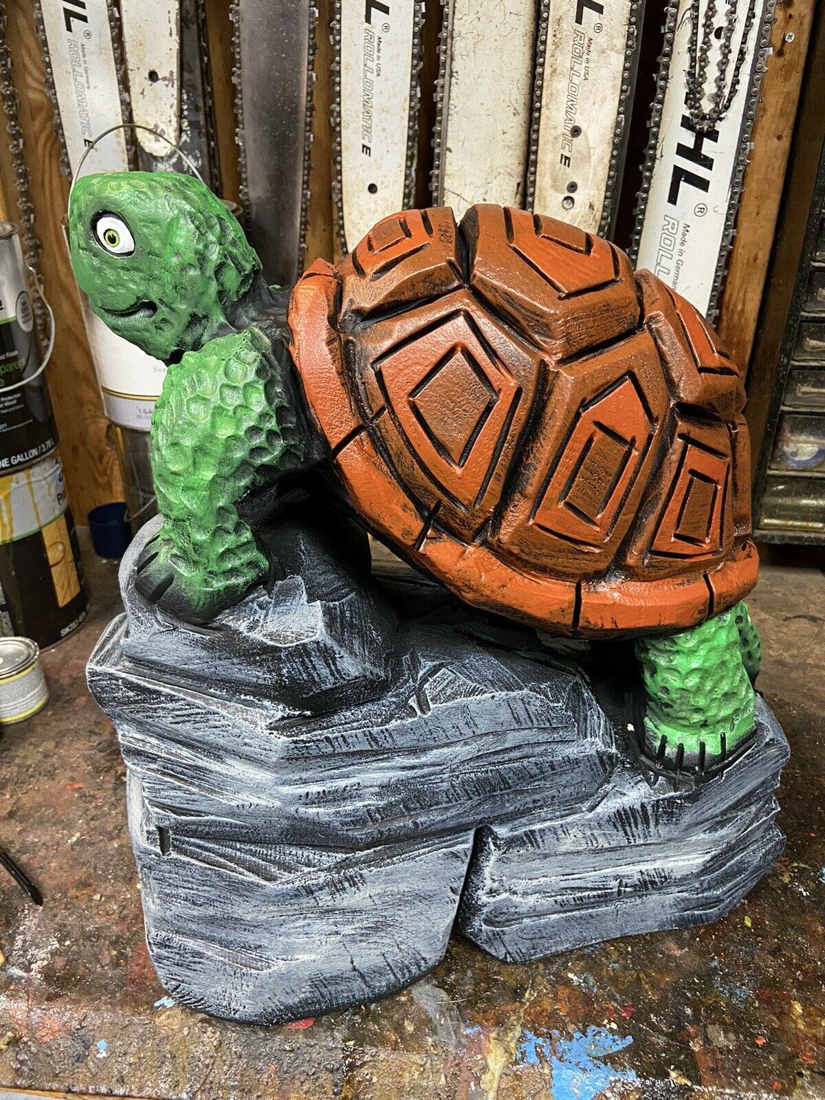 ~ YOU WILL RECEIVE THE EXACT ITEM PICTURED ~ MAKES A UNIQUE GIFT ~ ONE of a KIND! CHAINSAW CARVED TURTLE ON ROCKS, TORTOISE WOOD CARVINGS Statues UNIQUE ARTWORK, VERY DETAILED CHAINSAW CARVINGS, ANIMAL WOOD SCULPTURES, RUSTIC LOG CABIN, POND DECOR, GARDEN DECOR, OUTDOOR DECOR, HOME DECOR, BIRD & WILDLIFE WOOD CARVINGS. CARVED FROM WHITE PINE WOOD BURNED & SEALED\ STAINED WITH ZAR OIL BASED EXTERIOR POLYURETHANE & HAND PAINTED Appx: 18"(Tall=Base to top of Head), 18"Wide (across base), 24 LBS. OUR CARVINGS ARE MADE FROM RECYCLED TREE STUMPS & LOGS. A BIT OF CHECKING (CRACKING) IS THE NATURE OF LOG ART. TO KEEP CRACKS TO A MINIMUM PLACE YOUR CARVING AWAY FROM EXCESSIVE HEAT OR SUN. AN IDEAL PLACE FOR A WOOD CARVING IS OUTDOORS UNDER AN OVERHANG OR IN SHADE EACH PIECE IS UNIQUELY HANDCRAFTED BY ARTIST JAMES HAGGART; NO 2 ARE EXACTLY ALIKE; ANY QUESTIONS PLEASE MESSAGE US ***PLEASE NOTE; RETURNS ONLY ACCEPTED IF ITEM WAS GROSSLY MISREPRESENTED*** ***PLEASE BE SURE TO CHECK OUT OUR OTHER AUCTIONS***