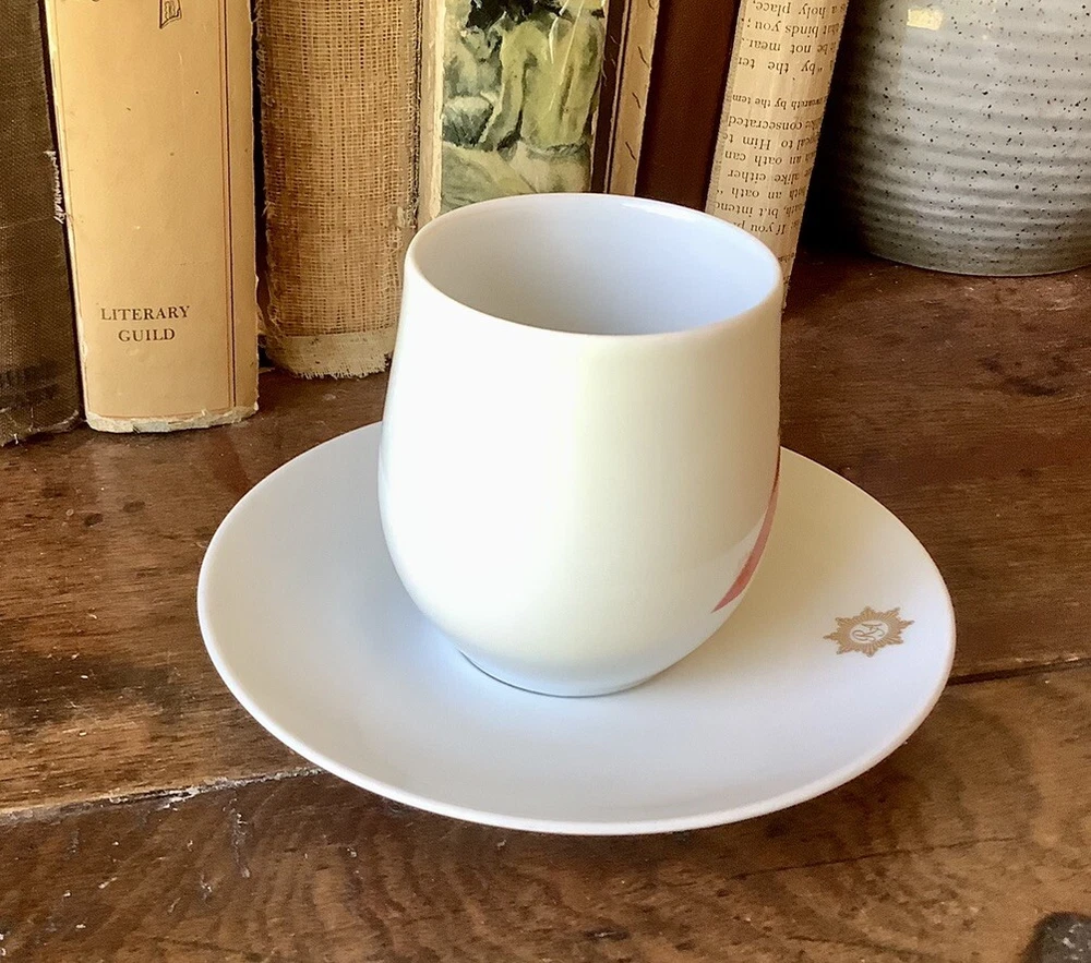 This cup and saucer set is a must-have for any aviation enthusiast or collector of airline memorabilia. Featuring the iconic TWA Airlines Royal Ambassador First Class design, this piece is a true gem for those who appreciate the golden age of aviation. Made in Germany by Rosenthal, this cup and saucer set is of the highest quality and is sure to impress any guest. The set includes a cup and saucer, perfect for enjoying a hot beverage or displaying as a decorative piece. Don't miss out on the opportunity to own a piece of history with this TWA Airlines Royal Ambassador First Class cup and saucer set.