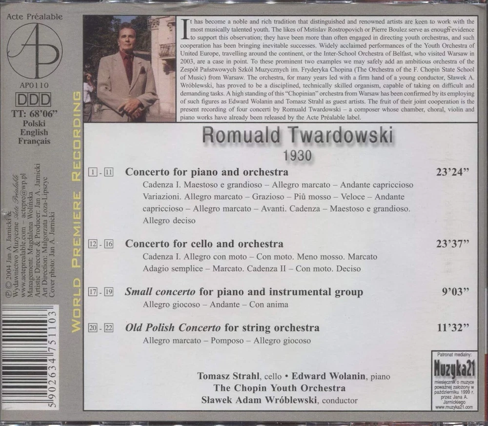 Further Details Title: Konzerte Condition: New Format: CD Description: EDITORIAL REVIEWS REVIEW Twardowski is hardly a household name in the Western world, but the pieces here will likely give listeners cause to take notice. The Piano Concerto of 1984 opens up as if to set the world on fire as a synthesis of Rachmaninov's 3rd and, especially, Prokofiev's 2nd and 3rd piano concertos. Elements are certainly to be found in the involved opening solo cadenza with its musical language, dark and sarcastic, often akin to Prokofiev. The theme brought out so dramatically in the cadenza is explored in a series of variations that form the entire concerto. A second theme is introduced. This is akin to Prokofiev or perhaps Rachmaninov in its uneasy beauty but somehow the boundary between the two composers has blurred. At any rate, the work is arresting, surprising, and is given exceedingly good presentation here. Why is this not on the world s stages now? The piano is well forward in this studio recording and the orchestra has good presence, but sounds somewhat compressed, rather like my 1980s-era recordings of Prokofiev's concertos on Melodiya by Postnikova/Rozhdestvensky. This may be partly why Prokofiev springs to mind on listening. However the main reason is the angular jauntiness of Twardowski's music. The Piano Concerto s near-relative is the following Cello Concerto, with which it has a very close connection especially in the structure of the piece. Both concertos are in one movement, starting with cadenzas, with variations of the main theme figuring heavily across the duration of the piece. The cello concerto differs in that it includes a more self-contained central episode before moving back to the variations of the main theme. The cello concerto's opening four notes immediately call forth the main theme of the piano concerto, but here the subsequent sound-world is more introspective; less sarcastic. This is a more intimate concerto, sonorous and a wonderfully meaty piece for the cellist. The main theme opens up as a river does after rapids to a lovely barcarolle with rocking strings behind the soloist. The tone is far more romantic than that of the piano concerto, and the central section (adagio semplice) melts through the speakers after the tension of the alternatingly-dissonant horns that come in before the soloist. The Small Concerto of five years earlier is far more brightly gregarious than its larger, darker-tempered sibling. Scored for smaller resources and of lighter texture, its opening statement reminds one immediately of music for the toy shop in various stage accompaniments of holiday plays. Composed with younger performers in mind, the orchestral backing is much more elementary than the pieces already encountered on this disc, and the scale of the movements is likewise reduced. Still, the piece is quite enjoyable; the central Andante, for almost the duration of the movement, is a lovely duo for piano and glockenspiel alone, with only a few supporting gestures by the strings. The fast final movement continues the overall impression of a toy or clock shop with its frequent use of melodic percussion. Brief and enjoyable. The final piece on this disc, the Old Polish Concerto for string orchestra, is one of the few repeats in the Acte Préalable catalogue it is also available, performed at a slightly slower pace by yet another youth orchestra, on AP 0120. This fits in as a fine complement to end the disc, and shows Twardowski casting a purposeful look backwards in terms of treatment of thematic material and form. The opening movement calls Prokofiev's first symphony also composed with a backward glance to mind, and as well, considering backward glances, elements of Grieg's Holberg Suite. ... [more] David Blomenberg --MusicWeb International Artist: TWARDOWSKI,R. No Of Discs: 1 Record Label: ACTEP EAN: 5902634751103 Missing Information? Please contact us if any details are missing and where possible we will add the information to our listing.