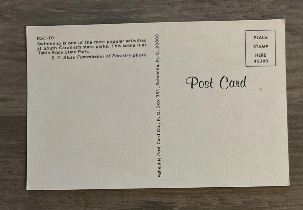 Size:Standard (5.5 x 3.5 in)Continent:North AmericaNumber of Items in Set:1Unit of Sale:Single UnitUPC:does not applyCountry/Region of Manufacture:United StatesEra:Photochrome (1939-Now)Original/Licensed Reprint:OriginalType:Printed (Lithograph)Postage Condition:UnpostedCity:Table RockFeatures:Chrome, Divided Back, PanoramicRegion:South CarolinaSigned:NoCountry:United StatesSubject:SwimmingTheme:Advertising, Community Life, Holiday, People, Roadside America, Tourism, Travelgtin13:does not apply