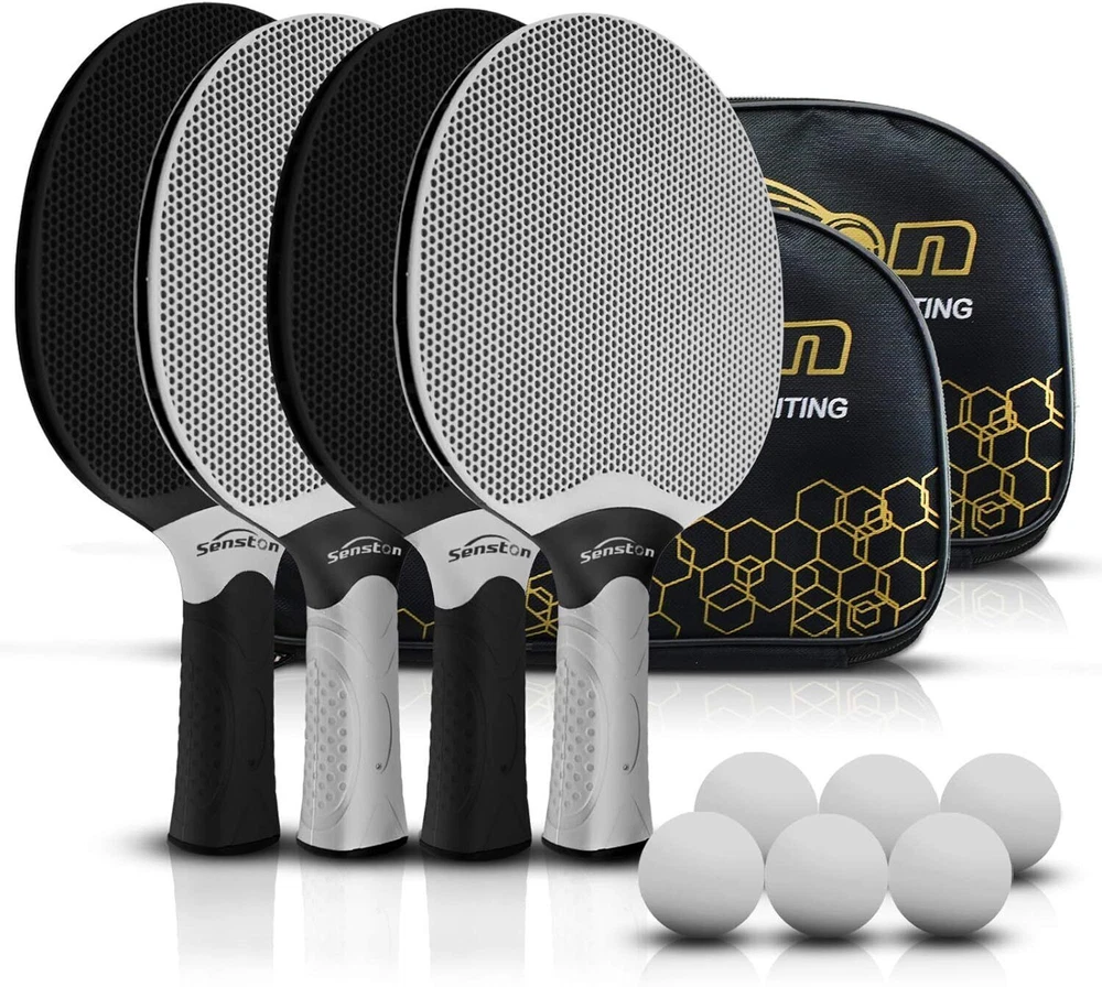 Color Black&White Material rubber Product Dimensions 10"L x 4"W x 1"H Sport Table Tennis Item Weight 666.2 Grams Assembly Required No Number of Players 4 Base Material Wood Frame Material Wood See less About this item RUBBER TABLE TENNIS BATS: Premium quality provides better experience; Soft composite grip making it much more comfortable to hold; Handles have rubber coating and feels very natural in your hand INDOOR OR OUTDOOR: Our high quality racket that does a great job providing control, speed, and comfort, great for beginner, intermediate and professional player! RUBBER TABLE TENNIS PADDLE: Premium quality provides better experience; Soft composite grip making it much more comfortable to hold; Handles have rubber coating and feels very natural in your hand EXCELLENT QUALITY: The table tennis rackets features with water-proof, shock resistant, strong and durable, and the rubber is tacky enough to spin the ball perfectly;The racket designed firm so that can be used by adults & Color Black&White Material rubber Product Dimensions 10"L x 4"W x 1"H Sport Table Tennis Item Weight 666.2 Grams Assembly Required No Number of Players 4 Base Material Wood Frame Material Wood Recommended Uses For Product Table Tennis Top Material Type Wood Age Range (Description) Kid/Adult Item Package Dimensions L x W x H 11.26 x 7.24 x 2.91 inches Package Weight 0.83 Kilograms Item Dimensions LxWxH 5.8 x 5.8 x 9.7 inches