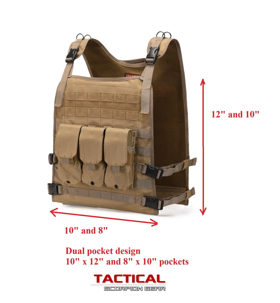 Tactical Scorpion Gear Body Armor Carrier Wildcat MOLLE Vest Tactical Scorpion Gear has taken the armor plate carrier to the next level. We have incorporated a ventilated interior mesh to provide the wearer with the ultimate in cooling . Double stitched seams and “X” stitching at all ends for the strongest construction. We utilize Military grade Ripstop Nylon material for all the construction, even for the optional accessories . Heavy Duty straps and Clips are utilized throughout. Double closure Velcro and snap Plate pockets to keep then secure. Tactical Scorpion Gear Wildcat MOLLE carrier vest . This vest provides Dual pockets for the front and rear armor 8" x 10" or 10″ x 12″. Made of 600D military grade ripstop nylon. Heavy duty ITW style clips. Easily and readily accepts all MOLLE accessories. Made for quick and easy placement for in case of emergency. Sides adjust quickly with quick release buckles. Size: Fully adjustable shoulder straps and girth - Small to XXLarge Emergency Drag Handle Shoulder straps quickly adjust Ventilated mesh interior Dual pocket design with Hook / loop and snap safety closures 7 MOLLE rows front and rear of vest TERMS AND CONDITIONS By purchasing the body armor contained in this listing from East West Consolidated, LLC, d/b/a Tactical Scorpion Gear ( “ Seller ” ), you ( “ Purchaser ” ) agree to be bound by the following terms and conditions: 1) Purchaser represents that s/he is at least 18 years old or the age of majority in the State or Territory in which s/he resides. 2) Purchaser is not a convicted felon at the time of purchase. 3) Seller will not sell body armor to any citizen or resident of the State of Connecticut. 4) Purchaser is legally allowed to purchase, possess, and/or use the purchased item(s) in Purchaser ’ s State/Territory, County/Parish, and municipality, and affirms that such purchase does not violate any federal, state, or local laws. 5) Seller makes no representations to Purchaser about the legality of any Purchase of body armor. Seller makes no representations about the consequences to Purchaser in the event Purchaser buys the body armor in contravention of any applicable federal, state, or local law. Purchaser is encouraged to seek qualified legal counsel in his/her jurisdiction if Purchaser has any questions concerning ab federal, state, or local laws. 6) Seller is not responsible for Purchaser ’ s violation of any federal, state, or local law concerning the Purchaser ’ s purchase, use, re-sale, other distribution of any body armor obtained from Seller. This disclaimer applies to any re-distribution within or outside of the United States. 7) Seller will cooperate with any federal, state, or local law enforcement agency investigating the purchase or use of body armor by the Purchaser. 8) Purchaser is not buying the body armor on behalf of another person in an effort to avoid compliance with these Terms and Conditions or to circumvent any applicable federal, state, or local law. 9) Although Seller ’ s body armor is tested to withstand bullets, the armor is bullet resistant and not bulletproof. Body armor will not protect someone from injury or death in all circumstances. Body armor will not provide any protection for the parts not covered by the armor. Purchaser acknowledges that there is always a risk of injury, including serious injury or death, if struck by a bullet while wearing body armor. 10) To the fullest extent permitted by law, Purchaser and his/her heirs, assigns, successors, and agents agree that Seller is not liable for any injury, including serious injury or death, that may occur during the use of Seller ’ s body armor. To that end, Purchaser and his/her heirs, assigns, successors, and agents, release, discharge, indemnify, and hold harmless Seller for any liability from the purchase, possession, or use of the body armor. Purchaser and his/her heirs, assigns successors, and agents specifically disclaim any right to any damages from Seller, including compensatory damages, incidental damages, consequential damages, punitive damages, costs, and attorney ’ s fees. 11) Any statements, images, or descriptions of body gear herein, including all photographic and video depictions, are for informational purposes only, and do not constitute a warranty of the products in any way. 12) Seller specifically disavows and disclaims any representation, implied or express warranty, or liability related to the condition or use of the items sold. Every item is sold AS IS and WITH ALL FAULTS. BUYER ASSUMES ALL RISK AS TO THE QUALITY AND PERFORMANCE OF THE PRODUCT. ALL WARRANTIES, INCLUDING THE WARRANTIES OF FITNESS FOR A PARTICULAR PURPOSE AND MERCHANTABILITY, ARE HEREBY EXCLUDED. NO ORAL AGREEMENTS OR WARRANTIES OF ANY KIND SHALL BE BINDING UNLESS IN WRITING AND SIGNED BY SELLER. The Terms and Conditions are effective as to the Purchaser on the date of the purchase of the body armor and supersede all prior oral or written Terms and Conditions between Purchaser and Seller. These Terms and Conditions may be updated, revised, or changed without prior notice.
