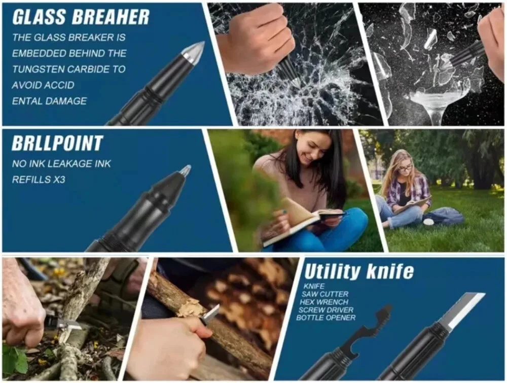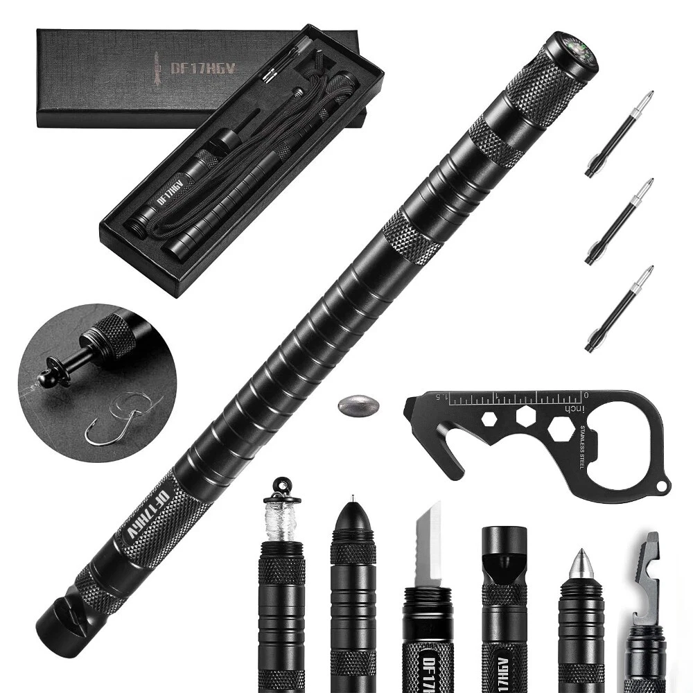 Specification: Color: Black Product size: length 190mm*width 15mm Material: aluminum alloy + stainless steel Weight: 120g Surface Treatment: Oxidized Applicable environment: help, training, writing, cutting things, bottle opener, compass, twisting screws, broken windows, etc. package includes: Tactical pen*1