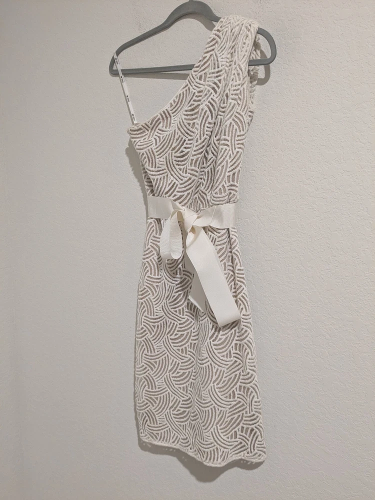 Tadashi Shoji White Cream Embroidered One-Shoulder Belted Tie-Waist Sheath Dress Elegant Classy Evening. Great pre-owned condition overall, aside from minor flaws. Size 2. Has some stretch. Fully lined. Soft embroidery. Soft and smooth interior. Polyester lining. Belt is sewn in. *Faint stain at front hem - not easy to notice due to the detailing of the dress. *Very faint stain on back hem, left side of seam. *Faint discoloring at both armpits. Length: 37" Pit to pit: 15" Waist: 12"