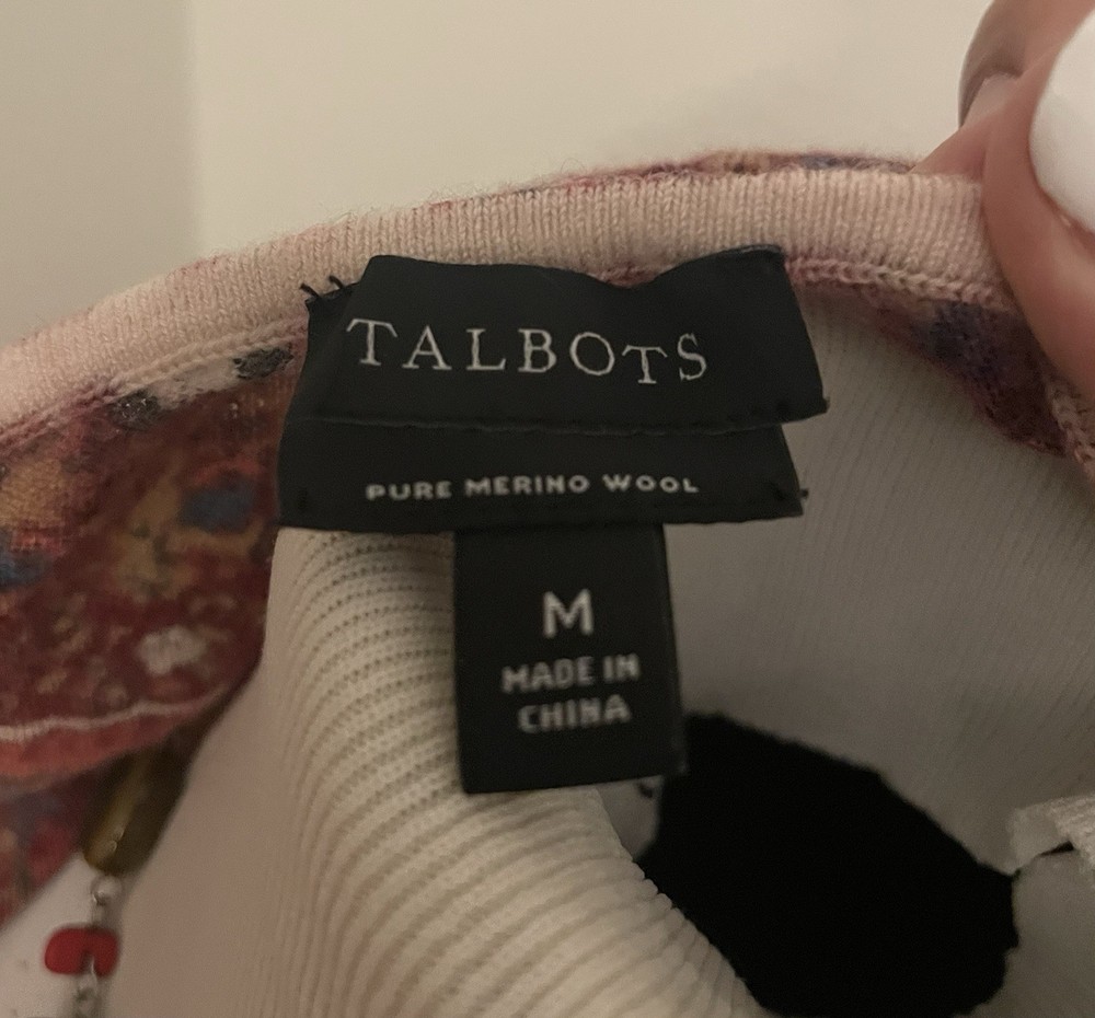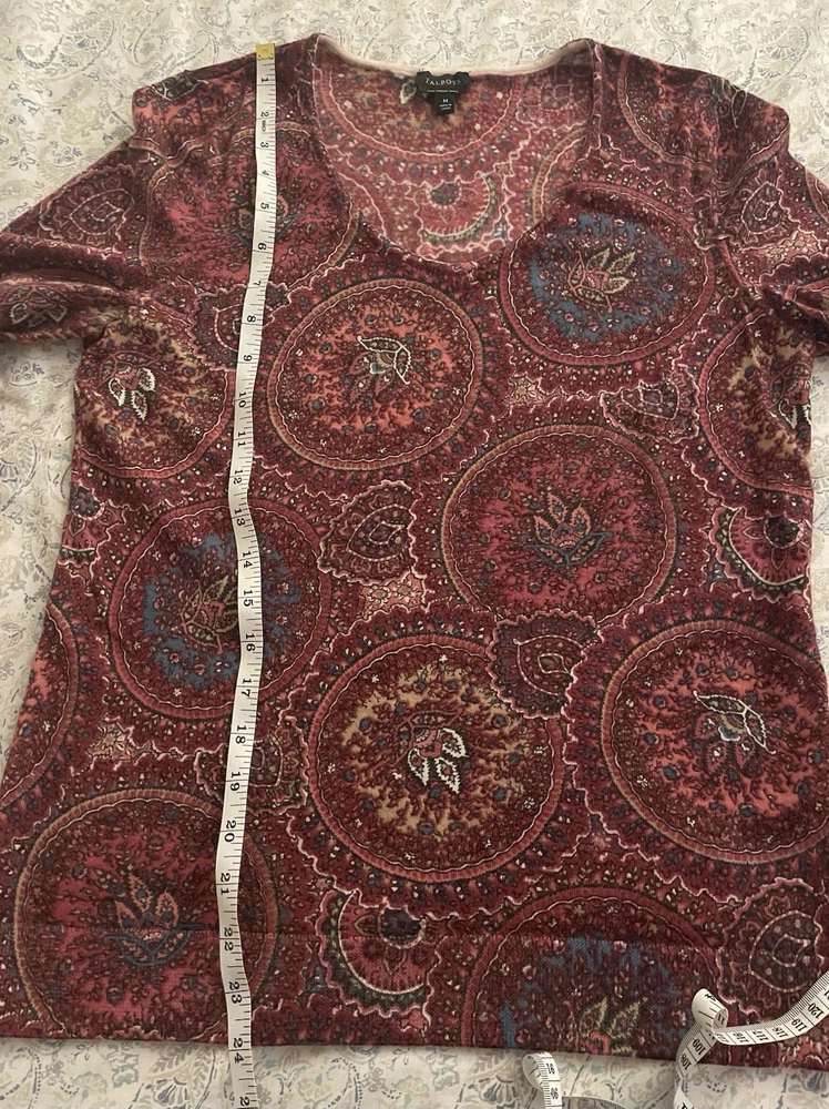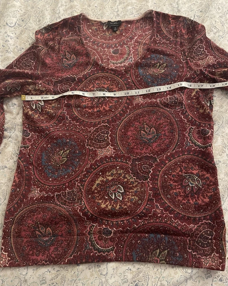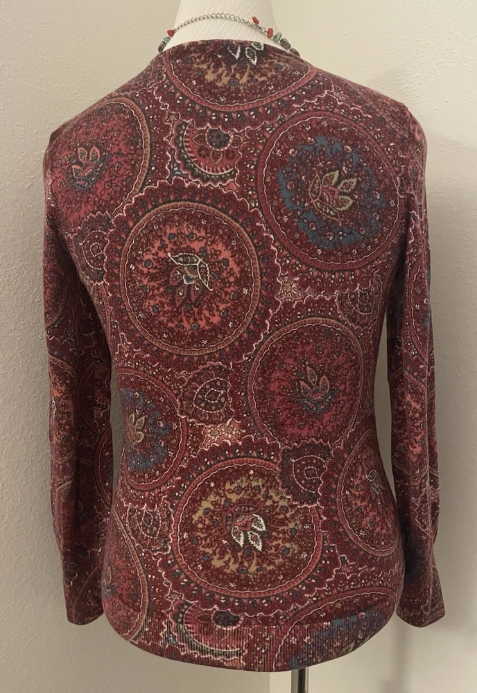 This Talbots Merino Wool Paisley Sweater in a women's size M features puff sleeves and a classic knit design in a beautiful red color. Made with 100% Merino Wool, this sweater is both comfortable and stylish, making it perfect for various occasions such as travel, parties, casual outings, and business meetings. The paisley pattern adds a touch of charm to this timeless piece, which is sure to become a staple in any woman's wardrobe.