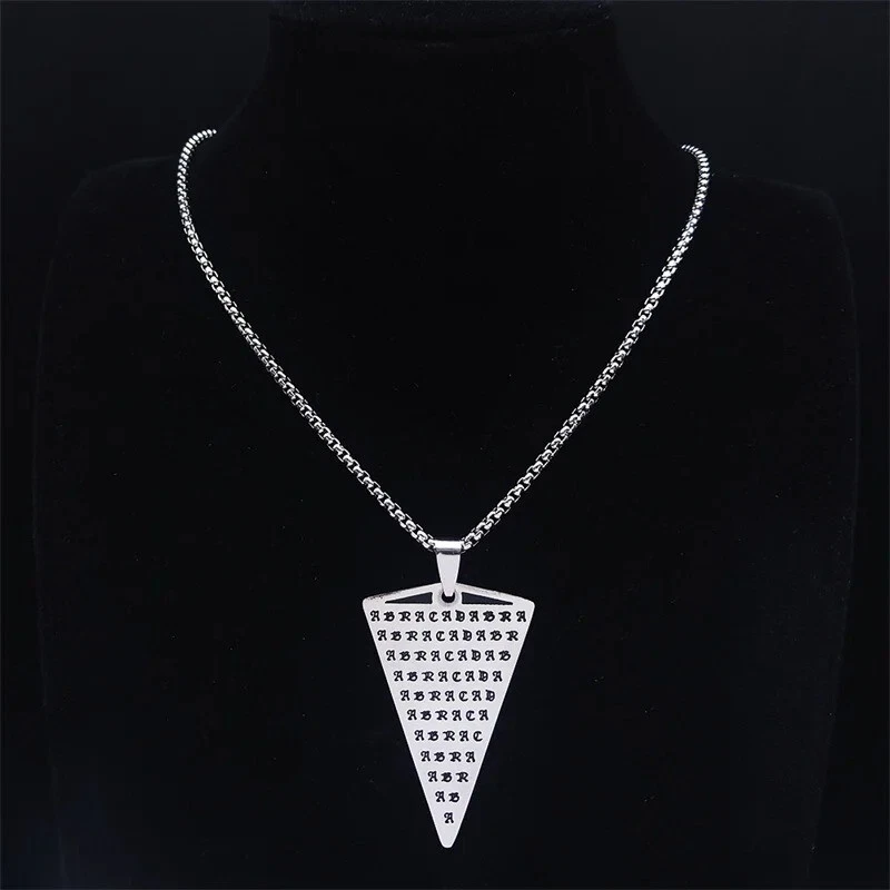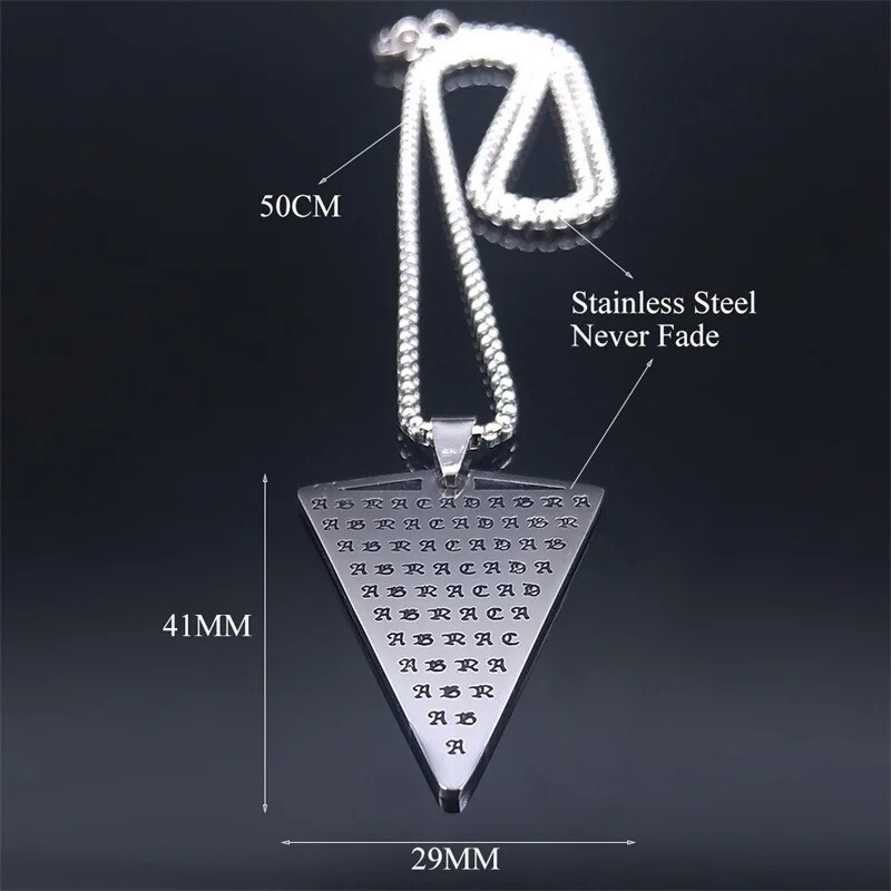 Inverted triangle in which is engraved the famous magic formula of Aramaic origin : ABRACADABRA from the practical Kabbalah. It consists of the Hebrew words: baraq=lightning and davar=word, incremented by three aleph, at the beginning, in the middle and at the end. Abracadabra is therefore detailed in Hebrew: Aleph Beth Reysh Qof Aleph Daleth Beth Reysh Aleph. A very powerful formula. Pendant width: 29mm Pendant height: 41mm Necklace length:50cm