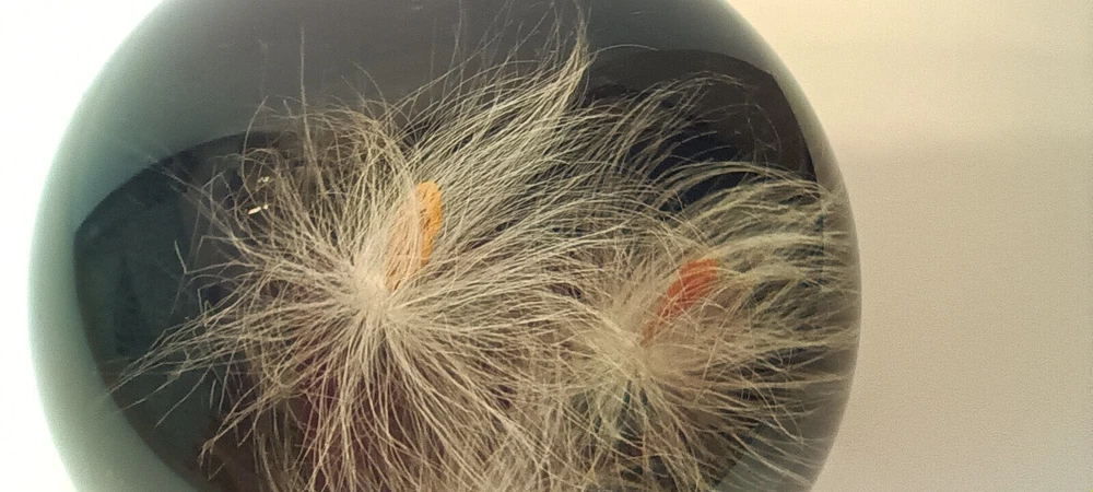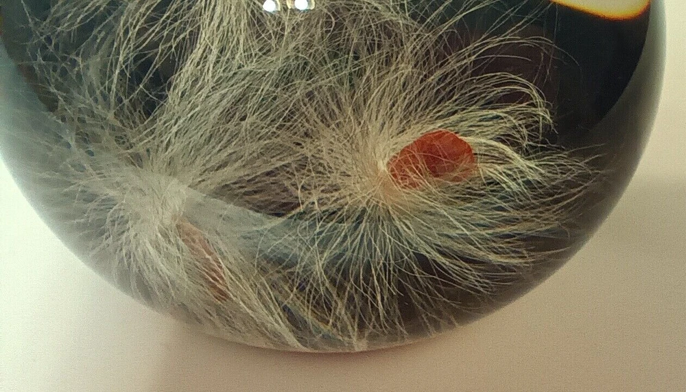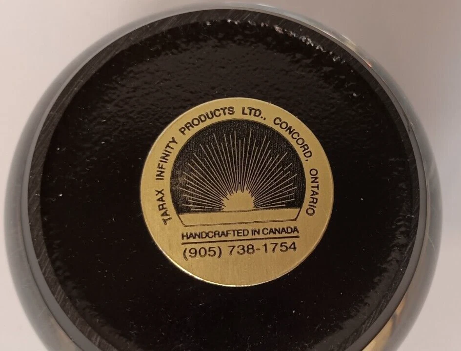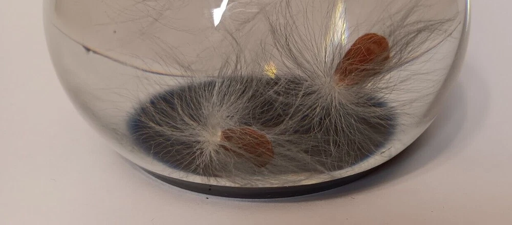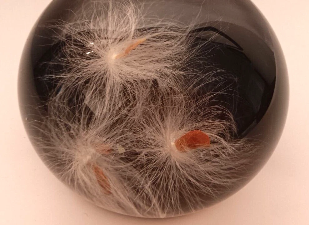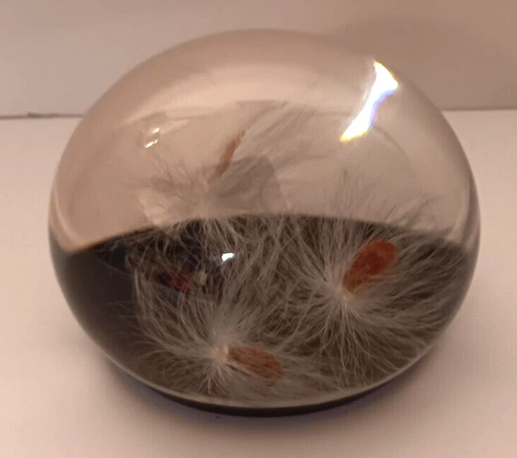 This beautiful paperweight measures 3" in height and 10" in circumference. It is nicely weighted and has milkweed seeds encased inside the acrylic. No chips or scratches; please see all photographs as they are part of the description. Shipped with USPS Ground Mail. F41