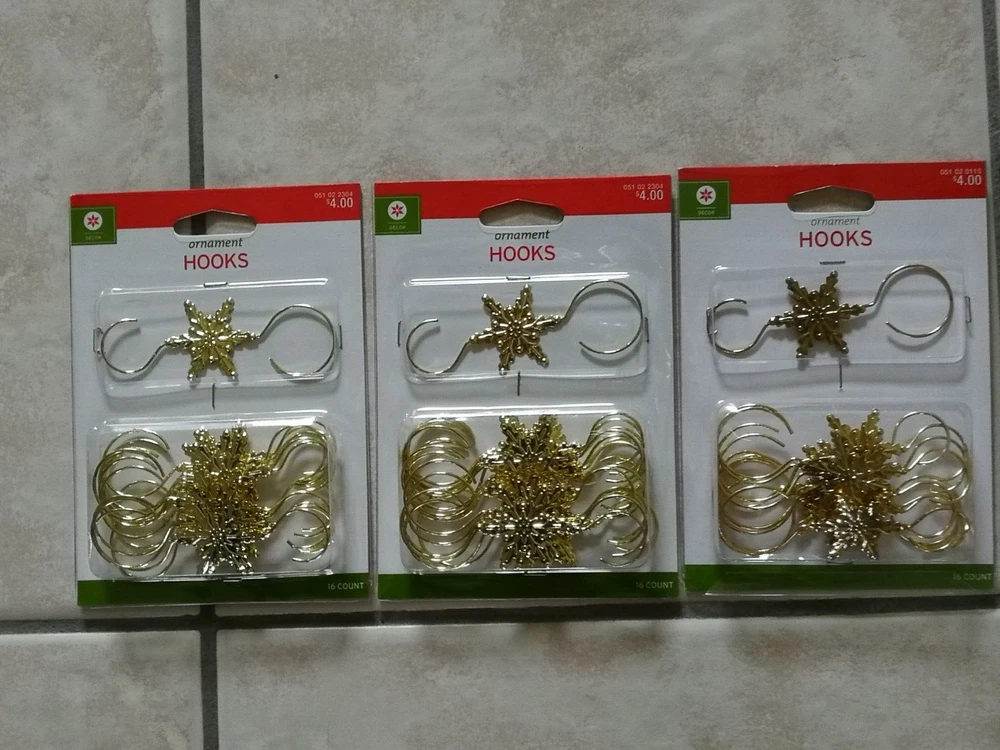 Antique:NoSubject:TreeSize:MediumNumber of Items:16 x 3Vintage:YesMaterial:Metal, WireCountry/Region of Manufacture:ChinaType:Ornament Hooks & HangersTheme:HolidayYear Manufactured:2014Color:Goldgtin13:0088907036469UPC:0088907036469Time Period Manufactured:2014Style:Snow flakeBrand:TargetCollection:OrnamentsFeatures:Decorative, HangingOccasion:Christmas