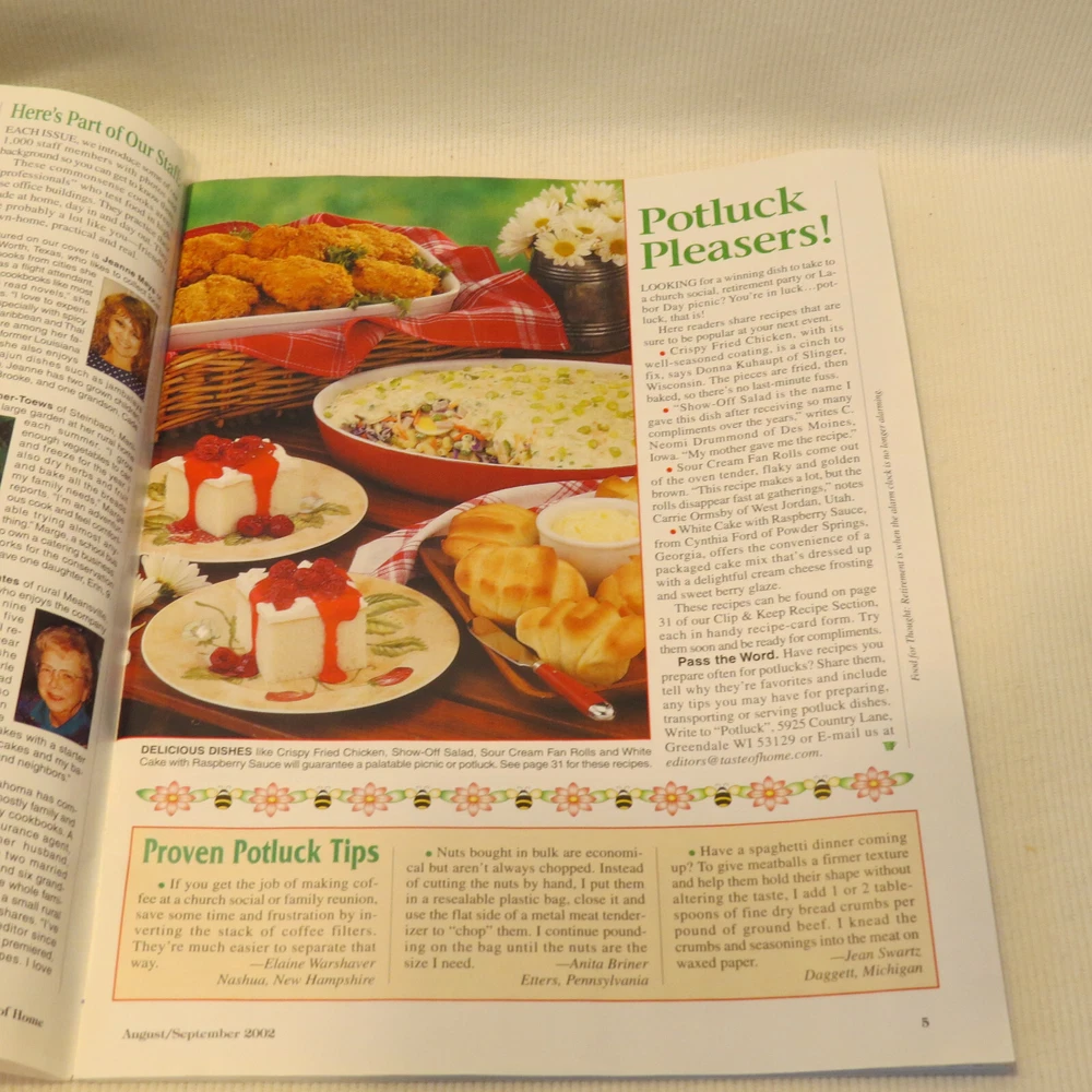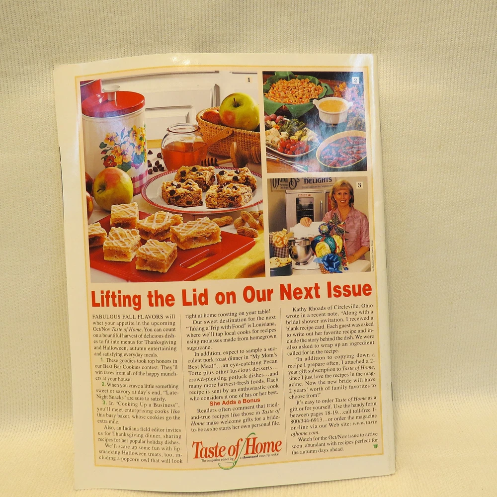 Taste Of Home Aug/Sep 2002 Edited By A Thousand Country Cooks! Collectibles! WOW Taste Of Home August/September 2002 - The Magazine Edited By A Thousand Country Cooks! Great used condition. some wear / shows it has been opened and flipped through, does not distract. Little to no issues. Clean copy. See all pictures. See pictures for details. Ships via USPS. Selling lots more in the store! Be sure to check out our store for even more - with new items coming each week: https://www.ebay.com/str/dishesdogsdreams