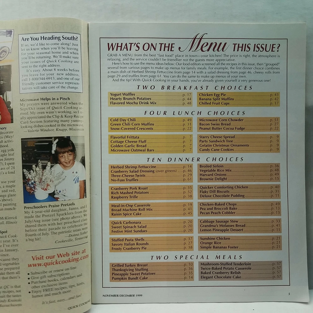 Thanks for shopping the Winchester Mystery Kitchen. Shipped secure with 1 business day handling. If you have questions about the item or special packing/shipping needs please contact us before placing your order so we can make sure we get all the right boxes checked. Taste Of Homes Quick Cooking Magazine November/December 1999 - Rapid Recipes With Homemade Taste - On-the-go Goodies See our photos for the detailed condition of the item. For more information about the item condition please send us a message with the details you want. Photos are generally of the exact item you receiving with the exception of items we have multiple quantity of, so please make sure you take a look before you buy. tgw202101261520471-FF230 tgw-pl::=:: FF230:=:Taste Of Homes Quick Cooking Magazine November/December 1999:=:tgw202101261520471:=:46396:=:tgw202101261520471