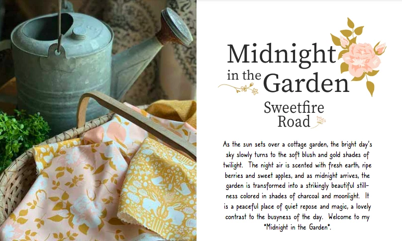 Moda Yardage ~ 100 % cotton 44" wide ~ ALWAYS cut in continuous yardage as per your order MIDNIGHT IN THE GARDEN by Sweetfire Road $12.30 per yard Available Quantity shown above is in 1/2 yard increments To order: For 1/2 yard - put 1 in cart For 1 yard - put 2 in cart For 1 1/2 yard - put 3 in cart, etc. Combined shipping will automatically apply If you want more than what's available, send me a message because I may have more. It is always hard to judge exactly how much is left on a bolt so sometimes there is a little more than what is shown as Available Quantity. Pastry Shop Quilts Where Every order is a gift to yourself Generous Cuts packaged with Great Care Pet Free ~ Smoke Free Environment Always happy to combine shipping. Additional 1/2 yards ship for .50 cents each. Request a combined invoice before paying if you are putting different types of items (yardage & precuts) in the cart.