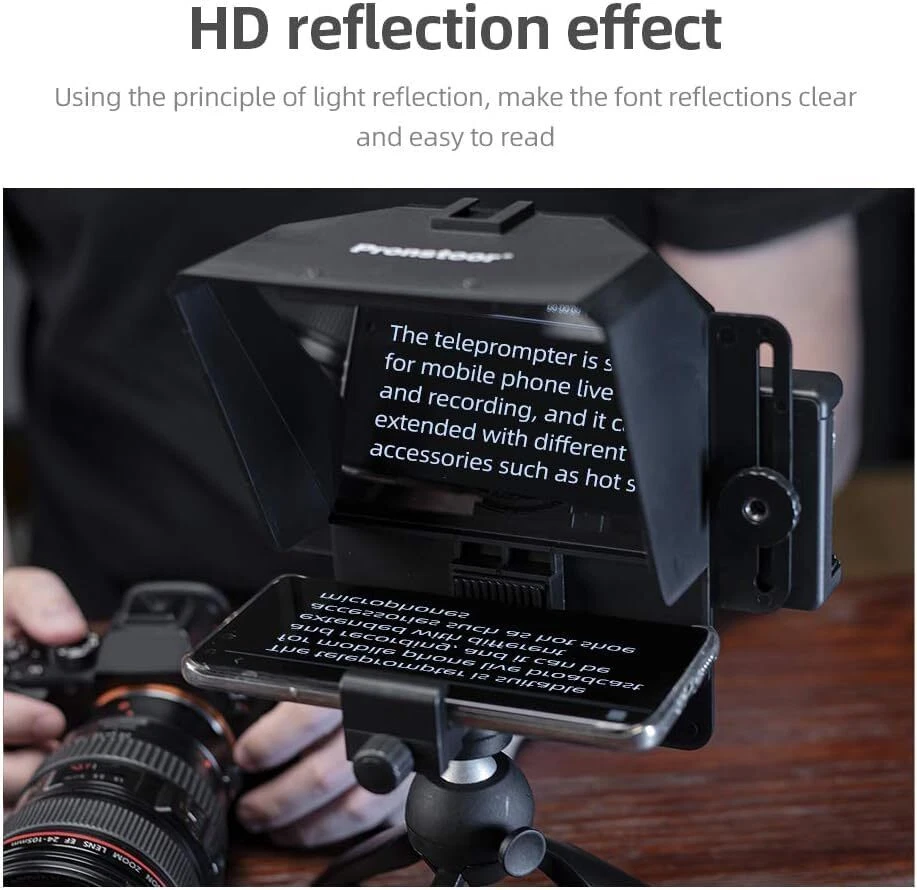 Enhance Your Video Production: Elevate your video production with the 7.5'' Mini Teleprompter. Perfect for live streaming, interviews, online conferences, and short . Say goodbye to retakes and boost your workflow efficiency. Clear and Readable Text: Our teleprompter utilizes advanced light reflection principles, ensuring crystal-clear and easily readable text. It supports wide-angle lenses with a focal length of 35mm or more for versatile shooting. Adapter Rings and Expansion Boards: Included adapter rings and smartphone expansion boards securely hold your and mobile . The clip accommodates devices with a width ranging from 2.2'' to 3.2'', catering to most smartphones. Versatile Tripod Compatibility: The adjustable tabletop tripod, extending from approximately 5.3 inches to 6.7 inches in height, is tailored for live streaming, interviews, and video creation. The teleprompter features a built-in standard 1/4 screw hole, enabling compatibility with desktop tripods, light stands, and more. The integrated cold shoe on top allows you to attach microphones, lights, and other accessories. Compact and Portable: With its 7.5'' mini design, this teleprompter is perfect for DSLR cameras and smartphones. It's a versatile tool that ensures your scripts are always at your fingertips, enhancing your on-performance.