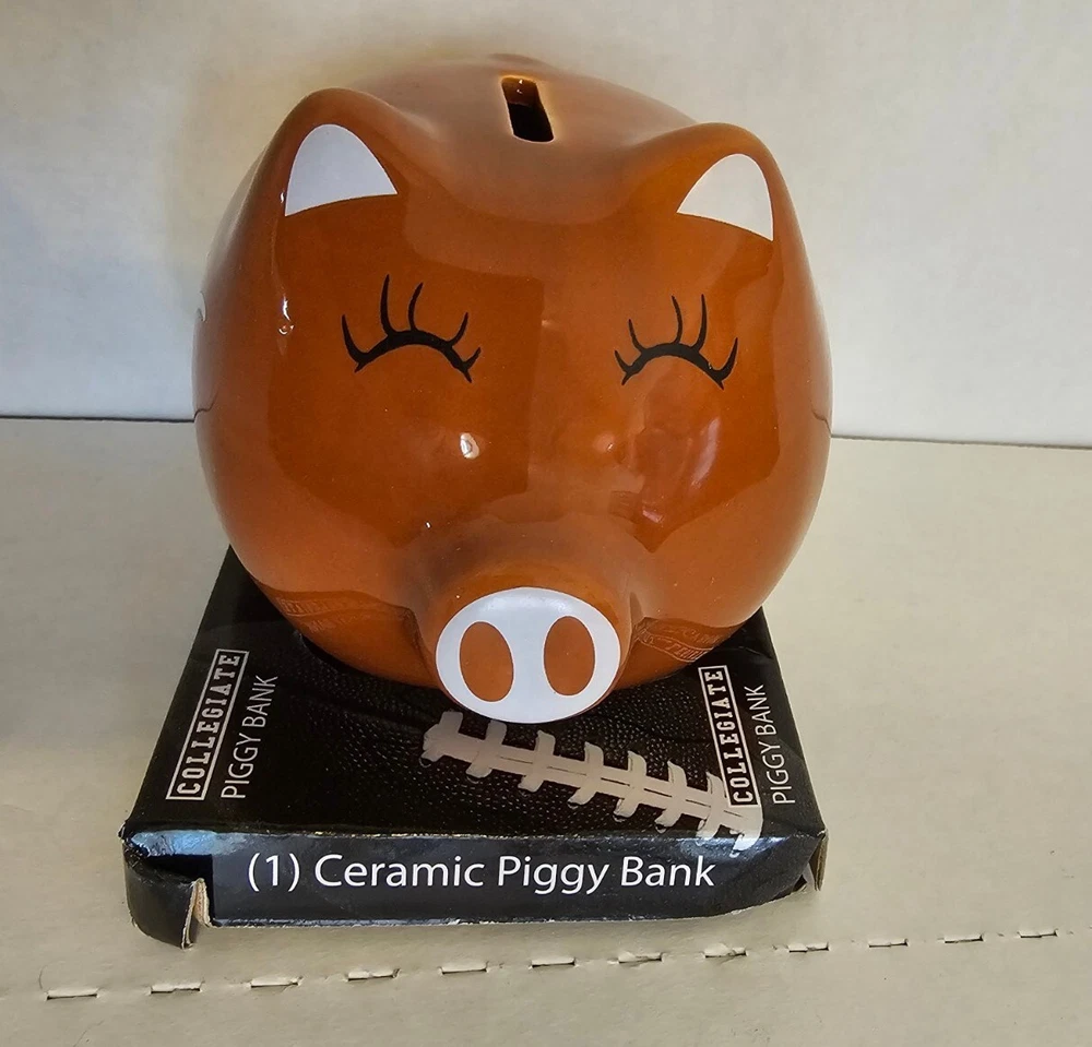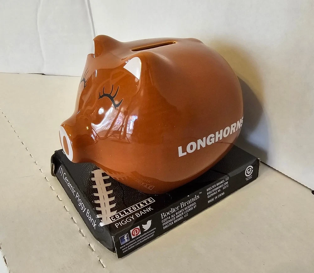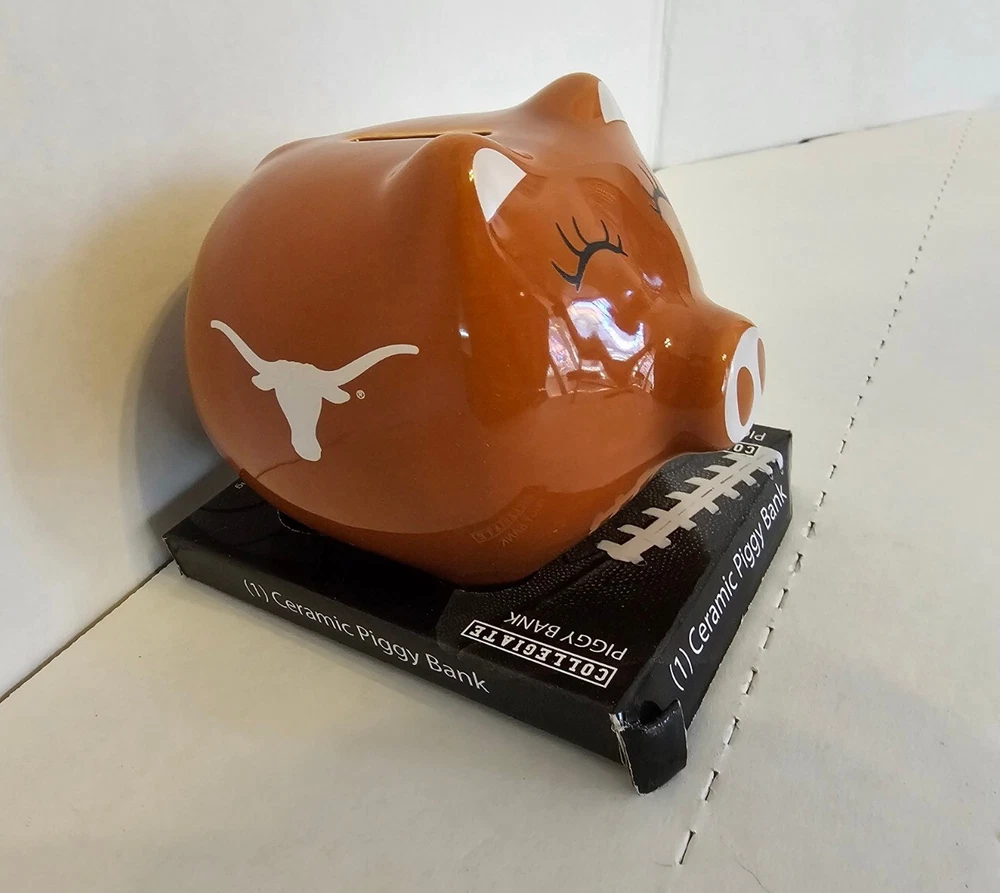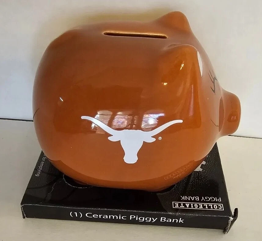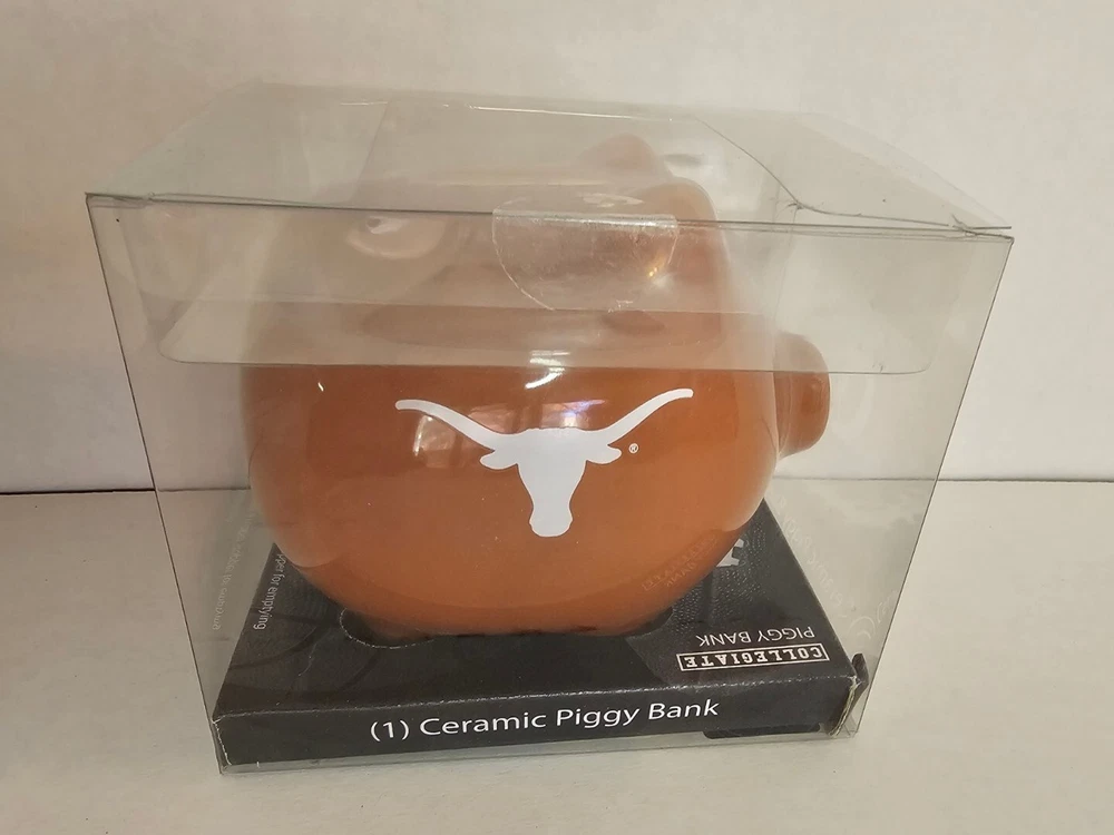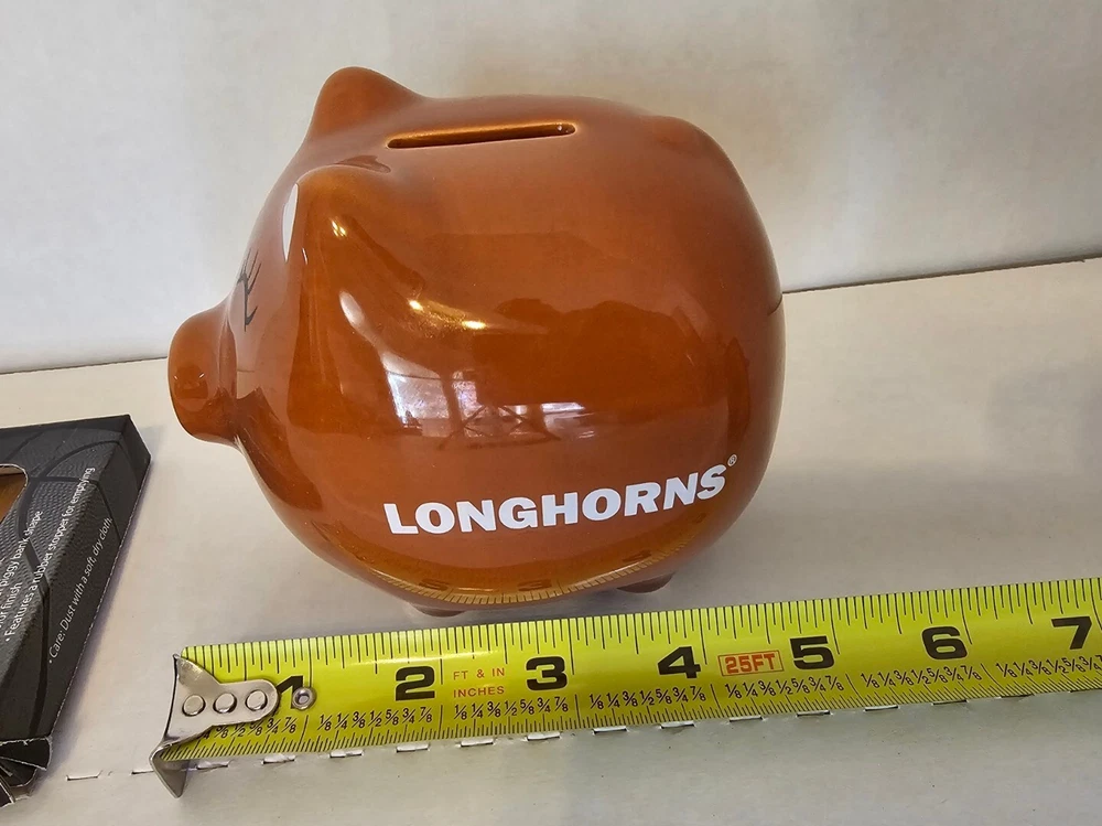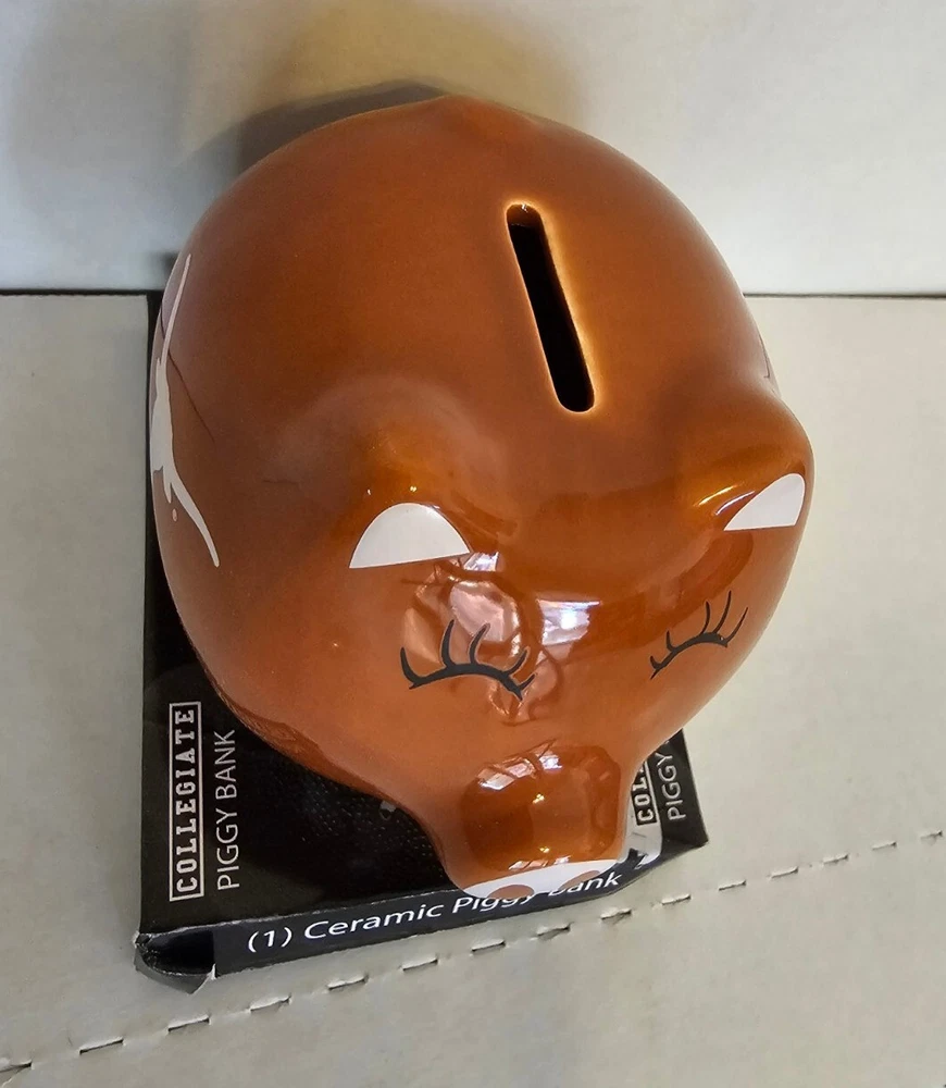 This Texas Longhorn UT fan ceramic slotted piggy bank is perfect for any NCAA fan. Made of high-quality ceramic material, this original and collectible bank is manufactured in China and features a vibrant burnt orange color. The bank is shaped like a cute pig, complete with Texas Longhorn branding, and has a slotted top that makes it easy to insert coins. It's a must-have for any Texas Longhorn fan as they enter the college NCAA football playoffs! A great stocking stuffer or Christmas gift!! Measures 4 1/2" in length and almost 4" tall (approx. 3 3/4"). Box opened to take photos. Will come in original plastic packaging.