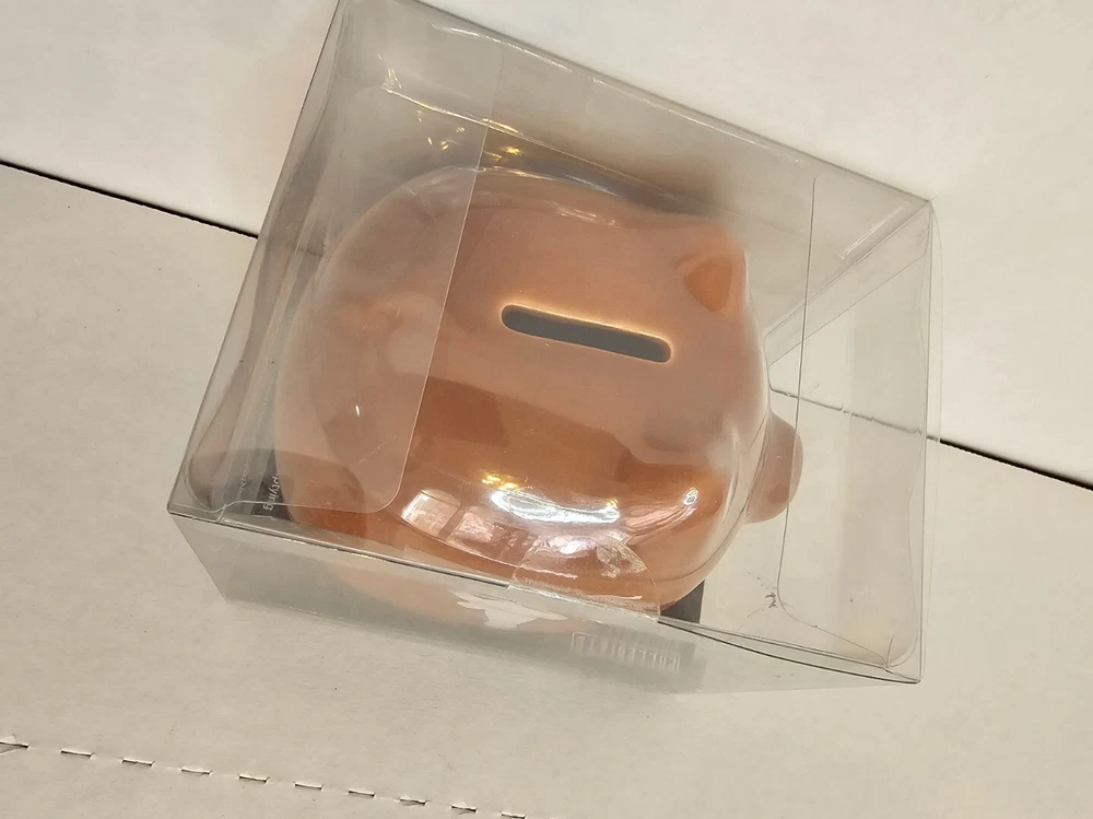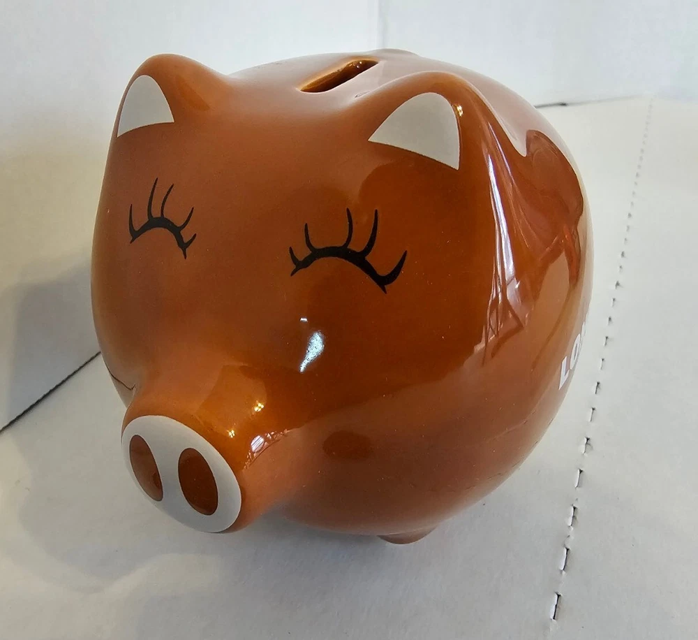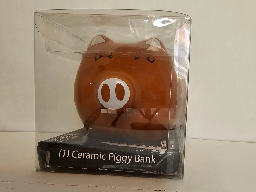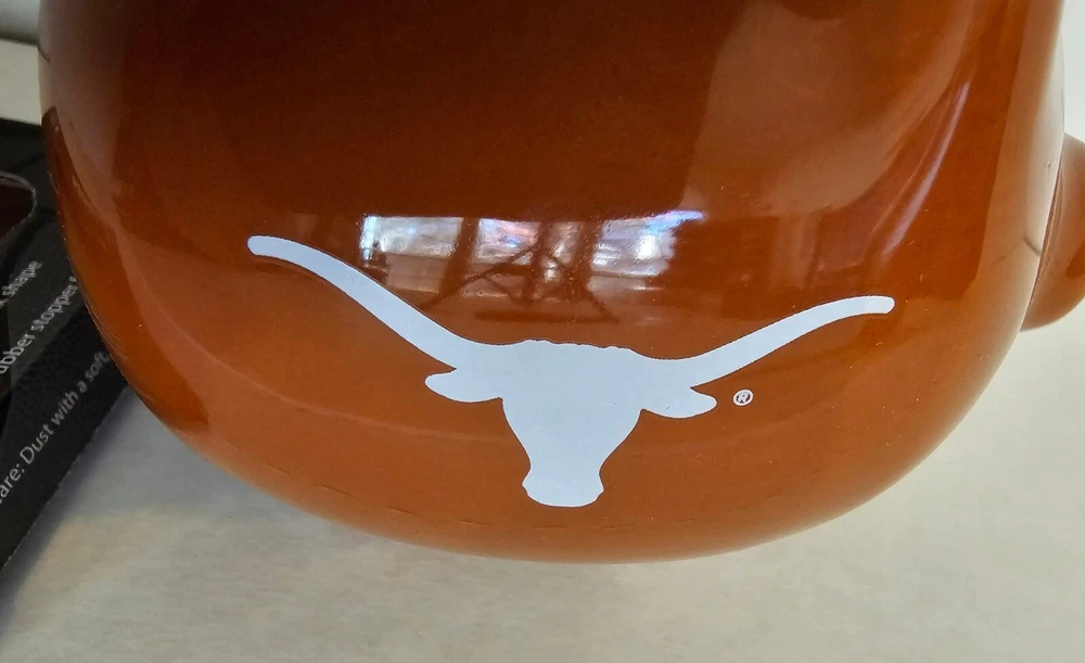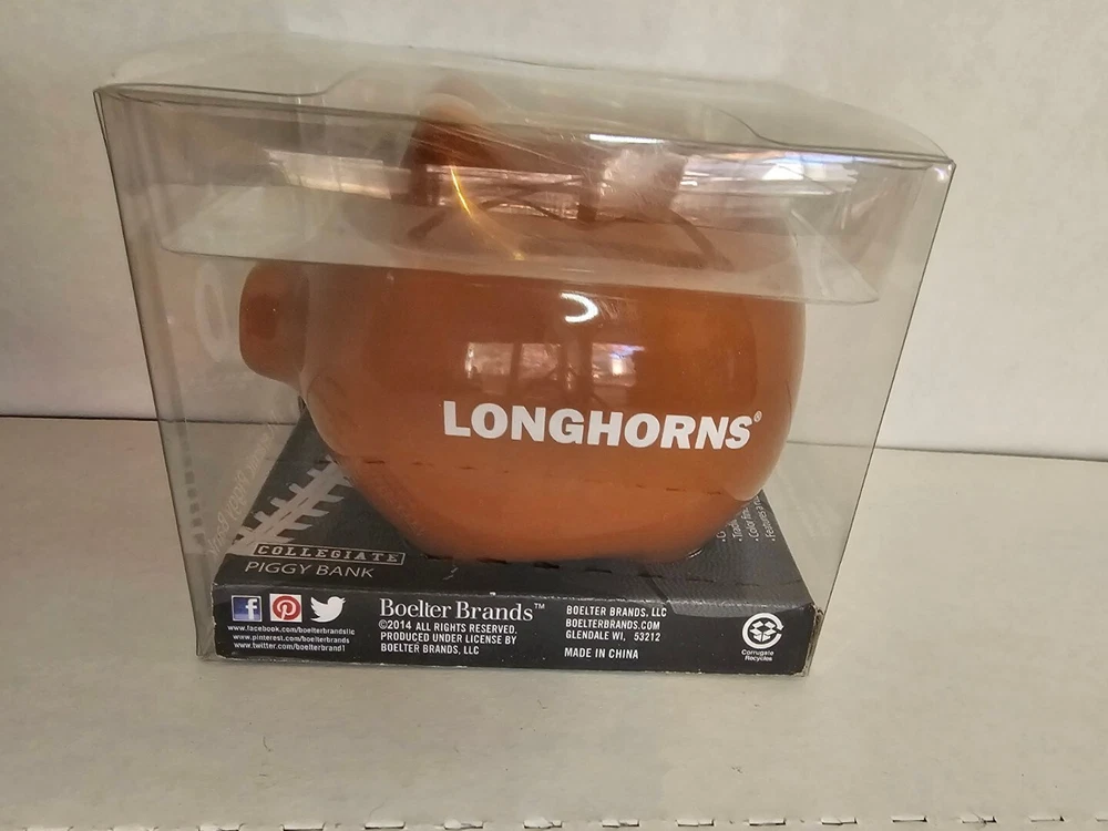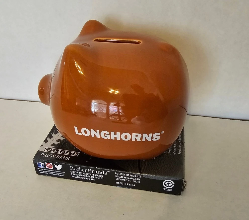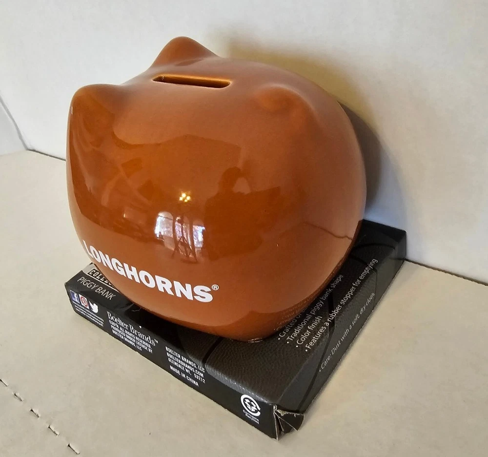 This Texas Longhorn UT fan ceramic slotted piggy bank is perfect for any NCAA fan. Made of high-quality ceramic material, this original and collectible bank is manufactured in China and features a vibrant burnt orange color. The bank is shaped like a cute pig, complete with Texas Longhorn branding, and has a slotted top that makes it easy to insert coins. It's a must-have for any Texas Longhorn fan as they enter the college NCAA football playoffs! A great stocking stuffer or Christmas gift!! Measures 4 1/2" in length and almost 4" tall (approx. 3 3/4"). Box opened to take photos. Will come in original plastic packaging.